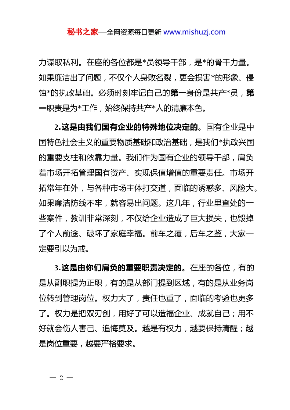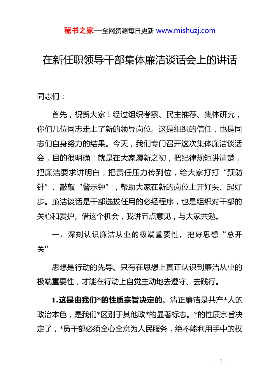 秘书之家—全网资源每日更新 www.mishuzj.com在新任职领导干部集体廉洁谈话会上的讲话同志们:首先,祝贺大家!经过组织考察、民主推荐、集体研究,你们几位同志走上了新的领导岗位。这是组织的信任,也是同志们自身努力的结果。今天,我们专门召开这次集体廉洁谈话会,目的很明确:就是在大家履新之初,把纪律规矩讲清楚,把廉洁要求讲明白,把责任压力传到位,给大家打打“预防针”、敲敲“警示钟”,帮助大家在新的岗位上开好头、起好步。廉洁谈话是干部选拔任用的必经程序,也是组织对干部的关心和爱护。借这个机会,我讲五点意见,与大家共勉。一、深刻认识廉洁从业的极端重要性,把好思想“总开关”思想是行动的先导。只有在思想上真正认识到廉洁从业的极端重要性,才能在行动上自觉主动地去遵守、去践行。1.这是由我们*的性质宗旨决定的。清正廉洁是共产*人的政治本色,是我们*区别于其他政*的显著标志。*的性质宗旨决定了,*员干部必须全心全意为人民服务,绝不能利用手中的权— 1 —秘书之家—全网资源每日更新 www.mishuzj.com力谋取私利。在座的各位都是*员领导干部,是*的骨干力量。如果廉洁出了问题,不仅个人身败名裂,更会损害*的形象、侵蚀*的执政基础。必须时刻牢记自己的第一身份是共产*员,第一职责是为*工作,始终保持共产*人的清廉本色。2.这是由我们国有企业的特殊地位决定的。国有企业是中国特色社会主义的重要物质基础和政治基础,是我们*执政兴国的重要支柱和依靠力量。我们作为国有企业的领导干部,肩负着市场开拓管理国有资产、实现保值增值的重要责任。市场开拓常年在外,与各种市场主体打交道,面临的诱惑多、风险大。如果廉洁防线不牢,就容易出问题。这几年,行业里查处的一些案件,教训非常深刻,不仅给企业造成了巨大损失,也毁掉了个人前途、破坏了家庭幸福。前车之覆,后车之鉴,大家一定要引以为戒。3.这是由你们肩负的重要职责决定的。在座的各位,有的是从副职提为正职,有的是从部门提到区域,有的是从业务岗位转到管理岗位。权力大了,责任也重了,面临的考验也更多了。权力是把双刃剑,用好了可以造福企业、成就自己;用不好就会伤人害己、追悔莫及。越是有权力,越要保持清醒;越是岗位重要,越要严格要求。— 2 —秘书之家—全网资源每日更新 www.mishuzj.com二、清醒认识廉洁从业面临的严峻形势,算好人生“七笔账”当前,全面从严治*向纵深推进,反腐败斗争取得压倒性胜利并全面巩固,但形势依然严峻复杂。我们要时刻保持清醒头脑,深刻认识廉洁从业面临的严峻形势,算好人生的“七笔账”。1.算好政治账,不要自毁前程。大家能够走上今天的岗位,是组织多年培养的结果,也是个人努力奋斗的结果。每一步都来之不易,凝聚着组织的信任、领导的关心、同事的支持。如果因为廉洁问题被查处,不仅政治生命就此终结,还会给组织抹黑、让家人蒙羞。要倍加珍惜组织的信任,倍加珍惜手中的权力,倍加珍惜现在的岗位。要时刻想到,今天的职位是组织给的,是用于干事创业的平台,绝不是谋取私利的工具。要清清白白做人、干干净净做事,不要因为一时的糊涂,葬送自己的政治前途。2.算好经济账,不要贪小失大。我们现在的待遇虽然比不上那些大老板,但也足以保障体面的生活。如果因为贪图不义之财,最后锒铛入狱,不仅这些钱要被追缴,连正常的工资待遇、退休保障都会失去。这笔账算下来,得不偿失。要知足常— 3 —秘书之家—全网资源每日更新 www.mishuzj.com乐,珍惜现在拥有的。要明白,君子爱财取之有道,只有靠合法收入、正当途径获得的财富,才能用得安心、睡得踏实。3.算好名誉账,不要身败名裂。古人讲,一丝一粒,我之名节;一厘一毫,民之脂膏。宽一分,民受赐不止一分;取一文,我为人不值一文。这些古训告诉我们,名誉是第二生命,一旦失去,再难挽回。大家能够走上领导岗位,都是经过组织多年考察、群众公认的。如果因为廉洁问题被查处,不仅个人名誉扫地,还会成为反面教材,被人在背后指指点点。要像爱护眼睛一样爱护自己的名声,始终保持清正廉洁的良好形象。4.算好家庭账,不要妻离子散。一人不廉,全家不圆。很多落马...