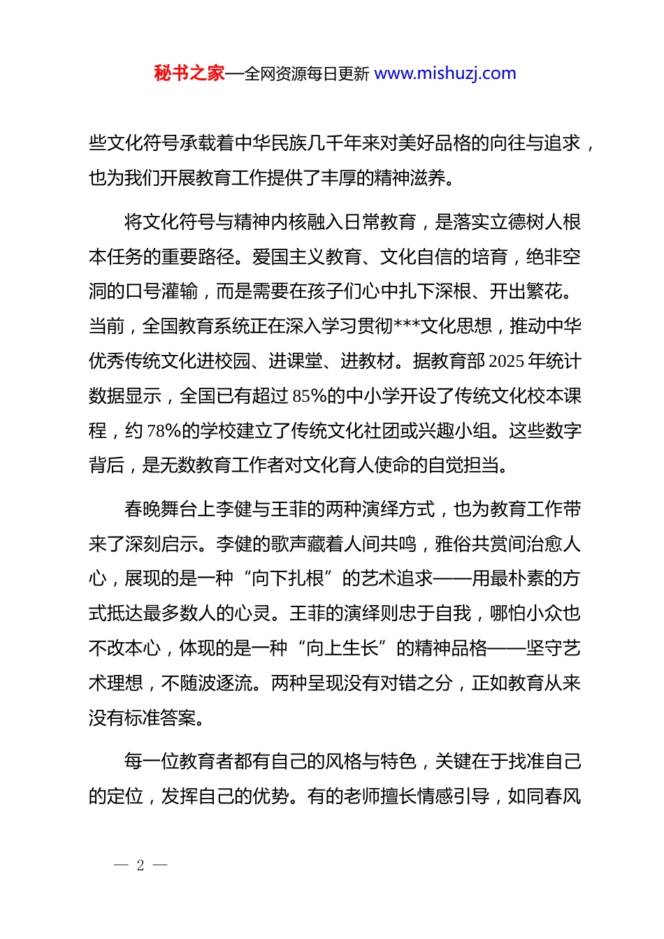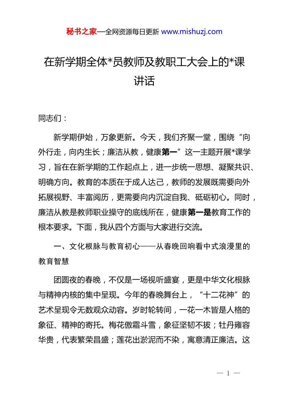 秘书之家—全网资源每日更新 www.mishuzj.com在新学期全体*员教师及教职工大会上的*课讲话同志们:新学期伊始,万象更新。今天,我们齐聚一堂,围绕“向外行走,向内生长;廉洁从教,健康第一”这一主题开展*课学习,旨在在新学期的工作起点上,进一步统一思想、凝聚共识、明确方向。教育的本质在于成人达己,教师的发展既需要向外拓展视野、丰富阅历,更需要向内沉淀自我、砥砺初心。同时,廉洁从教是教师职业操守的底线所在,健康第一是教育工作的根本要求。下面,我从四个方面与大家进行交流。一、文化根脉与教育初心——从春晚回响看中式浪漫里的教育智慧团圆夜的春晚,不仅是一场视听盛宴,更是中华文化根脉与精神内核的集中呈现。今年的春晚舞台上,“十二花神”的艺术呈现令无数观众动容。岁时轮转间,一花一木皆是人格的象征、精神的寄托。梅花傲霜斗雪,象征坚韧不拔;牡丹雍容华贵,代表繁荣昌盛;莲花出淤泥而不染,寓意清正廉洁。这— 1 —秘书之家—全网资源每日更新 www.mishuzj.com些文化符号承载着中华民族几千年来对美好品格的向往与追求,也为我们开展教育工作提供了丰厚的精神滋养。将文化符号与精神内核融入日常教育,是落实立德树人根本任务的重要路径。爱国主义教育、文化自信的培育,绝非空洞的口号灌输,而是需要在孩子们心中扎下深根、开出繁花。当前,全国教育系统正在深入学习贯彻***文化思想,推动中华优秀传统文化进校园、进课堂、进教材。据教育部 2025 年统计数据显示,全国已有超过 85%的中小学开设了传统文化校本课程,约 78%的学校建立了传统文化社团或兴趣小组。这些数字背后,是无数教育工作者对文化育人使命的自觉担当。春晚舞台上李健与王菲的两种演绎方式,也为教育工作带来了深刻启示。李健的歌声藏着人间共鸣,雅俗共赏间治愈人心,展现的是一种“向下扎根”的艺术追求——用最朴素的方式抵达最多数人的心灵。王菲的演绎则忠于自我,哪怕小众也不改本心,体现的是一种“向上生长”的精神品格——坚守艺术理想,不随波逐流。两种呈现没有对错之分,正如教育从来没有标准答案。每一位教育者都有自己的风格与特色,关键在于找准自己的定位,发挥自己的优势。有的老师擅长情感引导,如同春风— 2 —秘书之家—全网资源每日更新 www.mishuzj.com化雨般润泽学生心灵;有的老师长于知识传授,如同高山流水般启迪学生智慧。教育者的专业底气,从来不是来自外界的评价,而是源于对孩子的真诚、对专业的钻研、对教育的理解。在座的每一位同志,都应该深入思考:我的教育风格是什么?我如何在教育实践中坚守自己的教育理想?文化的传承与教育的坚守,最终指向的是育人初心。******强调,教师要成为大先生,做学生为学、为事、为人的示范。这要求我们不仅要有扎实的学识,更要有深厚的文化底蕴和高尚的道德情操。文化自信是更基本、更深沉、更持久的力量,我们作为教育工作者,肩负着播撒文化种子、传承文明火种的重任,必须以更高的标准要求自己,以更深的情怀投身事业。二、山海行走与教育洞见——在实践中拓宽视野、深化认知读万卷书,行万里路。真正的视野打开,既要走向远方看宏观的世界,也要蹲下来走进儿童微小却宏大的内心宇宙。外出旅行是横向拓展生命的视野,理解儿童是纵向挖掘教育的深度。唯有既看见世界的辽阔,也蹲下来看见孩子的内心,才能真正读懂教育的本质。— 3 —秘书之家—全网资源每日更新 www.mishuzj.com我们学校的三位老师在寒假期间的旅途见闻,蕴含着丰富的教育智慧。**老师在**角的经历令人深思。初到时,浓雾弥漫,连眼前景致都难见分晓,令人心生失望。然而,短短五分钟内,狂风骤起,浓雾如幕布般骤然拉开,天空、灯塔、草坡与远方海岸线瞬间清晰铺展,在场所有人忍不住欢呼相拥。这一幕,恰如教育过程中的许多不可预测时刻——我们常常看不清前方的全景,不知道孩子们会在哪个路口迷失,会在哪个时刻顿悟。但正如那座始终矗立的灯塔,教育工作者的使命是在每一次出发与守候中,静待花开、守望惊喜。不必强求时刻都能看清远方的全景,只需专注当下的每一刻,倾听儿童的表达,记录儿童的发现,陪伴儿童...