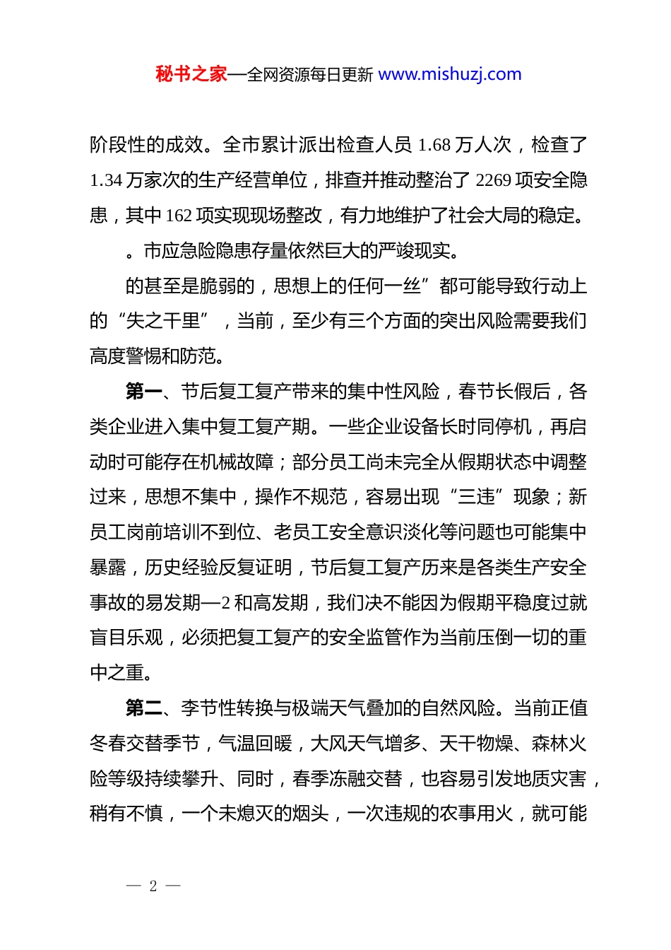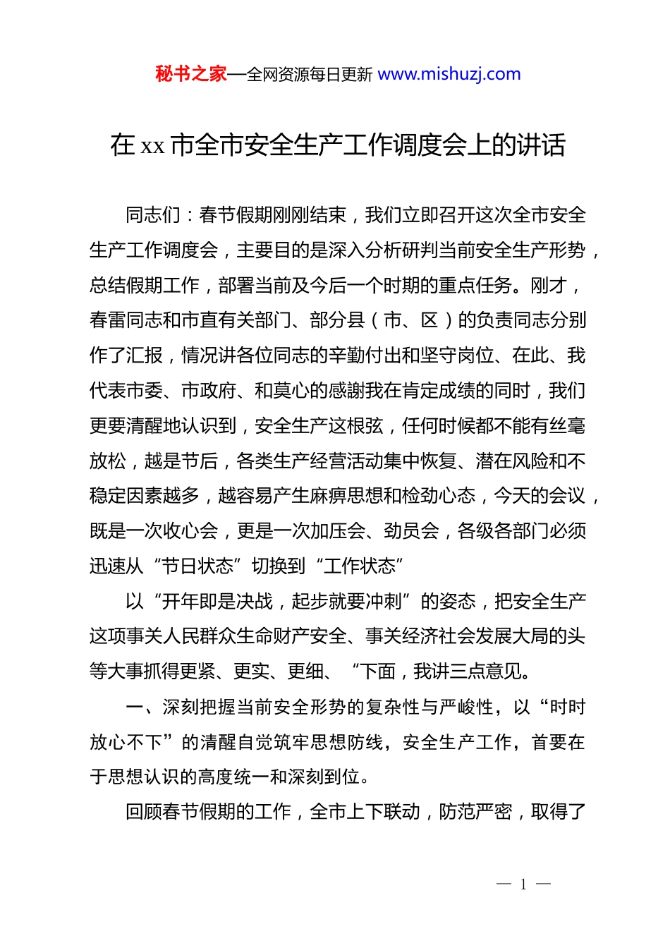 秘书之家—全网资源每日更新 www.mishuzj.com在 xx 市全市安全生产工作调度会上的讲话同志们:春节假期刚刚结束,我们立即召开这次全市安全生产工作调度会,主要目的是深入分析研判当前安全生产形势,总结假期工作,部署当前及今后一个时期的重点任务。刚才,春雷同志和市直有关部门、部分县(市、区)的负责同志分别作了汇报,情况讲各位同志的辛勤付出和坚守岗位、在此、我代表市委、市政府、和莫心的感謝我在肯定成绩的同时,我们更要清醒地认识到,安全生产这根弦,任何时候都不能有丝毫放松,越是节后,各类生产经营活动集中恢复、潜在风险和不稳定因素越多,越容易产生麻痹思想和检劲心态,今天的会议,既是一次收心会,更是一次加压会、劲员会,各级各部门必须迅速从“节日状态”切换到“工作状态”以“开年即是决战,起步就要冲刺”的姿态,把安全生产这项事关人民群众生命财产安全、事关经济社会发展大局的头等大事抓得更紧、更实、更细、“下面,我讲三点意见。一、深刻把握当前安全形势的复杂性与严峻性,以“时时放心不下”的清醒自觉筑牢思想防线,安全生产工作,首要在于思想认识的高度统一和深刻到位。回顾春节假期的工作,全市上下联动,防范严密,取得了— 1 —秘书之家—全网资源每日更新 www.mishuzj.com阶段性的成效。全市累计派出检查人员 1.68 万人次,检查了1.34 万家次的生产经营单位,排查并推动整治了 2269 项安全隐患,其中 162 项实现现场整改,有力地维护了社会大局的稳定。。市应急险隐患存量依然巨大的严竣现实。的甚至是脆弱的,思想上的任何一丝”都可能导致行动上的“失之干里”,当前,至少有三个方面的突出风险需要我们高度警惕和防范。第一、节后复工复产带来的集中性风险,春节长假后,各类企业进入集中复工复产期。一些企业设备长时同停机,再启动时可能存在机械故障;部分员工尚未完全从假期状态中调整过来,思想不集中,操作不规范,容易出现“三违”现象;新员工岗前培训不到位、老员工安全意识淡化等问题也可能集中暴露,历史经验反复证明,节后复工复产历来是各类生产安全事故的易发期—2 和高发期,我们决不能因为假期平稳度过就盲目乐观,必须把复工复产的安全监管作为当前压倒一切的重中之重。第二、李节性转换与极端天气叠加的自然风险。当前正值冬春交替季节,气温回暖,大风天气增多、天干物燥、森林火险等级持续攀升、同时,春季冻融交替,也容易引发地质灾害,稍有不慎,一个未熄灭的烟头,一次违规的农事用火,就可能— 2 —秘书之家—全网资源每日更新 www.mishuzj.com酿成无法挽回的森林火灾、各级各部门,特别是林业、自然资源等部门和山区县(市、区),必须对森林防灭火工作保持最高等级的警惕,坚决守住山、,看住人、管住火。等传统高危行业领域的风险依然是我们的心腹大惠,从春节期新模式的不断涌现。一些非传统领城的安全风险也日益凸显、例如文放活动中的大型聚集、新能源领城的储能安全等,这些都对我们的监管能力提出了新的、更高的要求、面对这些凤险级领要切实和底线思维,坚决克服“年关已过,万事大苦”的麻痱思想,必须产格落实安全生产十条措施”的刚性要求,将其作为我们工作的根本遵循和行动指南。同时,要深入践行“知责、履责、担责、尽责”的工作要求,把“时时放心不下”的责任感,真正转化为“事事心中有底”的行动力,确保安全生产责任链条环环相扣、无缝对接。二、坚持问题导向与目标导向相结合,以“全覆盖、零容忍”的坚定决心根除风险隐惠安全生产工作。来不得半点花架子,必须动真格见实效核心就是要抓好风险隐患的排查和治理,隐患险于明火,防范胜于教灾,如果不能把隐患当成事故来对待,那么事故的发生只是时间问题。下一步,必须坚持“全覆盖、零容忍、严执法、重实效”的原则,打一场深入、持久的风险隐患歼灭战。— 3 —秘书之家—全网资源每日更新 www.mishuzj.com第一排查整治要突出一个“深”宇,隐患排查不能浮于表面,不能满足于查了多少家、出了多少份报告。要真正沉下去,深入到生产车间、施工现场、操作台前,用“显微镜”去查找问题、要聚焦重点领域,...