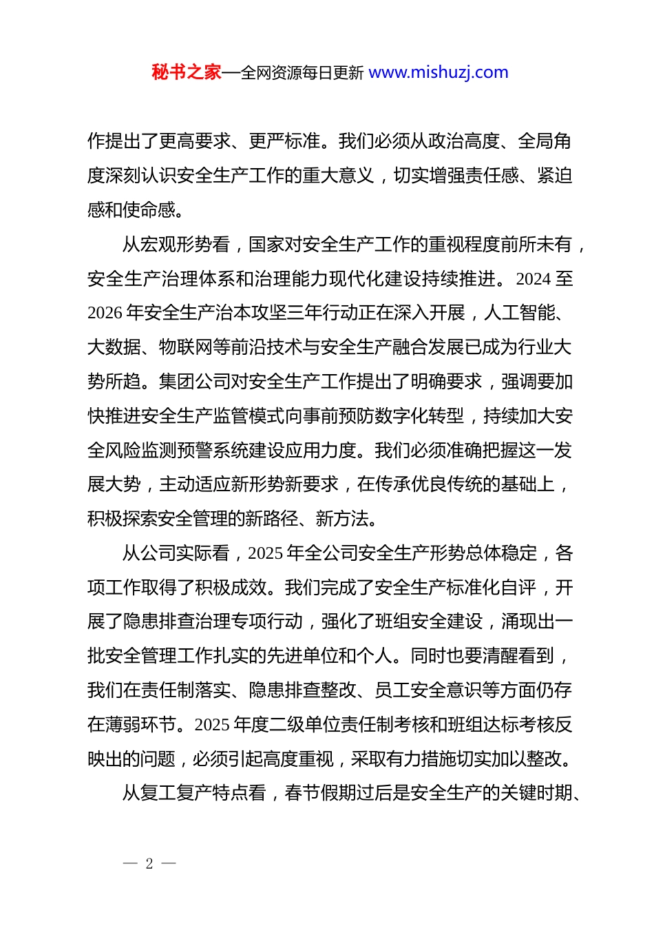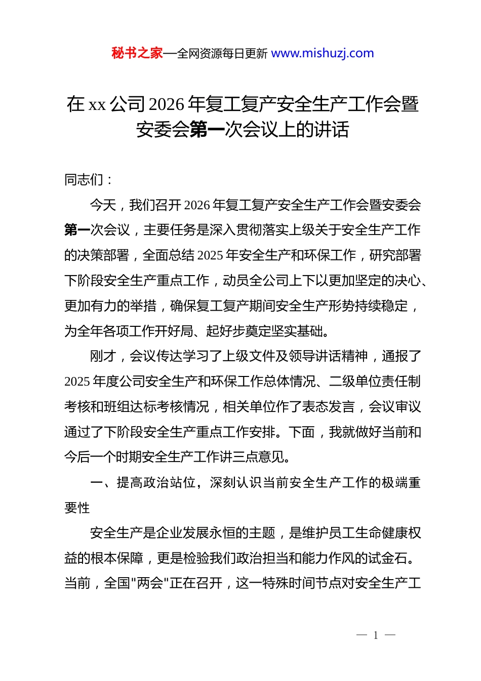 秘书之家—全网资源每日更新 www.mishuzj.com在 xx 公司 2026 年复工复产安全生产工作会暨安委会第一次会议上的讲话同志们:今天,我们召开 2026 年复工复产安全生产工作会暨安委会第一次会议,主要任务是深入贯彻落实上级关于安全生产工作的决策部署,全面总结 2025 年安全生产和环保工作,研究部署下阶段安全生产重点工作,动员全公司上下以更加坚定的决心、更加有力的举措,确保复工复产期间安全生产形势持续稳定,为全年各项工作开好局、起好步奠定坚实基础。刚才,会议传达学习了上级文件及领导讲话精神,通报了2025 年度公司安全生产和环保工作总体情况、二级单位责任制考核和班组达标考核情况,相关单位作了表态发言,会议审议通过了下阶段安全生产重点工作安排。下面,我就做好当前和今后一个时期安全生产工作讲三点意见。一、提高政治站位,深刻认识当前安全生产工作的极端重要性安全生产是企业发展永恒的主题,是维护员工生命健康权益的根本保障,更是检验我们政治担当和能力作风的试金石。当前,全国"两会"正在召开,这一特殊时间节点对安全生产工— 1 —秘书之家—全网资源每日更新 www.mishuzj.com作提出了更高要求、更严标准。我们必须从政治高度、全局角度深刻认识安全生产工作的重大意义,切实增强责任感、紧迫感和使命感。从宏观形势看,国家对安全生产工作的重视程度前所未有,安全生产治理体系和治理能力现代化建设持续推进。2024 至2026 年安全生产治本攻坚三年行动正在深入开展,人工智能、大数据、物联网等前沿技术与安全生产融合发展已成为行业大势所趋。集团公司对安全生产工作提出了明确要求,强调要加快推进安全生产监管模式向事前预防数字化转型,持续加大安全风险监测预警系统建设应用力度。我们必须准确把握这一发展大势,主动适应新形势新要求,在传承优良传统的基础上,积极探索安全管理的新路径、新方法。从公司实际看,2025 年全公司安全生产形势总体稳定,各项工作取得了积极成效。我们完成了安全生产标准化自评,开展了隐患排查治理专项行动,强化了班组安全建设,涌现出一批安全管理工作扎实的先进单位和个人。同时也要清醒看到,我们在责任制落实、隐患排查整改、员工安全意识等方面仍存在薄弱环节。2025 年度二级单位责任制考核和班组达标考核反映出的问题,必须引起高度重视,采取有力措施切实加以整改。从复工复产特点看,春节假期过后是安全生产的关键时期、— 2 —秘书之家—全网资源每日更新 www.mishuzj.com敏感时期。部分员工思想松懈、注意力不集中,设备设施经过停运后重新启动可能存在安全隐患,生产秩序正在恢复过程中容易出现管理盲区。历史经验表明,复工复产期间是事故易发多发期,必须保持高度警惕,坚决克服麻痹思想、侥幸心理和松劲心态。各单位领导干部必须牢固树立"人命关天、安全第一"的理念,深入践行"安全第一、预防为主、综合治理"的方针,始终将安全生产放在首位,做到实事求是、依法按章,坚决守住安全生产底线,确保不发生任何安全事故。二、聚焦重点任务,扎实推进复工复产安全生产工作做好复工复产安全生产工作,既要统筹兼顾、全面推进,又要抓住关键、重点突破。当前要重点抓好以下几个方面工作。第一,认真落实复工复产安全五方面工作。一是谈心谈话守安全。各单位主要负责人要亲自开展一次全员谈心谈话,了解员工思想动态,疏导心理压力,强化安全意识,特别是对关键岗位人员、新入职员工、转岗员工要逐一进行谈话提醒。二是教育培训促安全。要制定复工复产专项培训方案,重点开展岗位操作规程、应急处置措施、典型案例警示等内容的培训教育,确保培训时间、内容、人员、效果四落实。三是开好安全班前会。复工复产第一周,各班组必须每天召开班前安全会,— 3 —秘书之家—全网资源每日更新 www.mishuzj.com明确当日作业风险点、防范措施和注意事项,做到班班有布置、事事有交代。四是做好安全大检查。按照全覆盖、无死角的要求,对生产作业现场、设备设施、作业环境、安全防护等进行全面检查,发现问题立行立改,一时难以整改的必须落实临时防护措施。五是应急能力再确认。对应急...
