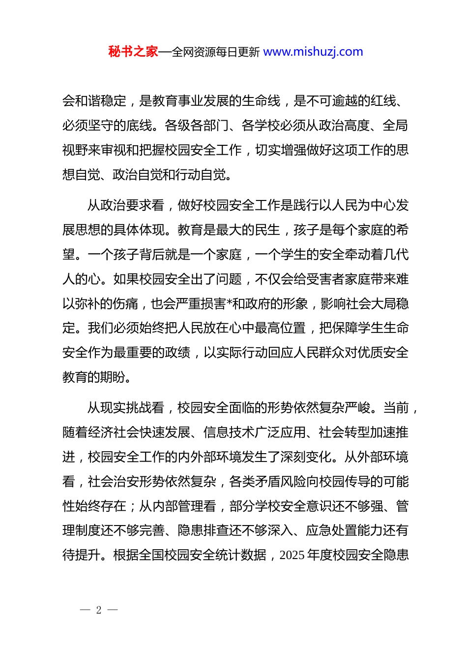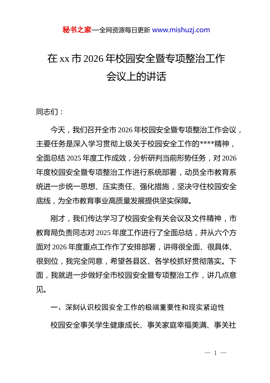 秘书之家—全网资源每日更新 www.mishuzj.com在 xx 市 2026 年校园安全暨专项整治工作会议上的讲话同志们:今天,我们召开全市 2026 年校园安全暨专项整治工作会议,主要任务是深入学习贯彻上级关于校园安全工作的****精神,全面总结 2025 年度工作成效,分析研判当前形势任务,对 2026年度校园安全暨专项整治工作进行系统部署,动员全市教育系统进一步统一思想、压实责任、强化措施,坚决守住校园安全底线,为全市教育事业高质量发展提供坚实保障。刚才,我们传达学习了校园安全有关会议及文件精神,市教育局负责同志对 2025 年度工作进行了全面总结,并从六个方面对 2026 年度重点工作作了安排部署,讲得很全面、很具体、很到位,我完全同意,希望各县区、各学校抓好贯彻落实。下面,我就进一步做好全市校园安全暨专项整治工作,讲几点意见。一、深刻认识校园安全工作的极端重要性和现实紧迫性校园安全事关学生健康成长、事关家庭幸福美满、事关社— 1 —秘书之家—全网资源每日更新 www.mishuzj.com会和谐稳定,是教育事业发展的生命线,是不可逾越的红线、必须坚守的底线。各级各部门、各学校必须从政治高度、全局视野来审视和把握校园安全工作,切实增强做好这项工作的思想自觉、政治自觉和行动自觉。从政治要求看,做好校园安全工作是践行以人民为中心发展思想的具体体现。教育是最大的民生,孩子是每个家庭的希望。一个孩子背后就是一个家庭,一个学生的安全牵动着几代人的心。如果校园安全出了问题,不仅会给受害者家庭带来难以弥补的伤痛,也会严重损害*和政府的形象,影响社会大局稳定。我们必须始终把人民放在心中最高位置,把保障学生生命安全作为最重要的政绩,以实际行动回应人民群众对优质安全教育的期盼。从现实挑战看,校园安全面临的形势依然复杂严峻。当前,随着经济社会快速发展、信息技术广泛应用、社会转型加速推进,校园安全工作的内外部环境发生了深刻变化。从外部环境看,社会治安形势依然复杂,各类矛盾风险向校园传导的可能性始终存在;从内部管理看,部分学校安全意识还不够强、管理制度还不够完善、隐患排查还不够深入、应急处置能力还有待提升。根据全国校园安全统计数据,2025 年度校园安全隐患— 2 —秘书之家—全网资源每日更新 www.mishuzj.com排查整治工作中,部分地区累计排查各类安全隐患数百处,其中一般隐患占绝大多数,但较大隐患也占有一定比例,这说明我们的工作还有短板弱项,必须时刻保持清醒头脑,坚决克服麻痹思想、厌战情绪、侥幸心理、松劲心态。从发展需求看,高质量教育体系建设离不开高水平安全保障。当前,我们正处于建设教育强市的关键时期,教育改革发展各项任务繁重艰巨。如果校园安全这个基础打不牢,其他工作就无从谈起。我们必须统筹发展和安全两件大事,把校园安全贯穿于教育改革发展全过程各方面,以高质量安全保障高质量发展。二、充分肯定 2025 年度校园安全暨专项整治工作取得的积极成效2025 年,在市委、市政府坚强领导下,全市教育系统坚持把校园安全工作摆在突出位置,扎实推进专项整治行动,各项工作取得了阶段性成效。一是安全责任体系不断完善。建立健全了"*政同责、一岗双责、齐抓共管、失职追责"的安全责任体系,层层签订安全责任书,明确责任清单,压实属地管理责任、部门监管责任、学— 3 —秘书之家—全网资源每日更新 www.mishuzj.com校主体责任和家庭监护责任,形成了横向到边、纵向到底的责任网络。各级各类学校普遍建立了安全工作领导机构,配备了专兼职安全管理人员,安全管理工作逐步规范化、制度化。二是隐患排查整治扎实推进。坚持问题导向,深入开展校园安全隐患排查整治专项行动,聚焦消防安全、食品安全、校车安全、校园欺凌防治、校园周边环境治理等重点领域,开展拉网式排查,建立隐患台账,实行销号管理。2025 年度,全市教育系统累计组织开展安全排查整治行动多轮次,督促整治安全隐患数百条,整改完成率保持在较高水平,一批影响校园安全的突出问题得到有效解决。三是安防体系建设持续加强。大力推进"智慧安防"进校园,完善校园视频监控系统、一键报警装...