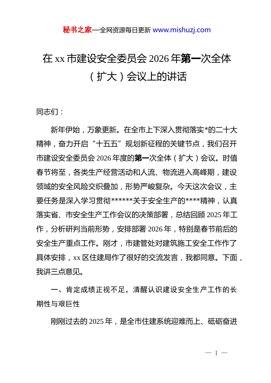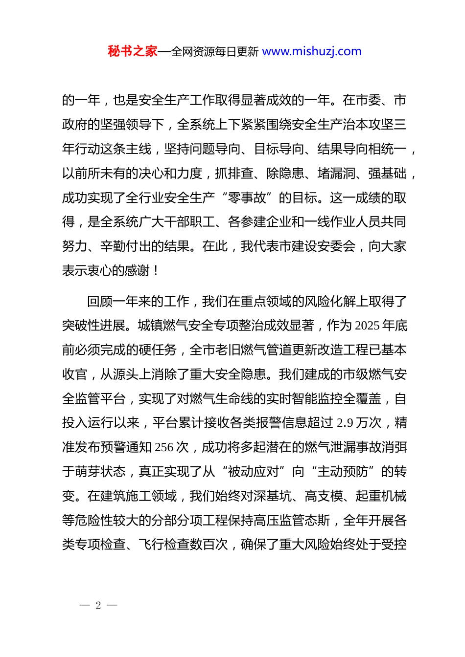 秘书之家—全网资源每日更新 www.mishuzj.com在 xx 市建设安全委员会 2026 年第一次全体(扩大)会议上的讲话同志们:新年伊始,万象更新。在全市上下深入贯彻落实*的二十大精神,奋力开启“十五五”规划新征程的关键节点,我们召开市建设安全委员会 2026 年度的第一次全体(扩大)会议。时值春节将至,各类生产经营活动和人流、物流进入高峰期,建设领域的安全风险交织叠加,形势严峻复杂。今天这次会议,主要任务是深入学习贯彻******关于安全生产的****精神,认真落实省、市安全生产工作会议的决策部署,总结回顾 2025 年工作,分析研判当前形势,安排部署 2026 年,特别是春节前后的安全生产重点工作。刚才,市建管处对建筑施工安全工作作了具体安排,xx 区住建局作了很好的交流发言,我都同意。下面,我讲三点意见。一、肯定成绩正视不足,清醒认识建设安全生产工作的长期性与艰巨性刚刚过去的 2025 年,是全市住建系统迎难而上、砥砺奋进— 1 —秘书之家—全网资源每日更新 www.mishuzj.com的一年,也是安全生产工作取得显著成效的一年。在市委、市政府的坚强领导下,全系统上下紧紧围绕安全生产治本攻坚三年行动这条主线,坚持问题导向、目标导向、结果导向相统一,以前所未有的决心和力度,抓排查、除隐患、堵漏洞、强基础,成功实现了全行业安全生产“零事故”的目标。这一成绩的取得,是全系统广大干部职工、各参建企业和一线作业人员共同努力、辛勤付出的结果。在此,我代表市建设安委会,向大家表示衷心的感谢!回顾一年来的工作,我们在重点领域的风险化解上取得了突破性进展。城镇燃气安全专项整治成效显著,作为 2025 年底前必须完成的硬任务,全市老旧燃气管道更新改造工程已基本收官,从源头上消除了重大安全隐患。我们建成的市级燃气安全监管平台,实现了对燃气生命线的实时智能监控全覆盖,自投入运行以来,平台累计接收各类报警信息超过 2.9 万次,精准发布预警通知 256 次,成功将多起潜在的燃气泄漏事故消弭于萌芽状态,真正实现了从“被动应对”向“主动预防”的转变。在建筑施工领域,我们始终对深基坑、高支模、起重机械等危险性较大的分部分项工程保持高压监管态斯,全年开展各类专项检查、飞行检查数百次,确保了重大风险始终处于受控— 2 —秘书之家—全网资源每日更新 www.mishuzj.com状态。在既有房屋安全管理方面,我们持续推进自建房安全隐患排查整治,结合老旧小区改造,同步解决了大量房屋结构、消防通道等历史遗留问题,有力保障了人民群众的居住安全。在肯定成绩的同时,我们必须清醒地看到,成绩的取得并不意味着风险的消失,当前我市建设领域的安全生产基础依然薄弱,根源性、系统性的问题尚未得到根本解决。从日常督查和执法情况看,一些深层次的矛盾和问题依然突出。首当其冲的是企业主体责任悬空问题。部分企业口头上喊“安全第一”,行动上却是“生产优先、效益至上”,安全投入不足、安全培训走过场、安全管理制度形同虚设的现象屡禁不止。一些项目负责人对安全生产的极端重要性认识不到位,将安全责任层层下推,导致压力传导在末端衰减,形成“上热中温下冷”的局面。其次是隐患排查整治不深入、不彻底的问题。有的排查满足于“查过了、记下了”,对发现的隐患整改不坚决、不闭环,习惯于“等、靠、要”,甚至抱有侥幸心理,认为事故不会发生在自己身上。特别是随着新工艺、新材料、新技术的广泛应用,一些非传统、高耦合的风险不断涌现,我们的风险辨识能力、隐患发现能力和专业监管能力还存在明显差距。“零事故”的成绩固然可贵,但它只能代表过去。安全生产— 3 —秘书之家—全网资源每日更新 www.mishuzj.com工作如逆水行舟,不进则退。全系统的同志们必须深刻认识到,安全生产永远在路上,我们与事故的距离,也许就是一次麻痹大意、一次违章操作、一次侥漏隐患。必须时刻保持如履薄冰的危机感、如临深渊的紧迫感,坚决克服盲目乐观和松懈麻痹思想,以“归零”的心态,重新审视、部署和落实好每一项安全工作。二、聚焦关键精准发力,全力打好治本攻坚行动的收官之战2026 年是实施“十五五”规划的...