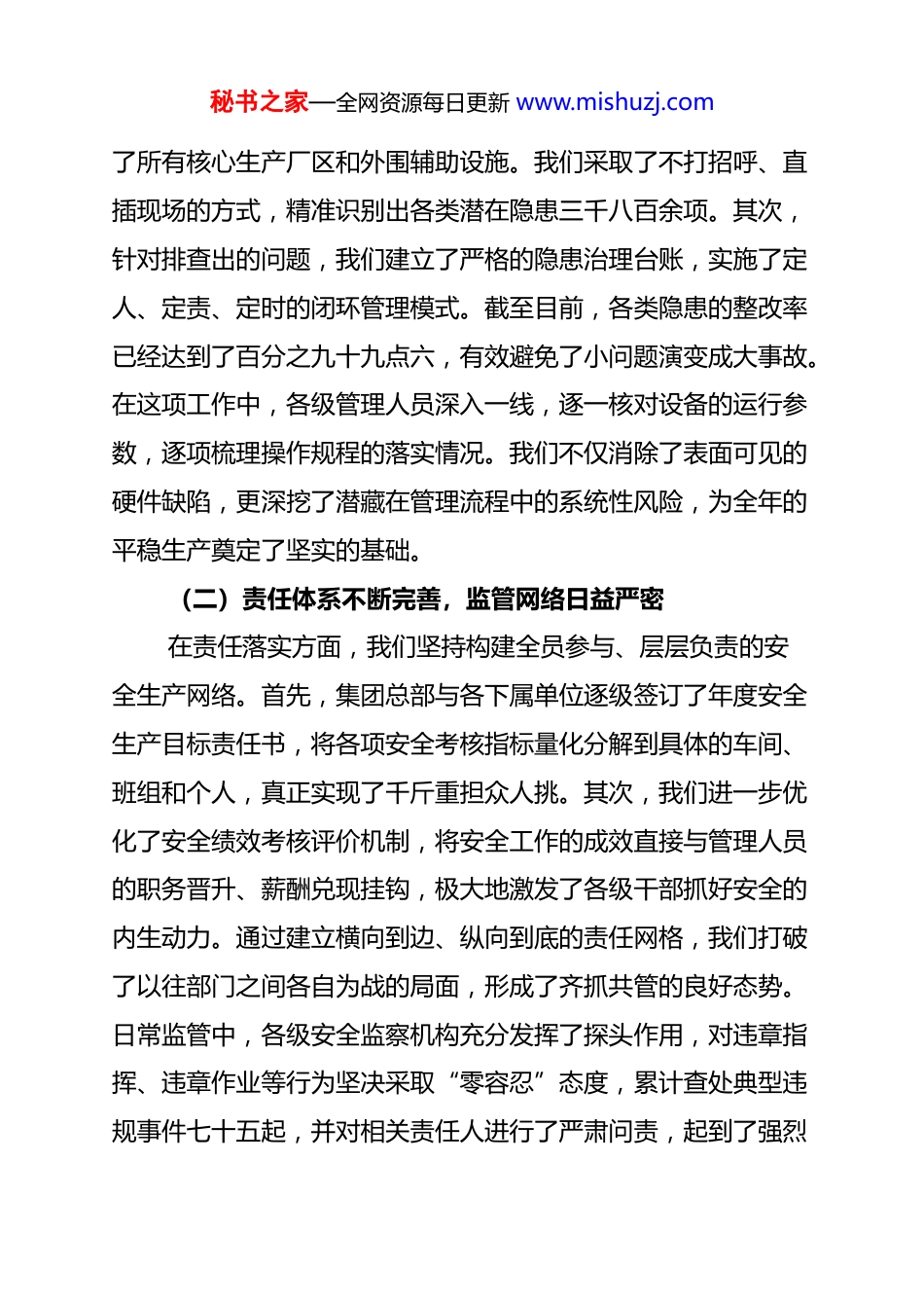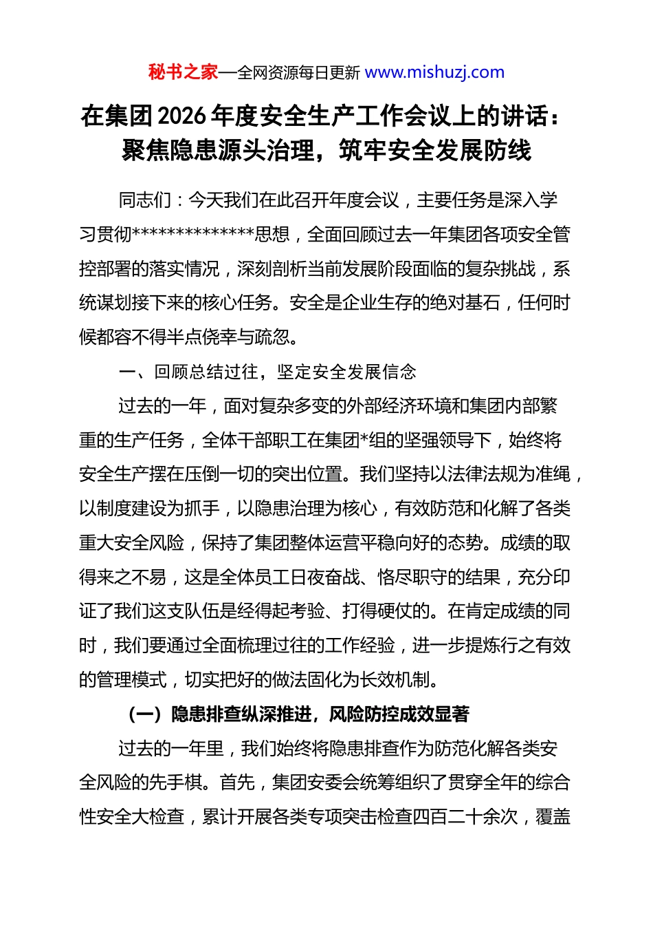 秘书之家—全网资源每日更新 www.mishuzj.com在集团 2026 年度安全生产工作会议上的讲话:聚焦隐患源头治理,筑牢安全发展防线同志们:今天我们在此召开年度会议,主要任务是深入学习贯彻**************思想,全面回顾过去一年集团各项安全管控部署的落实情况,深刻剖析当前发展阶段面临的复杂挑战,系统谋划接下来的核心任务。安全是企业生存的绝对基石,任何时候都容不得半点侥幸与疏忽。一、回顾总结过往,坚定安全发展信念过去的一年,面对复杂多变的外部经济环境和集团内部繁重的生产任务,全体干部职工在集团*组的坚强领导下,始终将安全生产摆在压倒一切的突出位置。我们坚持以法律法规为准绳,以制度建设为抓手,以隐患治理为核心,有效防范和化解了各类重大安全风险,保持了集团整体运营平稳向好的态势。成绩的取得来之不易,这是全体员工日夜奋战、恪尽职守的结果,充分印证了我们这支队伍是经得起考验、打得硬仗的。在肯定成绩的同时,我们要通过全面梳理过往的工作经验,进一步提炼行之有效的管理模式,切实把好的做法固化为长效机制。(一)隐患排查纵深推进,风险防控成效显著过去的一年里,我们始终将隐患排查作为防范化解各类安全风险的先手棋。首先,集团安委会统筹组织了贯穿全年的综合性安全大检查,累计开展各类专项突击检查四百二十余次,覆盖秘书之家—全网资源每日更新 www.mishuzj.com了所有核心生产厂区和外围辅助设施。我们采取了不打招呼、直插现场的方式,精准识别出各类潜在隐患三千八百余项。其次,针对排查出的问题,我们建立了严格的隐患治理台账,实施了定人、定责、定时的闭环管理模式。截至目前,各类隐患的整改率已经达到了百分之九十九点六,有效避免了小问题演变成大事故。在这项工作中,各级管理人员深入一线,逐一核对设备的运行参数,逐项梳理操作规程的落实情况。我们不仅消除了表面可见的硬件缺陷,更深挖了潜藏在管理流程中的系统性风险,为全年的平稳生产奠定了坚实的基础。(二)责任体系不断完善,监管网络日益严密在责任落实方面,我们坚持构建全员参与、层层负责的安全生产网络。首先,集团总部与各下属单位逐级签订了年度安全生产目标责任书,将各项安全考核指标量化分解到具体的车间、班组和个人,真正实现了千斤重担众人挑。其次,我们进一步优化了安全绩效考核评价机制,将安全工作的成效直接与管理人员的职务晋升、薪酬兑现挂钩,极大地激发了各级干部抓好安全的内生动力。通过建立横向到边、纵向到底的责任网格,我们打破了以往部门之间各自为战的局面,形成了齐抓共管的良好态势。日常监管中,各级安全监察机构充分发挥了探头作用,对违章指挥、违章作业等行为坚决采取“零容忍”态度,累计查处典型违规事件七十五起,并对相关责任人进行了严肃问责,起到了强烈秘书之家—全网资源每日更新 www.mishuzj.com的震慑效果。(三)基础建设稳步拓展,应急保障全面升级安全生产的基础在于不断提升硬件设施的本质安全水平和应对突发事件的综合能力。首先,在过去一年中,集团累计投入安全专项资金五千八百万元,集中对老旧生产线进行了自动化改造,更新了三百余套存在老化风险的关键承压设备,大幅降低了因设备故障引发的安全隐患。其次,我们全面梳理并修订了集团级和公司级的应急预案,使其更加贴合现阶段的实际生产环境。为了检验预案的可操作性,各单位累计组织了跨部门、实战化的综合应急演练一百五十余场,参演员工突破了四万五千人次。通过这些贴近实战的演练,广大职工不仅熟练掌握了各类救援器材的使用方法,更在模拟突发险情中锻炼了心理素质和协同配合能力,确保在关键时刻能够拉得出、冲得上、打得赢。二、聚焦重点领域,提升风险防范水平2026 年,集团将迎来产能扩张与产业升级的关键时期,各类新工艺、新设备的大量投入使用,必将使我们面临的安全风险更加复杂多变。面对新形势,我们必须时刻保持如履薄冰的警醒,绝不能有丝毫的麻痹大意。我们要紧紧围绕全年生产经营目标,将安全管理的关口进一步前移,以更加科学的态度、更加严谨的作风、更加有力的举措,把风险消除在萌芽状态。防范化解风险是一项系统工...