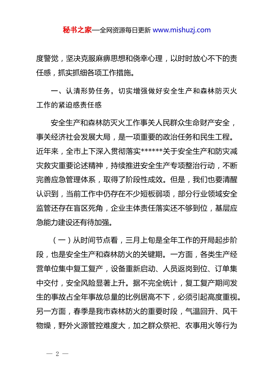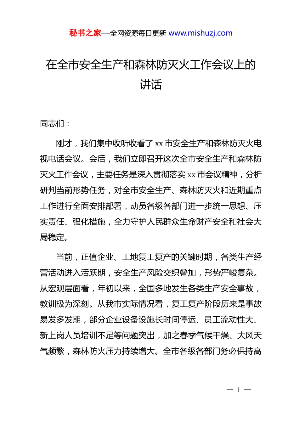 秘书之家—全网资源每日更新 www.mishuzj.com在全市安全生产和森林防灭火工作会议上的讲话同志们:刚才,我们集中收听收看了 xx 市安全生产和森林防灭火电视电话会议。会后,我们立即召开这次全市安全生产和森林防灭火工作会议,主要任务是深入贯彻落实 xx 市会议精神,分析研判当前形势任务,对全市安全生产、森林防灭火和近期重点工作进行全面安排部署,动员各级各部门进一步统一思想、压实责任、强化措施,全力守护人民群众生命财产安全和社会大局稳定。当前,正值企业、工地复工复产的关键时期,各类生产经营活动进入活跃期,安全生产风险交织叠加,形势严峻复杂。从宏观层面看,年初以来,全国多地发生各类生产安全事故,教训极为深刻。从我市实际情况看,复工复产阶段历来是事故易发多发期,部分企业设备设施长时间停运、员工流动性大、新上岗人员培训不足等问题突出,加之春季气候干燥、大风天气频繁,森林防火压力持续增大。全市各级各部门务必保持高— 1 —秘书之家—全网资源每日更新 www.mishuzj.com度警觉,坚决克服麻痹思想和侥幸心理,以时时放心不下的责任感,抓实抓细各项工作措施。一、认清形势任务,切实增强做好安全生产和森林防灭火工作的紧迫感责任感安全生产和森林防灭火工作事关人民群众生命财产安全,事关经济社会发展大局,是一项重要的政治任务和民生工程。近年来,全市上下深入贯彻落实******关于安全生产和防灾减灾救灾重要论述精神,持续推进安全生产专项整治行动,不断完善应急管理体系,取得了阶段性成效。但是,我们也要清醒认识到,当前工作中仍存在不少短板弱项,部分行业领域安全监管还存在盲区死角,企业主体责任落实还不够到位,基层应急能力建设还有待加强。(一)从时间节点看,三月上旬是全年工作的开局起步阶段,也是安全生产和森林防火的关键期。一方面,各类生产经营单位集中复工复产,设备重新启动、人员返岗到位、订单集中交付,安全风险显著上升。据不完全统计,复工复产期间发生的事故占全年事故总量的比例居高不下,必须引起高度重视。另一方面,春季是我市森林防火的重要时段,气温回升、风干物燥,野外火源管控难度大,加之群众祭祀、农事用火等行为— 2 —秘书之家—全网资源每日更新 www.mishuzj.com增多,森林火险等级持续偏高。根据气象部门预测,近期我市降水偏少、气温偏高,森林防火形势不容乐观。(二)从风险隐患看,重点领域安全生产压力依然较大。道路交通方面,春运返程客流与生产物资运输叠加,"两客一危"等重点车辆安全监管任务繁重。建筑施工方面,新开工项目增多,深基坑、高支模、起重机械等危险性较大的分部分项工程风险突出。消防领域方面,大型商业综合体、高层建筑、"九小场所"等人员密集场所火灾隐患排查整治任务艰巨。危化品领域方面,部分企业工艺设备老化、自动化控制水平不高,本质安全水平有待提升。工贸领域方面,粉尘涉爆、有限空间作业等风险不容忽视。(三)从责任落实看,个别单位还存在思想认识不到位、工作措施不扎实、隐患整改不彻底等问题。有的地方和部门安全检查流于形式,问题发现不了、隐患整改不力;有的企业重效益轻安全,安全投入不足,员工培训走过场;有的基层单位应急预案不完善,应急演练不经常,处置能力有待提高。这些问题必须引起我们高度重视,采取有力措施加以解决。二、聚焦重点关键,扎实推进复工复产安全风险防范工作— 3 —秘书之家—全网资源每日更新 www.mishuzj.com做好复工复产期间的安全生产工作,是当前的首要任务。各级各部门要牢固树立"一盘棋"思想,高度协作、紧密配合,形成工作合力,聚焦重点领域、关键节点,细化工作举措,压实工作责任。第一,全面开展复工复产安全风险评估。各相关部门要组织专家提前介入,指导企业制定科学复工复产方案,全面排查设施设备安全隐患。要督促企业严格落实复工复产"六个一"要求,即召开一次安全生产专题会议、制定一份复工复产方案、开展一次全员安全教育培训、组织一次全面安全检查、进行一次设备设施维护保养、完善一套应急预案。要突出高危行业领域,对矿山、危化品、建筑施工等重点行业,组织专家开展...