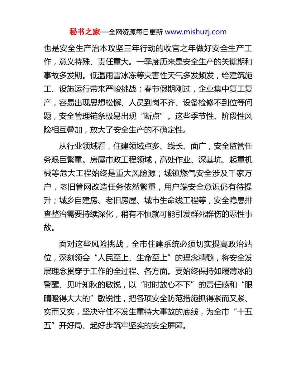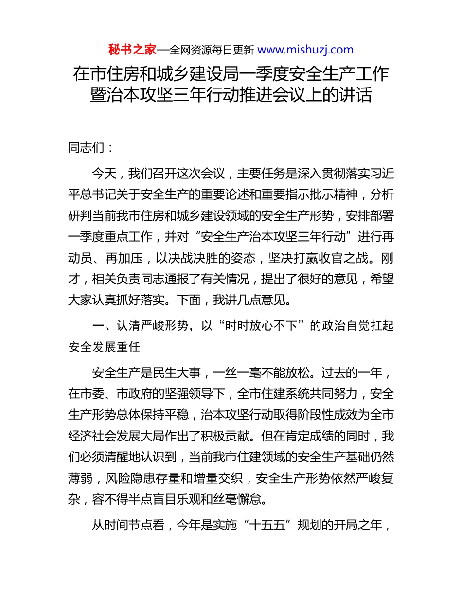 秘书之家—全网资源每日更新 www.mishuzj.com在市住房和城乡建设局一季度安全生产工作暨治本攻坚三年行动推进会议上的讲话同志们:今天,我们召开这次会议,主要任务是深入贯彻落实习近平总书记关于安全生产的重要论述和重要指示批示精神,分析研判当前我市住房和城乡建设领域的安全生产形势,安排部署一季度重点工作,并对“安全生产治本攻坚三年行动”进行再动员、再加压,以决战决胜的姿态,坚决打赢收官之战。刚才,相关负责同志通报了有关情况,提出了很好的意见,希望大家认真抓好落实。下面,我讲几点意见。一、认清严峻形势,以“时时放心不下”的政治自觉扛起安全发展重任安全生产是民生大事,一丝一毫不能放松。过去的一年,在市委、市政府的坚强领导下,全市住建系统共同努力,安全生产形势总体保持平稳,治本攻坚行动取得阶段性成效为全市经济社会发展大局作出了积极贡献。但在肯定成绩的同时,我们必须清醒地认识到,当前我市住建领域的安全生产基础仍然薄弱,风险隐患存量和增量交织,安全生产形势依然严峻复杂,容不得半点盲目乐观和丝毫懈怠。从时间节点看,今年是实施“十五五”规划的开局之年,秘书之家—全网资源每日更新 www.mishuzj.com也是安全生产治本攻坚三年行动的收官之年做好安全生产工作,意义特殊、责任重大。一季度历来是安全生产的关键期和事故多发期。低温雨雪冰冻等灾害性天气多发频发,给建筑施工、设施运行带来严峻挑战;春节假期刚过,企业集中复工复产,容易出现思想松懈、人员到岗不齐、设备检修不到位等问题,安全管理链条极易出现“断点”。这些季节性、阶段性风险相互叠加,放大了安全生产的不确定性。从行业领域看,住建领域点多、线长、面广,安全监管任务艰巨繁重。房屋市政工程领域,高处作业、深基坑、起重机械等危大工程始终是重大风险源;城镇燃气安全涉及千家万户,老旧管网改造任务依然繁重,用户端安全意识仍有待提升;城乡自建房、老旧房屋、城市生命线工程等,安全隐患排查整治需要持续深化,稍有不慎就可能引发群死群伤的恶性事故。面对这些风险挑战,全市住建系统必须切实提高政治站位,深刻领会“人民至上、生命至上”的理念精髓,将安全发展理念贯穿于工作的全过程、各方面。要始终保持如履薄冰的警醒、见叶知秋的敏锐,以“时时放心不下”的责任感和“眼睛瞪得大大的”敏锐性,把各项安全防范措施抓得紧而又紧、实而又实,坚决守住不发生重特大事故的底线,为全市“十五五”开好局、起好步筑牢坚实的安全屏障。秘书之家—全网资源每日更新 www.mishuzj.com二、聚焦决战决胜,以“钉钉子”精神打好治本攻坚收官之战安全生产治本攻坚三年行动,是党中央、国务院作出的重大决策部署,旨在从根本上消除事故隐患,从根本上解决问题。经过前两年的努力,我市在健全责任体系、排查整治隐患、强化科技支撑等方面取得了积极进展,但距离“根本”二字,还有不少硬骨头要啃。2026 年作为收官之年,必须发起总攻,确保所有任务高质量完成,实现长治久安。第一,要以系统思维全面复盘评估,确保任务清单动态清零。治本攻坚行动的目标,是到 2026 年底前形成重大事故隐患动态清零的常态化机制。收官不是收场,而是更高标准、更严要求的冲刺。各单位、各部门要立即对标三年行动方案,对各项任务进行一次彻底的“回头看”。要建立详细的任务台账和问题清单,已经完成的,要评估成效、巩固提升;尚未完成的,要倒排工期、挂图作战,明确时间表、路线图和责任人,确保在年底前全部销号清零。要坚决杜绝“纸上清零”“数字达标”等形式主义,确保每一项任务都经得起实践和历史的检验。第二,要以创新理念健全长效机制,推动安全治理模式转型。治本攻坚的核心在于“治本”,关键在于构建预防为主、关口前移的长效机制。必须深刻认识到,传统的、依赖人力和秘书之家—全网资源每日更新 www.mishuzj.com经验的监管模式已难以适应新时代的要求。要加快推动安全治理向事前预防转型,将工作的重心从被动应对事故转变为主动防范风险。这要求我们必须完善市场现场联动机制,将安全生产表现与企业资质、信用评价、招投标等直接挂钩,用市场的...