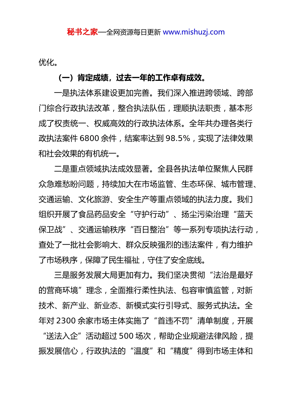 秘书之家—全网资源每日更新 www.mishuzj.com在县 2026 年行政执法工作会议上的讲话同志们:今天,我们在这里召开全县 2026 年行政执法工作会议,主要任务是深入学习贯彻习近平法治思想,全面总结 2025 年我县行政执法工作,分析当前面临的形势和挑战,安排部署2026 年的重点工作。刚才,会议组织大家集中学习了《中华人民共和国法治宣传教育法》和《行政执法监督条例》,通报了近期行政执法专项整治进展和 2025 年下半年案卷评查情况,并进行了专题业务培训,内容很充实,针对性很强,希望大家认真领会,抓好落实。下面,我讲三点意见。一、回顾过去,客观总结成绩,清醒认识不足,切实增强做好新时代行政执法工作的责任感和紧迫感过去的一年,是全面贯彻落实党的二十大精神的关键之年也是我县法治政府建设纵深推进的一年。全县各级行政执法部门和广大行政执法人员,在县委、县政府的坚强领导下,紧紧围绕全县经济社会发展大局,忠诚履职、担当作为,付出了艰辛努力,取得了显著成效。行政执法的规范化水平稳步提升,服务高质量发展的能力持续增强,法治化营商环境得到进一步秘书之家—全网资源每日更新 www.mishuzj.com优化。(一)肯定成绩,过去一年的工作卓有成效。一是执法体系建设更加完善。我们深入推进跨领域、跨部门综合行政执法改革,整合执法队伍,理顺执法职责,基本形成了权责统一、权威高效的行政执法体系。全年共办理各类行政执法案件 6800 余件,结案率达到 98.5%,实现了法律效果和社会效果的有机统一。二是重点领域执法成效显著。全县各执法单位聚焦人民群众急难愁盼问题,持续加大在市场监管、生态环保、城市管理、交通运输、文化旅游、安全生产等重点领域的执法力度。我们组织开展了食品药品安全“守护行动”、扬尘污染治理“蓝天保卫战”、交通运输秩序“百日整治”等一系列专项执法行动,查处了一批社会影响大、群众反映强烈的违法案件,有力维护了市场秩序,保障了民生福祉,守住了安全底线。三是服务发展大局更加有力。我们坚决贯彻“法治是最好的营商环境”理念,全面推行柔性执法、包容审慎监管,对新技术、新产业、新业态、新模式实行引导式、服务式执法。全年对 2300 余家市场主体实施了“首违不罚”清单制度,开展“送法入企”活动超过 500 场次,帮助企业规避法律风险,提振发展信心,行政执法的“温度”和“精度”得到市场主体和秘书之家—全网资源每日更新 www.mishuzj.com社会各界的普遍认可。四是执法队伍形象持续向好。通过常态化开展政治轮训、业务比武和纪律作风教育,全县行政执法队伍的政治素养、法治观念和专业能力有了明显提升。广大执法人员奋战在基层一线,顶风冒雨、不辞辛劳,在平凡的岗位上做出了不平凡的贡献,涌现出了一批先进集体和个人,展现了新时代执法队伍的良好风貌。在此,我代表县人民政府,向全县所有奋战在行政执法一线的同志们,表示衷心的感谢和崇高的敬意!(二)正视问题,当前存在的短板不容忽视。在肯定成绩的同时,我们必须清醒地看到,对标新时代法治政府建设的新要求,对照人民群众对公平正义的新期待,我县的行政执法工作还存在不少亟待解决的突出问题。刚才通报的案卷评查情况,就是一面镜子,照出了我们的短板和不足。问题主要集中在以下几个方面:一是在执法理念上存在偏差。少数执法人员“以人民为中心”的思想树得不牢,重处罚、轻教育,重管理、轻服务的观念依然存在。个别单位在执法中,没有很好地把握时度效,存在“运动式”、“一刀切”等简单化执法现象,影响了政府公信力和企业、群众的满意度。二是在执法程序上存在瑕疵。这是案卷评查中暴露出的最秘书之家—全网资源每日更新 www.mishuzj.com普遍的问题。比如,执法告知不充分、证据收集不规范、文书送达不合法、听证程序走过场等问题时有发生。在下半年的案卷评查中,我们抽查了 300 宗案卷,发现存在各类程序瑕疵的比例高达 18%,这说明我们的程序意识、证据意识、规范意识还远远不够。三是在法律适用上存在不准。一些执法人员对法律法规学习不深、理解不透,导致在案件办理中出现事实认定不清、证据与事实关联性不强...
