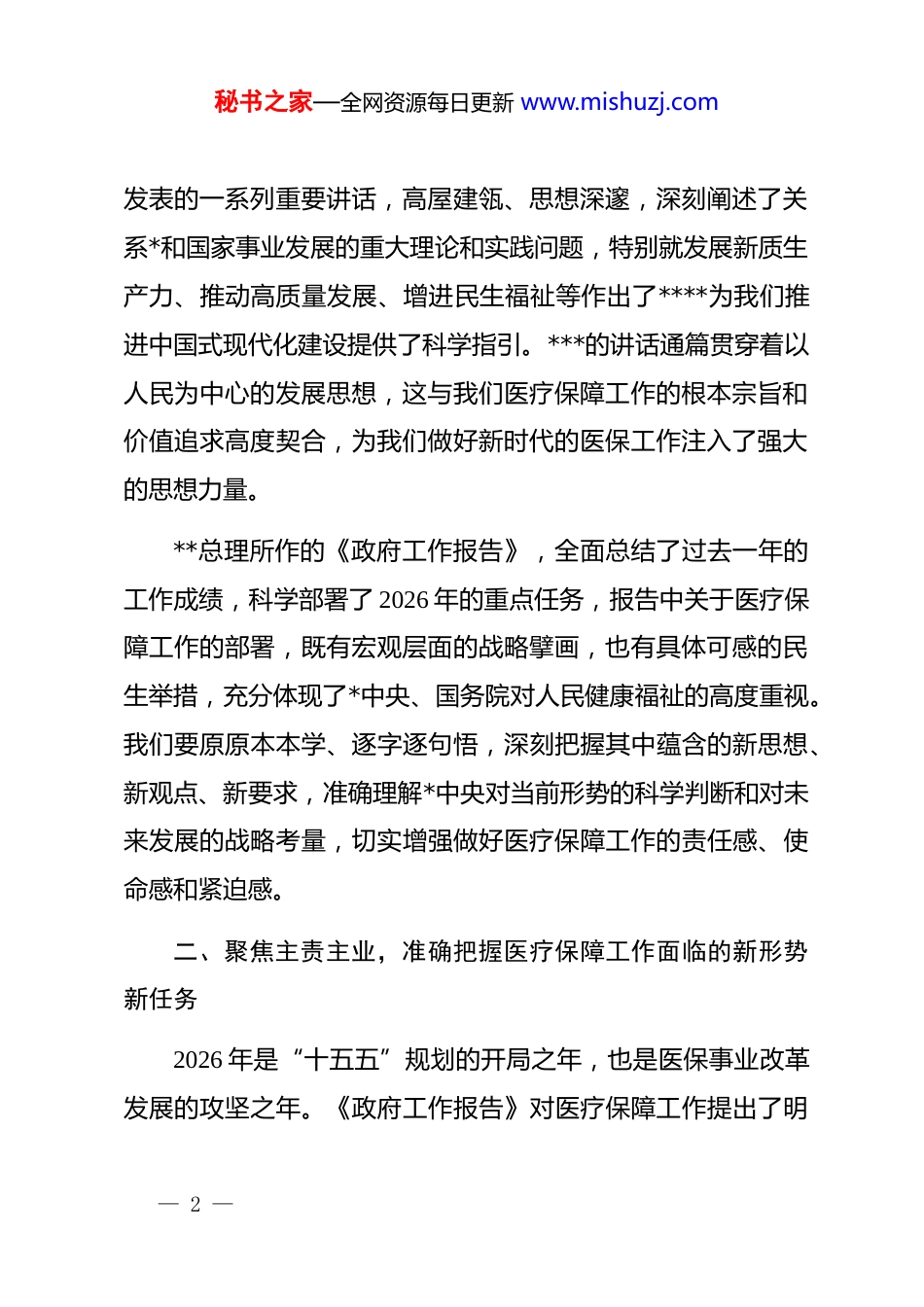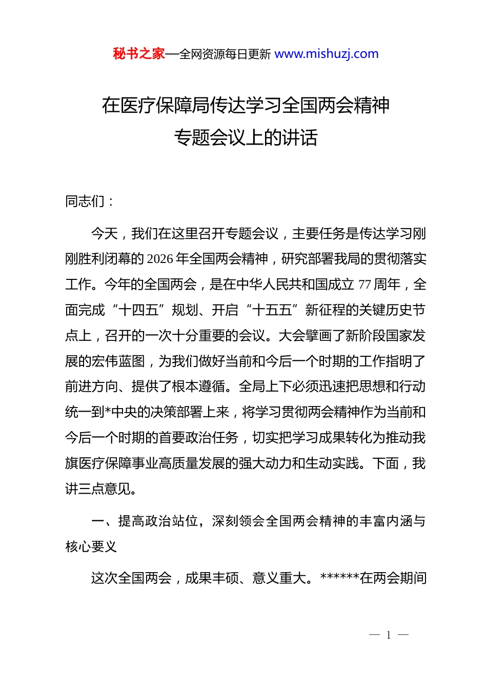秘书之家—全网资源每日更新 www.mishuzj.com在医疗保障局传达学习全国两会精神专题会议上的讲话同志们:今天,我们在这里召开专题会议,主要任务是传达学习刚刚胜利闭幕的 2026 年全国两会精神,研究部署我局的贯彻落实工作。今年的全国两会,是在中华人民共和国成立 77 周年,全面完成“十四五”规划、开启“十五五”新征程的关键历史节点上,召开的一次十分重要的会议。大会擘画了新阶段国家发展的宏伟蓝图,为我们做好当前和今后一个时期的工作指明了前进方向、提供了根本遵循。全局上下必须迅速把思想和行动统一到*中央的决策部署上来,将学习贯彻两会精神作为当前和今后一个时期的首要政治任务,切实把学习成果转化为推动我旗医疗保障事业高质量发展的强大动力和生动实践。下面,我讲三点意见。一、提高政治站位,深刻领会全国两会精神的丰富内涵与核心要义这次全国两会,成果丰硕、意义重大。******在两会期间— 1 —秘书之家—全网资源每日更新 www.mishuzj.com发表的一系列重要讲话,高屋建瓴、思想深邃,深刻阐述了关系*和国家事业发展的重大理论和实践问题,特别就发展新质生产力、推动高质量发展、增进民生福祉等作出了****为我们推进中国式现代化建设提供了科学指引。***的讲话通篇贯穿着以人民为中心的发展思想,这与我们医疗保障工作的根本宗旨和价值追求高度契合,为我们做好新时代的医保工作注入了强大的思想力量。**总理所作的《政府工作报告》,全面总结了过去一年的工作成绩,科学部署了 2026 年的重点任务,报告中关于医疗保障工作的部署,既有宏观层面的战略擘画,也有具体可感的民生举措,充分体现了*中央、国务院对人民健康福祉的高度重视。我们要原原本本学、逐字逐句悟,深刻把握其中蕴含的新思想、新观点、新要求,准确理解*中央对当前形势的科学判断和对未来发展的战略考量,切实增强做好医疗保障工作的责任感、使命感和紧迫感。二、聚焦主责主业,准确把握医疗保障工作面临的新形势新任务2026 年是“十五五”规划的开局之年,也是医保事业改革发展的攻坚之年。《政府工作报告》对医疗保障工作提出了明— 2 —秘书之家—全网资源每日更新 www.mishuzj.com确要求,全国医疗保障工作会议也对全年重点任务作出了系统部署。结合我旗实际,必须牢牢把握以下几个关键着力点,推动两会精神在我旗医保领域落地生根、开花结果。第一,织密扎牢全民医保网络,持续提升医疗保障的公平性与普惠性。人民健康是民族昌盛和国家富强的重要标志,健全的全民医保体系是维护人民健康的第一道防线。《政府工作报告》明确提出,居民医保人均财政补助标准再提高 24 元。这笔资金虽然具体到个人数额不大,但乘以全国庞大的参保基数,就是一笔巨大的民生投入,彰显了国家持续改善民生的坚定决心。我们要不折不扣地落实好这项惠民政策,精准做好资金测算与划拨,确保补贴及时足额到位。同时,要健全基本医保参保长效机制,巩固拓展参保覆盖面,持续稳定并提升我旗超过95%的参保率,确保“应保尽保”;要进一步健全基本医保、大病保险、医疗救助三重制度综合保障格局,推动制度间高效衔接,有效防范和化解因病致贫返贫风险。此外,报告还强调要加快发展商业健康保险,支持其与基本医保的衔接互补我们要积极探索引导,满足群众多层次、多元化的健康保障需求。第二,坚定不移深化改革创新,不断增强医疗保障发展的内生动力与活力。改革是推动事业发展的根本动力。当前,医— 3 —秘书之家—全网资源每日更新 www.mishuzj.com保改革已进入深水区。我们要拿出更大的勇气和智慧,啃下硬骨头。一是积极稳妥推进基本医疗保险省级统筹。根据国家和自治区的统一部署,推动基本医保省级统筹是“十五五”时期的重要改革任务。自治区已明确提出到 2028 年实现居民医保自治区级统筹的时间表,我们要主动作为,提前谋划,认真做好政策梳理、数据归集、系统对接等前期准备工作,确保平稳过渡、无缝衔接,为提升基金共济能力和管理效能贡献**力量。二是持续深化医保支付方式改革。要不断完善总额预算下的按病种分值付费(dip)改革,抓实结余留用激励机制,通过精准的价值付...
