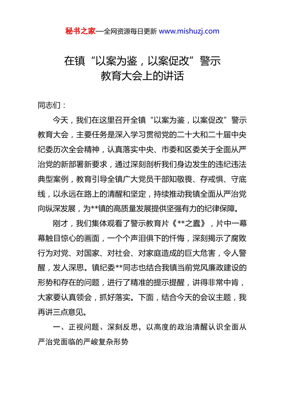 秘书之家—全网资源每日更新 www.mishuzj.com在镇“以案为鉴,以案促改”警示教育大会上的讲话 同志们:今天,我们在这里召开全镇“以案为鉴,以案促改”警示教育大会,主要任务是深入学习贯彻党的二十大和二十届中央纪委历次全会精神,认真落实中央、市委和区委关于全面从严治党的新部署新要求,通过深刻剖析我们身边发生的违纪违法典型案例,教育引导全镇广大党员干部知敬畏、存戒惧、守底线,以永远在路上的清醒和坚定,持续推动我镇全面从严治党向纵深发展,为**镇的高质量发展提供坚强有力的纪律保障。刚才,我们集体观看了警示教育片《**之蠹》,片中一幕幕触目惊心的画面,一个个声泪俱下的忏悔,深刻揭示了腐败行为对党、对国家、对社会、对家庭造成的巨大危害,令人警醒,发人深思。镇纪委**同志也结合我镇当前党风廉政建设的形势和存在的问题,进行了精准的提示提醒,讲得非常中肯,大家要认真领会,抓好落实。下面,结合今天的会议主题,我再讲三点意见。一、正视问题、深刻反思,以高度的政治清醒认识全面从严治党面临的严峻复杂形势秘书之家—全网资源每日更新 www.mishuzj.com党的十八大以来,以习近平同志为核心的党中央以前所未有的决心和力度推进全面从严治党,刹住了一些长期没有刹住的歪风,纠治了一些多年未除的顽瘴痼疾,反腐败斗争取得压倒性胜利并全面巩固。但是,我们必须清醒地认识到,党风廉政建设和反腐败斗争的形势依然严峻复杂,全面从严治党永远在路上,管党治党一刻也不能放松。近年来,在区委的坚强领导下,镇党委坚决扛起管党治党主体责任,持之以恒正风肃纪,我镇的政治生态总体是好的,绝大多数党员干部是清正廉洁、担当作为的。这是我们必须充分肯定的主流。但同时,我们也要以刀刃向内的勇气,直面存在的问题。从近几年区纪委监委查处和通报的案例,以及我们镇内部自查自纠发现的问题来看,一些不容忽视的苗头性、倾向性问题依然存在,甚至在个别领域、个别干部身上还比较突出。一是理想信念动摇,政治意识淡薄的问题依然存在。有的党员干部理论学习不入心、不走实,对党的创新理论一知半解,对党章党规党纪不上心、不掌握、不执行,在思想上出现了“总开关”失灵的问题。有的同志认为腐败离自己很远,是“大官”们的事,放松了对自己的要求,在潜移默化中被“围猎”,在小恩小惠中失守底线。更有甚者,对中央的大政方针秘书之家—全网资源每日更新 www.mishuzj.com和区委、镇党委的决策部署阳奉阴违、合意的就执行,不合意的就打折扣、搞变通,缺乏应有的政治判断力、政治领悟力、政治执行力。二是纪律规矩松弛,“四风”问题禁而未绝的问题依然存在。少数干部对中央八项规定精神缺乏敬畏之心,认为“风头”已过,又开始动起了歪脑筋。违规收受礼品礼金、违规接受宴请、私车公养等现象仍有发生。一些部门和干部身上,形式主义、官僚主义问题还比较顽固,例如对待群众诉求推诿扯皮、敷衍塞责;对待上级工作部署,满足于开会发文,不注重实际效果;习惯于“坐在办公室看材料、听汇报”,深入基层一线解决实际问题少。这些问题看似是作风小节,实则是脱离群众的危险信号。三是权力运行失范,基层“微腐败”的风险依然存在。我镇作为首都城市化进程中的重要一环,近年来承担了大量的项目建设、拆迁腾退、环境整治等任务,资金密集、资源富集,这既是发展的机遇,也对我们干部的廉洁自律提出了更高要求。从查处的案件看,有的村干部利用手中管理集体“三资”的权力,优亲厚友、侵占挪用;有的在工程发包、合同签订中搞暗箱操作,为他人谋取利益,自己收受好处;有的在惠民政策、补贴资金发放中“雁过拔毛”,克扣群众利益。这些发生在群秘书之家—全网资源每日更新 www.mishuzj.com众身边的“蝇贪蚁腐”,直接啃食的是群众的获得感,挥霍的是基层群众对党的信任,其危害性不容小觑。四是管党治党责任虚化,压力传导层层递减的问题依然存在。有的党组织负责人对“主体责任”的认识还停留在口头上,对本单位、本村的党风廉政建设抓得不紧、不实,对干部队伍中出现的苗头性问题,要么视而不见,要么当“老好人”,不愿批评、不敢管理。监督责任...