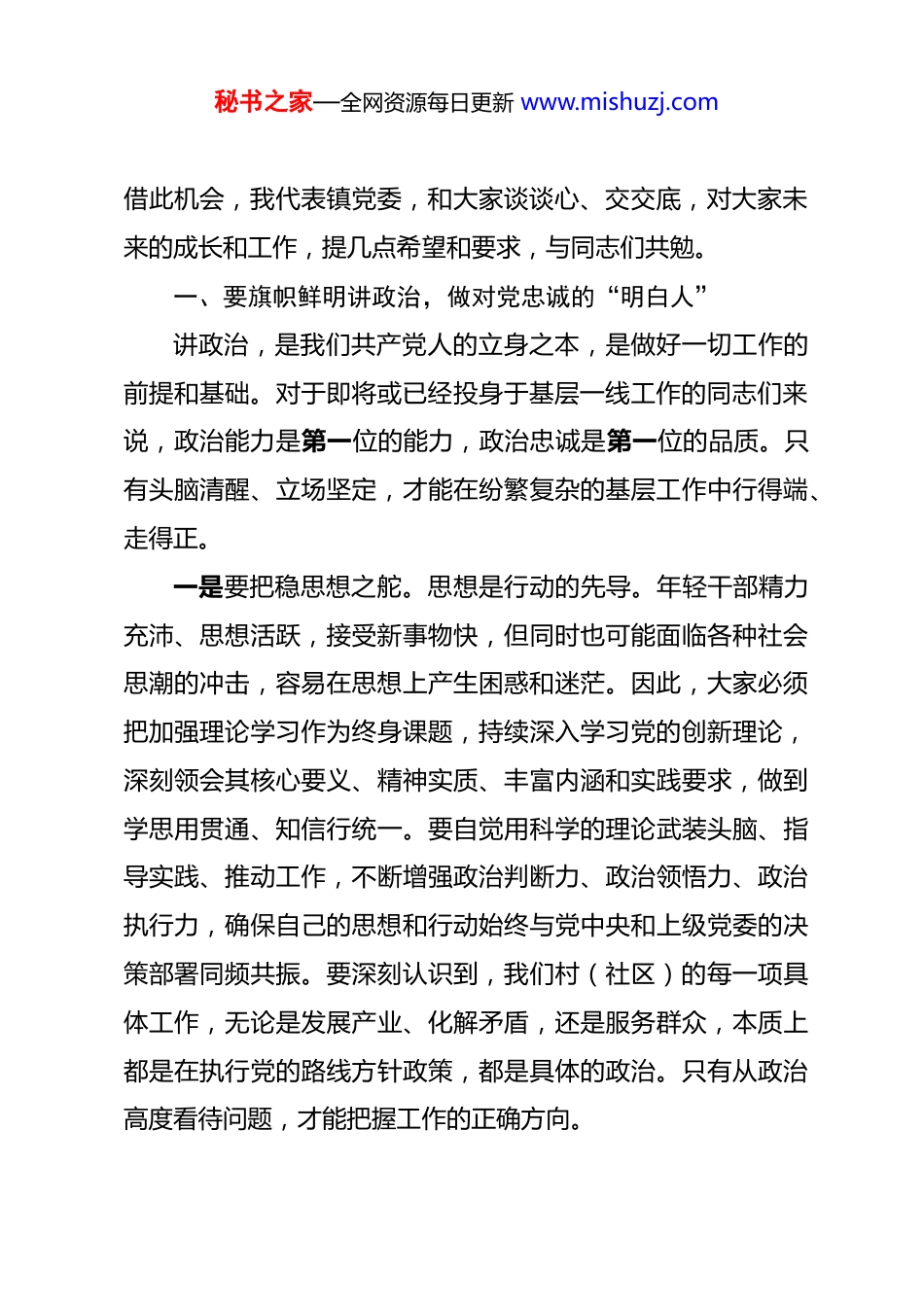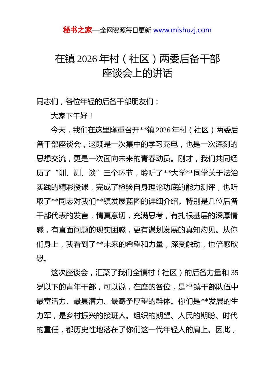 秘书之家—全网资源每日更新 www.mishuzj.com在镇 2026 年村(社区)两委后备干部座谈会上的讲话 同志们,各位年轻的后备干部朋友们:大家下午好!今天,我们在这里隆重召开**镇 2026 年村(社区)两委后备干部座谈会,这既是一次集中的学习充电,也是一次深刻的思想交流,更是一次面向未来的青春动员。刚才,我们共同经历了“训、测、谈”三个环节,聆听了**大学**同学关于法治实践的精彩授课,完成了检验自身理论功底的能力测评,也听取了**同志对我们**镇发展蓝图的详细介绍。特别是几位后备干部代表的发言,情真意切,充满思考,有扎根基层的深厚情感,有直面问题的现实困惑,更有谋划发展的真知灼见。从你们身上,我看到了**未来的希望和力量,深受触动,也倍感欣慰。这次座谈会,汇聚了我们全镇村(社区)的后备力量和 35岁以下的青年干部,可以说,在座的各位,是**镇干部队伍中最富活力、最具潜力、最寄予厚望的群体。你们是**发展的生力军,是乡村振兴的接班人。组织的期望、人民的期盼、时代的重任,都历史性地落在了你们这一代年轻人的肩上。因此,秘书之家—全网资源每日更新 www.mishuzj.com借此机会,我代表镇党委,和大家谈谈心、交交底,对大家未来的成长和工作,提几点希望和要求,与同志们共勉。一、要旗帜鲜明讲政治,做对党忠诚的“明白人”讲政治,是我们共产党人的立身之本,是做好一切工作的前提和基础。对于即将或已经投身于基层一线工作的同志们来说,政治能力是第一位的能力,政治忠诚是第一位的品质。只有头脑清醒、立场坚定,才能在纷繁复杂的基层工作中行得端、走得正。一是要把稳思想之舵。思想是行动的先导。年轻干部精力充沛、思想活跃,接受新事物快,但同时也可能面临各种社会思潮的冲击,容易在思想上产生困惑和迷茫。因此,大家必须把加强理论学习作为终身课题,持续深入学习党的创新理论,深刻领会其核心要义、精神实质、丰富内涵和实践要求,做到学思用贯通、知信行统一。要自觉用科学的理论武装头脑、指导实践、推动工作,不断增强政治判断力、政治领悟力、政治执行力,确保自己的思想和行动始终与党中央和上级党委的决策部署同频共振。要深刻认识到,我们村(社区)的每一项具体工作,无论是发展产业、化解矛盾,还是服务群众,本质上都是在执行党的路线方针政策,都是具体的政治。只有从政治高度看待问题,才能把握工作的正确方向。秘书之家—全网资源每日更新 www.mishuzj.com二是要永葆忠诚之心。忠诚是具体的、实践的。对党忠诚,不是一句空洞的口号,而是要体现在一言一行、一举一动之中。在基层,检验忠诚的“试金石”无处不在。是否能不折不扣地把镇党委政府的各项决策部署落实到田间地头、群众家中;是否能在面对矛盾纠纷、急难险重任务时,挺身而出、迎难而上;是否能在面对个人利益与集体利益、群众利益冲突时,毫不犹豫地选择后者。这些都是对我们忠诚度的直接考验。希望大家时刻牢记自己的第一身份是共产党员,第一职责是为党工作,始终做到心中有党、心中有民、心中有责、心中有戒,把对党忠诚的坚定信念,转化为扎根基层、服务人民的实际行动。三是要站稳人民立场。我们党的根基在人民、血脉在人民、力量在人民。在座的各位,身处服务群众的最前沿,与老百姓打交道最直接、最频繁。你们的形象,在很大程度上就代表了党和政府在群众心中的形象。因此,必须牢固树立以人民为中心的发展思想,始终把人民群众放在心中最高位置。要坚持从群众中来、到群众中去,把群众的安危冷暖、急难愁盼时时刻刻放在心上,想问题、作决策、办事情都要以群众拥护不拥护、赞成不赞成、高兴不高兴、答应不答应作为根本标准,真正做到权为民所用、情为民所系、利为民所谋。二、要提升本领强素质,做基层工作的“内行人”秘书之家—全网资源每日更新 www.mishuzj.com基层是座大熔炉,也是个大学校。农村工作千头万绪,复杂而具体,光有一腔热情是远远不够的,必须练就一身过硬的本领,才能担负起新时代赋予我们的重任,从容应对各种挑战。一是要在干中学,增强专业能力。俗话说,“没有金刚钻,不揽瓷器活”。基层工作涉及经济发展、社会...