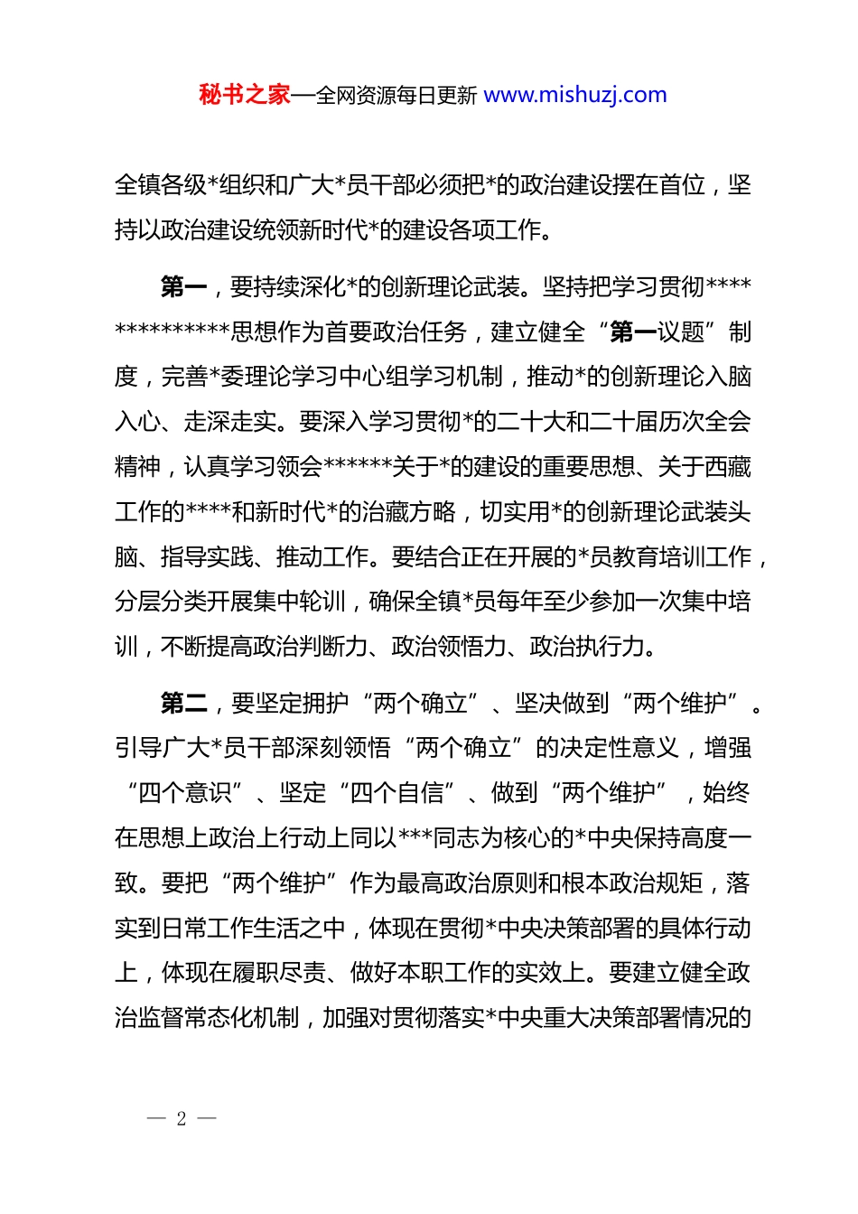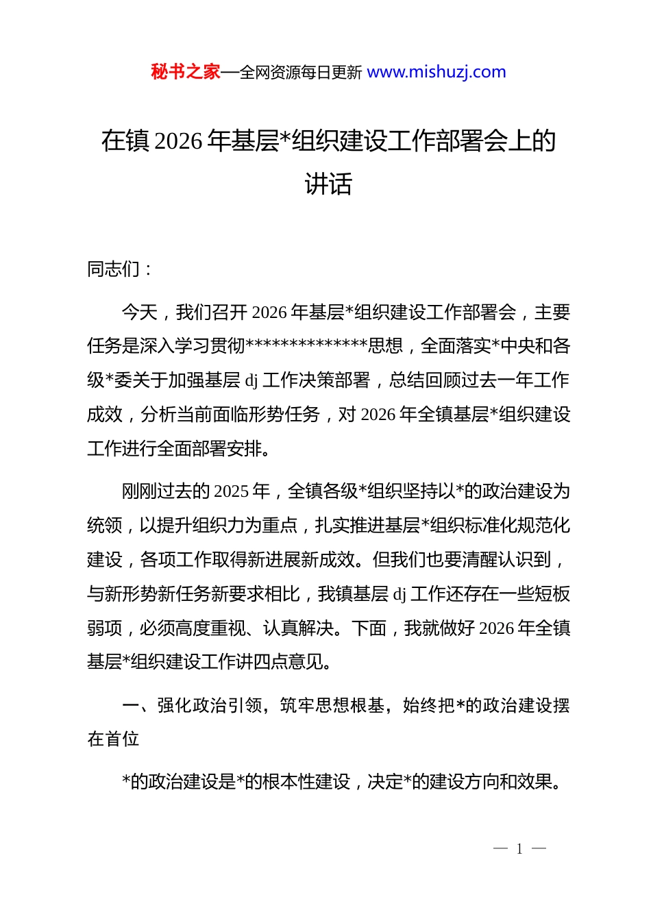 秘书之家—全网资源每日更新 www.mishuzj.com在镇 2026 年基层*组织建设工作部署会上的讲话同志们:今天,我们召开 2026 年基层*组织建设工作部署会,主要任务是深入学习贯彻**************思想,全面落实*中央和各级*委关于加强基层 dj 工作决策部署,总结回顾过去一年工作成效,分析当前面临形势任务,对 2026 年全镇基层*组织建设工作进行全面部署安排。刚刚过去的 2025 年,全镇各级*组织坚持以*的政治建设为统领,以提升组织力为重点,扎实推进基层*组织标准化规范化建设,各项工作取得新进展新成效。但我们也要清醒认识到,与新形势新任务新要求相比,我镇基层 dj 工作还存在一些短板弱项,必须高度重视、认真解决。下面,我就做好 2026 年全镇基层*组织建设工作讲四点意见。一、强化政治引领,筑牢思想根基,始终把*的政治建设摆在首位*的政治建设是*的根本性建设,决定*的建设方向和效果。— 1 —秘书之家—全网资源每日更新 www.mishuzj.com全镇各级*组织和广大*员干部必须把*的政治建设摆在首位,坚持以政治建设统领新时代*的建设各项工作。第一,要持续深化*的创新理论武装。坚持把学习贯彻**************思想作为首要政治任务,建立健全“第一议题”制度,完善*委理论学习中心组学习机制,推动*的创新理论入脑入心、走深走实。要深入学习贯彻*的二十大和二十届历次全会精神,认真学习领会******关于*的建设的重要思想、关于西藏工作的****和新时代*的治藏方略,切实用*的创新理论武装头脑、指导实践、推动工作。要结合正在开展的*员教育培训工作,分层分类开展集中轮训,确保全镇*员每年至少参加一次集中培训,不断提高政治判断力、政治领悟力、政治执行力。第二,要坚定拥护“两个确立”、坚决做到“两个维护”。引导广大*员干部深刻领悟“两个确立”的决定性意义,增强“四个意识”、坚定“四个自信”、做到“两个维护”,始终在思想上政治上行动上同以***同志为核心的*中央保持高度一致。要把“两个维护”作为最高政治原则和根本政治规矩,落实到日常工作生活之中,体现在贯彻*中央决策部署的具体行动上,体现在履职尽责、做好本职工作的实效上。要建立健全政治监督常态化机制,加强对贯彻落实*中央重大决策部署情况的— 2 —秘书之家—全网资源每日更新 www.mishuzj.com监督检查,确保政令畅通、令行禁止。第三,要严肃*内政治生活。严格执行新形势下*内政治生活若干准则,认真落实“三会一课”、组织生活会、民主评议*员、主题*日等制度,不断增强*内政治生活的政治性、时代性、原则性、战斗性。要坚持和完善民主集中制,健全议事决策机制,凡属重大问题都要按照集体领导、民主集中、个别酝酿、会议决定的原则,由集体讨论作出决定。要用好批评和自我批评武器,开展积极健康的思想斗争,不断净化*内政治生态。要加强*内政治文化建设,弘扬忠诚老实、公道正派、实事求是、清正廉洁等共产*人价值观,营造风清气正的良好政治生态。二、夯实组织基础,建强战斗堡垒,推动基层*组织全面进步全面过硬基层*组织是*执政大厦的根基,是*的全部工作和战斗力的基础。我们要以提升组织力为重点,突出政治功能,把基层*组织建设成为宣传*的主张、贯彻*的决定、领导基层治理、团结动员群众、推动改革发展的坚强战斗堡垒。第一,要扎实推进基层*组织标准化规范化建设。对照《中国共产*支部工作条例(试行)》等*内法规,按照“五有”标— 3 —秘书之家—全网资源每日更新 www.mishuzj.com准,扎实推进*支部标准化规范化建设,确保年内所有*支部达到标准化规范化要求。要健全完善“三会一课”、组织生活会、民主评议*员、谈心谈话等制度机制,推进*内组织生活正常化经常化。要严格落实“四议两公开”制度,规范村级重大事项决策程序,确保村务公开透明、阳光运行。要完善村级*群服务中心功能布局,推进“一站式”服务,不断提升服务*员群众的能力水平。第二,要严格*员发展和教育管理。认真落实《中国共产*发展*员工作细则》,严格发展*员程序,把好政治关、入口关,确保新发展的*员政治合格、质量过硬。要注重从青年农牧民、致富带头人、退役军人、返乡...
