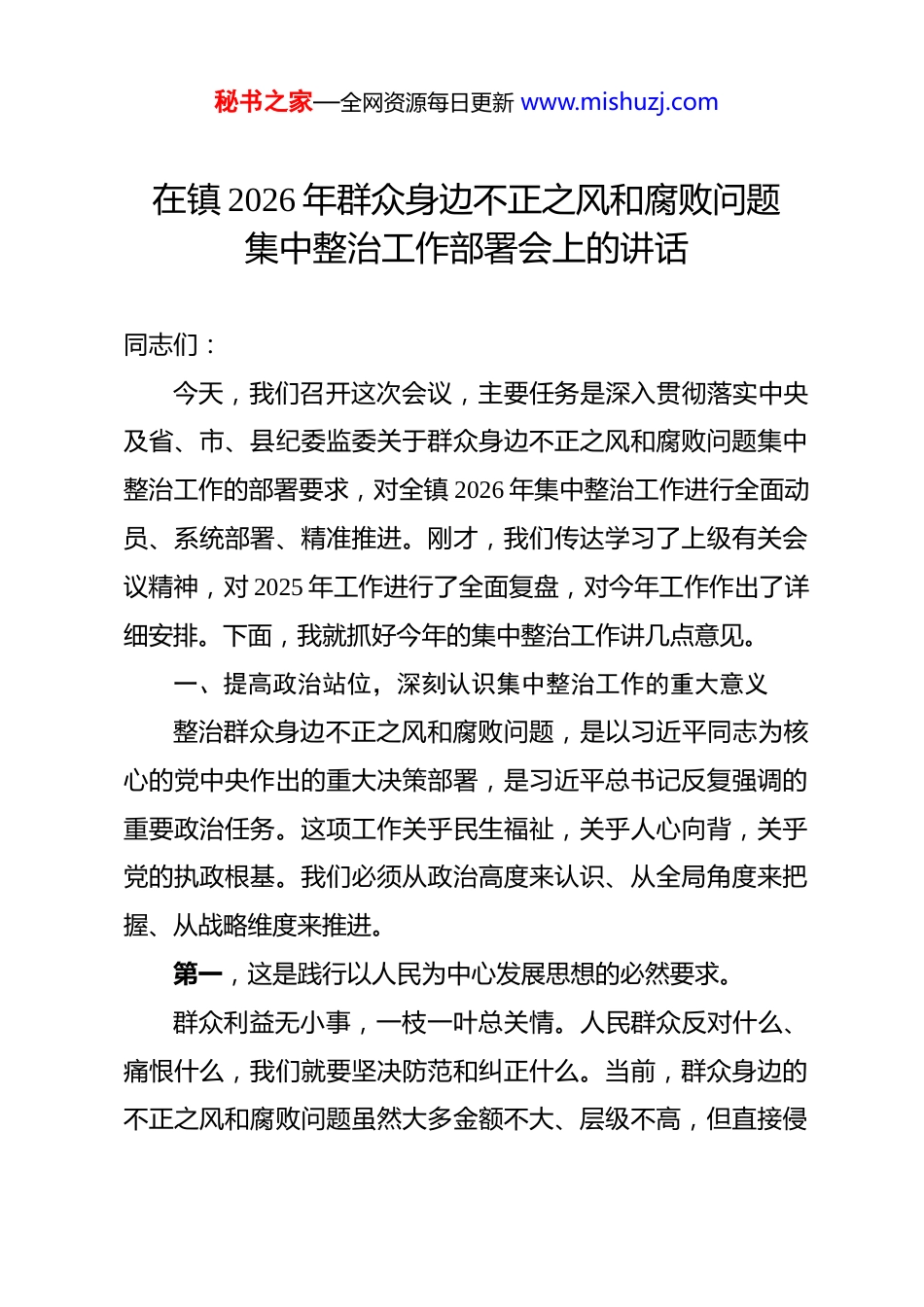 秘书之家—全网资源每日更新 www.mishuzj.com在镇 2026 年群众身边不正之风和腐败问题集中整治工作部署会上的讲话 同志们:今天,我们召开这次会议,主要任务是深入贯彻落实中央及省、市、县纪委监委关于群众身边不正之风和腐败问题集中整治工作的部署要求,对全镇 2026 年集中整治工作进行全面动员、系统部署、精准推进。刚才,我们传达学习了上级有关会议精神,对 2025 年工作进行了全面复盘,对今年工作作出了详细安排。下面,我就抓好今年的集中整治工作讲几点意见。一、提高政治站位,深刻认识集中整治工作的重大意义整治群众身边不正之风和腐败问题,是以习近平同志为核心的党中央作出的重大决策部署,是习近平总书记反复强调的重要政治任务。这项工作关乎民生福祉,关乎人心向背,关乎党的执政根基。我们必须从政治高度来认识、从全局角度来把握、从战略维度来推进。第一,这是践行以人民为中心发展思想的必然要求。群众利益无小事,一枝一叶总关情。人民群众反对什么、痛恨什么,我们就要坚决防范和纠正什么。当前,群众身边的不正之风和腐败问题虽然大多金额不大、层级不高,但直接侵秘书之家—全网资源每日更新 www.mishuzj.com害群众切身利益,直接损害党群干群关系,群众看得见、摸得着、感受最直接、最深恶痛绝。如果我们对这些问题视而不见、听之任之,就会严重侵蚀党执政的群众基础,严重影响党和政府在人民群众心目中的形象。我们必须始终把人民放在心中最高位置,把解决群众急难愁盼问题作为工作的出发点和落脚点,以实际行动回应人民群众的期盼。第二,这是推进全面从严治党向基层延伸的重要举措。近年来,反腐败斗争取得压倒性胜利并全面巩固,但基层腐败问题仍然易发多发,“蝇贪蚁腐”现象依然存在。有的基层干部在惠民资金上动手脚、玩猫腻,有的在农村集体“三资”管理上做文章、谋私利,有的在民生项目审批中吃拿卡要、优亲厚友,有的在服务群众过程中推诿扯皮、敷衍塞责。这些问题虽然发生在基层,但危害极大,不仅侵害群众利益,而且损害党和政府形象,影响社会公平正义。我们必须以更大力度、更实举措推进全面从严治党向基层延伸,坚决查处群众身边的“蝇贪蚁腐”,让群众感受到正风肃纪反腐就在身边。第三,这是推动基层治理体系和治理能力现代化的现实需要。基层是国家治理的神经末梢,也是服务群众的“最后一公里”。群众身边不正之风和腐败问题的存在,暴露出我们在基层治理中还存在制度不完善、监督不到位、机制不健全等短板。秘书之家—全网资源每日更新 www.mishuzj.com通过集中整治,既要解决突出问题,又要堵塞制度漏洞,既要治标、更要治本,推动构建长效常治的基层治理体系。我们要把集中整治工作作为推动基层治理体系和治理能力现代化的重要抓手,在整治中发现问题、在整改中完善制度、在实践中提升水平,不断提高基层治理的科学化、规范化、法治化水平。二、客观总结成效,清醒正视工作中存在的突出问题2025 年,全镇上下认真贯彻落实上级决策部署,坚持问题导向、目标导向、结果导向相统一,扎实推进群众身边不正之风和腐败问题集中整治工作,取得了阶段性成效。一是案件查办有力度。全年共受理群众信访举报 36 件,初核问题线索 28 条,立案查处违纪违法案件 12 起,给予党纪政务处分 15 人,组织处理 8 人,追缴违规资金 27.6 万元,退还群众资金 13.2 万元。二是民生实事有温度。围绕群众反映强烈的突出问题,推动解决了一批历史遗留问题和现实困难,完成惠民实事项目 23 个,惠及群众 1.2 万余人,群众满意度明显提升。三是制度建设有深度。针对整治中发现的制度漏洞和监管盲区,建立健全各类制度规定 11 项,形成了靠制度管人管事管权的良好局面。在肯定秘书之家—全网资源每日更新 www.mishuzj.com成绩的同时,我们也要清醒地看到,当前工作中还存在不少问题和短板:从线索挖掘来看,主动发现问题的能力还不强,信访举报渠道还不够畅通,有的村、社区存在报喜不报忧、遮掩问题的现象,深层次、隐蔽性问题挖掘不够,群众反映强烈的问题没有得到及时发现和查处。从监督合力来看,纪检监察监督与职能...