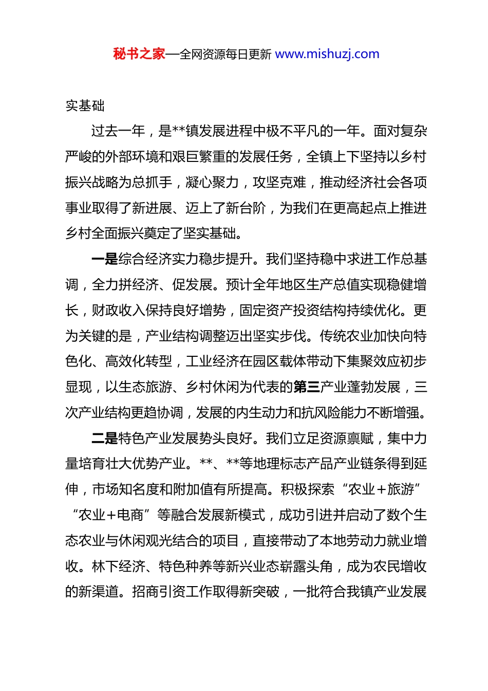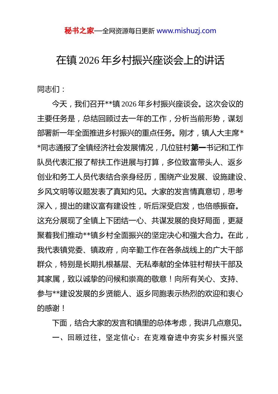 秘书之家—全网资源每日更新 www.mishuzj.com在镇 2026 年乡村振兴座谈会上的讲话 同志们:今天,我们召开**镇 2026 年乡村振兴座谈会。这次会议的主要任务是,总结回顾过去一年的工作,分析当前形势,谋划部署新一年全面推进乡村振兴的重点任务。刚才,镇人大主席**同志通报了全镇经济社会发展情况,几位驻村第一书记和工作队员代表汇报了帮扶工作进展与打算,多位致富带头人、返乡创业和务工人员代表结合亲身经历,围绕产业发展、设施建设、乡风文明等议题发表了真知灼见。大家的发言情真意切,思考深入,提出的建议富有建设性,听后深受启发,也倍感振奋。这充分展现了全镇上下团结一心、共谋发展的良好局面,更凝聚着我们推动**镇乡村全面振兴的坚定决心和强大合力。在此,我代表镇党委、镇政府,向辛勤工作在各条战线上的广大干部群众,特别是长期扎根基层、无私奉献的全体驻村帮扶干部及其家属,致以诚挚的问候和崇高的敬意!向所有关心、支持、参与**建设发展的乡贤能人、返乡同胞表示热烈的欢迎和衷心的感谢!下面,结合大家的发言和镇里的总体考虑,我讲几点意见。一、回顾过往,坚定信心:在克难奋进中夯实乡村振兴坚秘书之家—全网资源每日更新 www.mishuzj.com实基础过去一年,是**镇发展进程中极不平凡的一年。面对复杂严峻的外部环境和艰巨繁重的发展任务,全镇上下坚持以乡村振兴战略为总抓手,凝心聚力,攻坚克难,推动经济社会各项事业取得了新进展、迈上了新台阶,为我们在更高起点上推进乡村全面振兴奠定了坚实基础。一是综合经济实力稳步提升。我们坚持稳中求进工作总基调,全力拼经济、促发展。预计全年地区生产总值实现稳健增长,财政收入保持良好增势,固定资产投资结构持续优化。更为关键的是,产业结构调整迈出坚实步伐。传统农业加快向特色化、高效化转型,工业经济在园区载体带动下集聚效应初步显现,以生态旅游、乡村休闲为代表的第三产业蓬勃发展,三次产业结构更趋协调,发展的内生动力和抗风险能力不断增强。二是特色产业发展势头良好。我们立足资源禀赋,集中力量培育壮大优势产业。**、**等地理标志产品产业链条得到延伸,市场知名度和附加值有所提高。积极探索“农业+旅游”“农业+电商”等融合发展新模式,成功引进并启动了数个生态农业与休闲观光结合的项目,直接带动了本地劳动力就业增收。林下经济、特色种养等新兴业态崭露头角,成为农民增收的新渠道。招商引资工作取得新突破,一批符合我镇产业发展秘书之家—全网资源每日更新 www.mishuzj.com方向、带动能力强的项目正在洽谈或落地建设中,为产业升级注入了新动能。三是人居环境面貌持续改善。我们以农村人居环境整治提升行动为主线,下大力气补短板、优环境。全面推进农村“厕所革命”、生活垃圾处理和污水治理“三大革命”,新建和改造了一批卫生厕所,生活垃圾收运处置体系基本实现全覆盖,数个村庄的污水处理设施建成投用。深入推进村庄清洁行动和绿化美化工程,村容村貌得到显著提升。同时,基础设施网络不断完善,实施了一批农村公路改造提升、农田水利设施修复、电网通信升级等项目,群众生产生活条件更加便利。四是民生福祉保障更加有力。我们始终坚持以人民为中心的发展思想,将财力向民生领域倾斜。教育、医疗、养老等基本公共服务水平稳步提升,完成镇中心小学教学楼加固和卫生院部分设备更新。社会保障网进一步织密扎牢,困难群众救助力度加大。通过产业发展、公益性岗位安置、技能培训等多种途径,有效促进了农村劳动力就地就近就业,全镇就业形势保持稳定。一批群众反映强烈的急难愁盼问题得到解决,人民群众的获得感、幸福感、安全感切实增强。五是乡村治理效能有效提升。我们强化党建引领,健全党组织领导下的自治、法治、德治相结合的乡村治理体系。新时秘书之家—全网资源每日更新 www.mishuzj.com代文明实践所(站)活动深入开展,移风易俗持续推进,文明乡风、良好家风、淳朴民风不断弘扬。平安乡村建设深化,矛盾纠纷排查化解机制更加健全,社会大局保持和谐稳定。驻村帮扶工作扎实有效,各驻村工作队扎根一线,在建强村党组织、推进强村富民、提升治理水...
