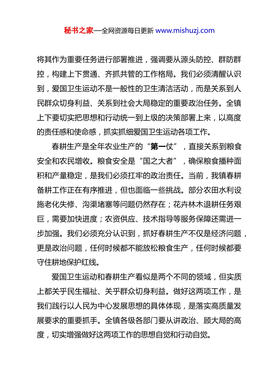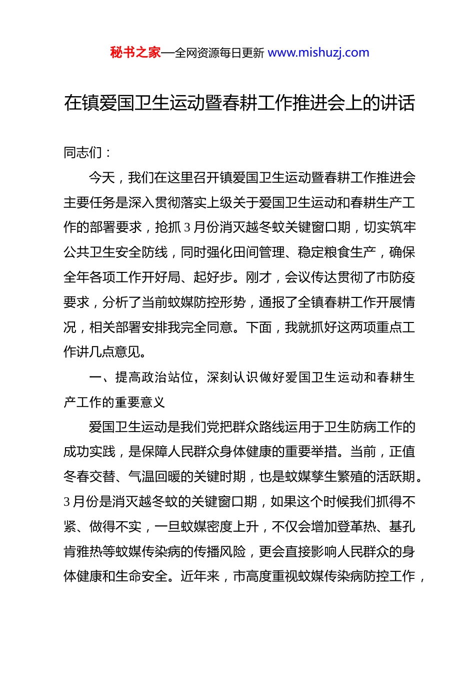 秘书之家—全网资源每日更新 www.mishuzj.com在镇爱国卫生运动暨春耕工作推进会上的讲话 同志们:今天,我们在这里召开镇爱国卫生运动暨春耕工作推进会主要任务是深入贯彻落实上级关于爱国卫生运动和春耕生产工作的部署要求,抢抓 3 月份消灭越冬蚊关键窗口期,切实筑牢公共卫生安全防线,同时强化田间管理、稳定粮食生产,确保全年各项工作开好局、起好步。刚才,会议传达贯彻了市防疫要求,分析了当前蚊媒防控形势,通报了全镇春耕工作开展情况,相关部署安排我完全同意。下面,我就抓好这两项重点工作讲几点意见。一、提高政治站位,深刻认识做好爱国卫生运动和春耕生产工作的重要意义爱国卫生运动是我们党把群众路线运用于卫生防病工作的成功实践,是保障人民群众身体健康的重要举措。当前,正值冬春交替、气温回暖的关键时期,也是蚊媒孳生繁殖的活跃期。3 月份是消灭越冬蚊的关键窗口期,如果这个时候我们抓得不紧、做得不实,一旦蚊媒密度上升,不仅会增加登革热、基孔肯雅热等蚊媒传染病的传播风险,更会直接影响人民群众的身体健康和生命安全。近年来,市高度重视蚊媒传染病防控工作,秘书之家—全网资源每日更新 www.mishuzj.com将其作为重要任务进行部署推进,强调要从源头防控、群防群控,构建上下贯通、齐抓共管的工作格局。我们必须清醒认识到,爱国卫生运动不是一般性的卫生清洁活动,而是关系到人民群众切身利益、关系到社会大局稳定的重要政治任务。全镇上下要切实把思想和行动统一到上级的决策部署上来,以高度的责任感和使命感,抓实抓细爱国卫生运动各项工作。春耕生产是全年农业生产的“第一仗”,直接关系到粮食安全和农民增收。粮食安全是“国之大者”,确保粮食播种面积和产量稳定,是我们必须扛牢的政治责任。当前,我镇春耕备耕工作正在有序推进,但也面临一些挑战。部分农田水利设施老化失修、沟渠堵塞等问题仍然存在;花卉林木退耕任务艰巨,需要加快进度;农资供应、技术指导等服务保障还需进一步加强。我们必须充分认识到,抓好春耕生产不仅是经济问题,更是政治问题,任何时候都不能放松粮食生产,任何时候都要守住耕地保护红线。爱国卫生运动和春耕生产看似是两个不同的领域,但实质上都关乎民生福祉、关乎群众切身利益。做好这两项工作,是我们践行以人民为中心发展思想的具体体现,是落实高质量发展要求的重要抓手。全镇各级各部门要从讲政治、顾大局的高度,切实增强做好这两项工作的思想自觉和行动自觉。秘书之家—全网资源每日更新 www.mishuzj.com二、聚焦重点、精准发力,全面提升爱国卫生运动工作质效做好爱国卫生运动,关键在于抓细抓实防控举措,构建上下联动、齐抓共管的工作格局。当前,我镇蚊媒防控形势依然严峻,必须坚持问题导向、目标导向,以更加有力的措施推进各项工作。第一,全面落实工作机制和防控责任。要健全完善“政府主导、联防联控、群防群控、科学防控”工作机制,压紧压实属地、部门、单位、个人“四方责任”。各位领导班子要督促分管领域、驻点村(居)以及挂钩企业按照市的统一部署,有计划、有设备、有人员地将爱卫行动、消杀任务落实到位。各职能部门要切实履行行业监管职责,指引好管辖范围的学校、医院、企业、建筑工地以及商铺落实消杀或点蚊片等措施。各村(居)要落实属地管理责任,既要分村分区域做好爱卫行动,又要发动村民参与其中,自觉做好个人防护、清理周边环境隐患。要建立完善考核评价机制,把爱国卫生运动开展情况纳入年度目标考核,对工作不力、进展缓慢的单位和个人严肃追责问责。第二,刚性执行防控措施阻断传播链条。要严格遵循“早、小、严、实”原则,分级分类落实防控措施。“早”就是要早秘书之家—全网资源每日更新 www.mishuzj.com发现、早报告、早处置,把问题解决在萌芽状态;“小”就是要从小处着手,不放过任何一个蚊虫孳生地;“严”就是要严格执行各项防控标准,不打折扣、不搞变通;“实”就是要务求实效,确保各项措施落地见效。要刚性执行“两个消杀周”计划,对重点区域规范消杀,全面排查清理蚊虫孳生地,做到全覆盖、无死角。要突出重点场所,加强对居民区、工地、...