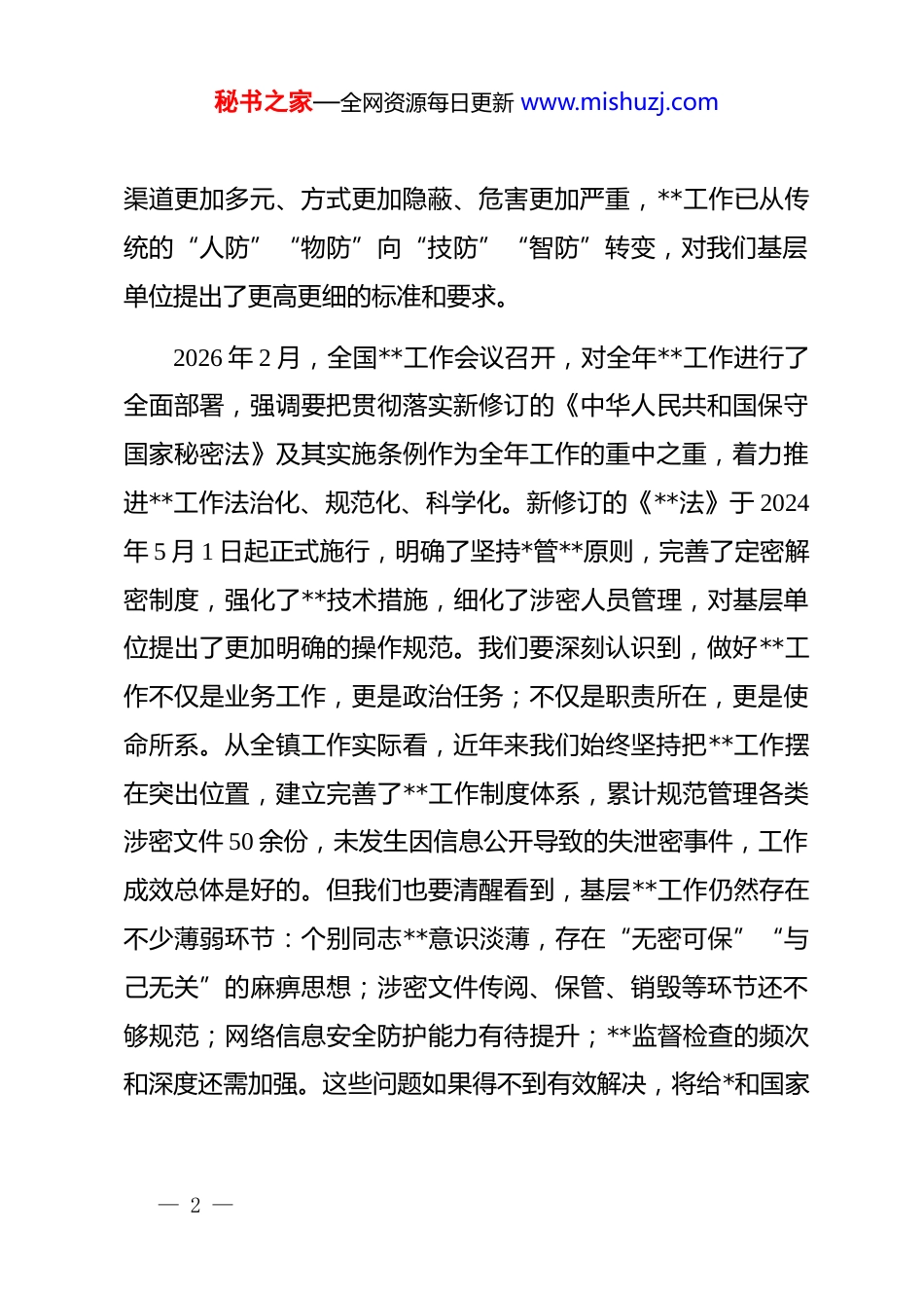 秘书之家—全网资源每日更新 www.mishuzj.com在镇**工作专题推进会议上的讲话同志们:今天,我们召开这次**工作专题推进会议,主要任务是深入贯彻落实上级**工作决策部署,全面提升全镇**工作规范化、科学化水平,确保*和国家秘密安全。刚才,**传达学习了上级**工作相关会议及文件精神,围绕**工作基本常识、涉密载体全流程管理、网络信息安全防护等内容进行了系统解读,结合近期发生的基层失泄密典型案例,深入剖析了微信办公泄密、文件违规传阅等常见风险点,讲得很全面、很深刻、很有针对性。希望大家认真学习领会,抓好贯彻落实。下面,我就做好全镇**工作讲几点意见。一、认清形势,提高站位,深刻把握**工作的极端重要性**工作是*和国家事业的重要组成部分,是维护国家安全和利益的重要保障。当前,世界百年未有之大变局加速演进,国际形势复杂严峻,传统安全威胁与非传统安全威胁相互交织,**工作面临的挑战前所未有。特别是随着信息化、数字化的快速发展,大数据、云计算、人工智能等新技术广泛应用,失泄密— 1 —秘书之家—全网资源每日更新 www.mishuzj.com渠道更加多元、方式更加隐蔽、危害更加严重,**工作已从传统的“人防”“物防”向“技防”“智防”转变,对我们基层单位提出了更高更细的标准和要求。2026 年 2 月,全国**工作会议召开,对全年**工作进行了全面部署,强调要把贯彻落实新修订的《中华人民共和国保守国家秘密法》及其实施条例作为全年工作的重中之重,着力推进**工作法治化、规范化、科学化。新修订的《**法》于 2024年 5 月 1 日起正式施行,明确了坚持*管**原则,完善了定密解密制度,强化了**技术措施,细化了涉密人员管理,对基层单位提出了更加明确的操作规范。我们要深刻认识到,做好**工作不仅是业务工作,更是政治任务;不仅是职责所在,更是使命所系。从全镇工作实际看,近年来我们始终坚持把**工作摆在突出位置,建立完善了**工作制度体系,累计规范管理各类涉密文件 50 余份,未发生因信息公开导致的失泄密事件,工作成效总体是好的。但我们也要清醒看到,基层**工作仍然存在不少薄弱环节:个别同志**意识淡薄,存在“无密可保”“与己无关”的麻痹思想;涉密文件传阅、保管、销毁等环节还不够规范;网络信息安全防护能力有待提升;**监督检查的频次和深度还需加强。这些问题如果得不到有效解决,将给*和国家— 2 —秘书之家—全网资源每日更新 www.mishuzj.com秘密安全带来严重隐患,我们必须高度重视、认真整改。二、正视问题,刀刃向内,清醒认识当前**工作存在的短板弱项在肯定成绩的同时,我们必须实事求是地分析存在的问题和不足。从上级检查反馈和自查情况看,我镇**工作还存在以下几个方面的问题:第一,思想认识还不够到位。部分干部职工对**工作的极端重要性认识不足,认为乡镇层面“没什么秘密可保”,把**工作当成“软任务”而非“硬杠杠”,在日常工作中存在侥幸心理和麻痹思想。有的同志在微信、qq 等社交软件上随意谈论工作内容,有的将涉密文件带出办公场所,有的对涉密载体的管理不够严格,这些行为都埋下了严重的安全隐患。第二,制度执行还不够严格。虽然我们建立了**工作制度,但在实际执行中还存在“宽松软”的问题。涉密文件的收发、登记、传阅、保管、销毁等环节还不够规范,存在登记不及时、传阅无记录、保管无专柜、销毁无审批等现象。部分涉密载体的全流程管理存在脱节,从生成、使用、存储到销毁的闭环管理机制还不够健全。— 3 —秘书之家—全网资源每日更新 www.mishuzj.com第三,技术防护还不够有力。随着信息技术的快速发展,网络信息安全防护面临新的挑战。部分涉密计算机未按规定设置强口令,有的甚至存在空口令现象;个别单位存在涉密设备与非涉密设备交叉使用的问题;网络安全防护手段还比较单一,防病毒软件、防火墙等技术防护措施还不够完善;数据防泄密系统的部署和应用还处于起步阶段。第四,监督检查还不够深入。**工作与业务工作同部署、同检查、同考核的要求落实还不够到位,监督检查的频次和覆盖面还有差距。从相关单位的实践经验看,部署数据防泄密系统后,泄密事件...