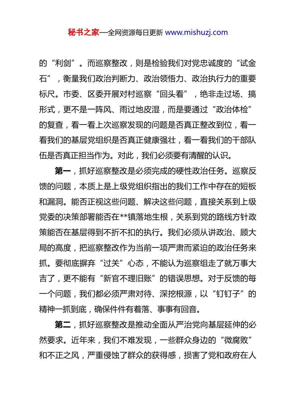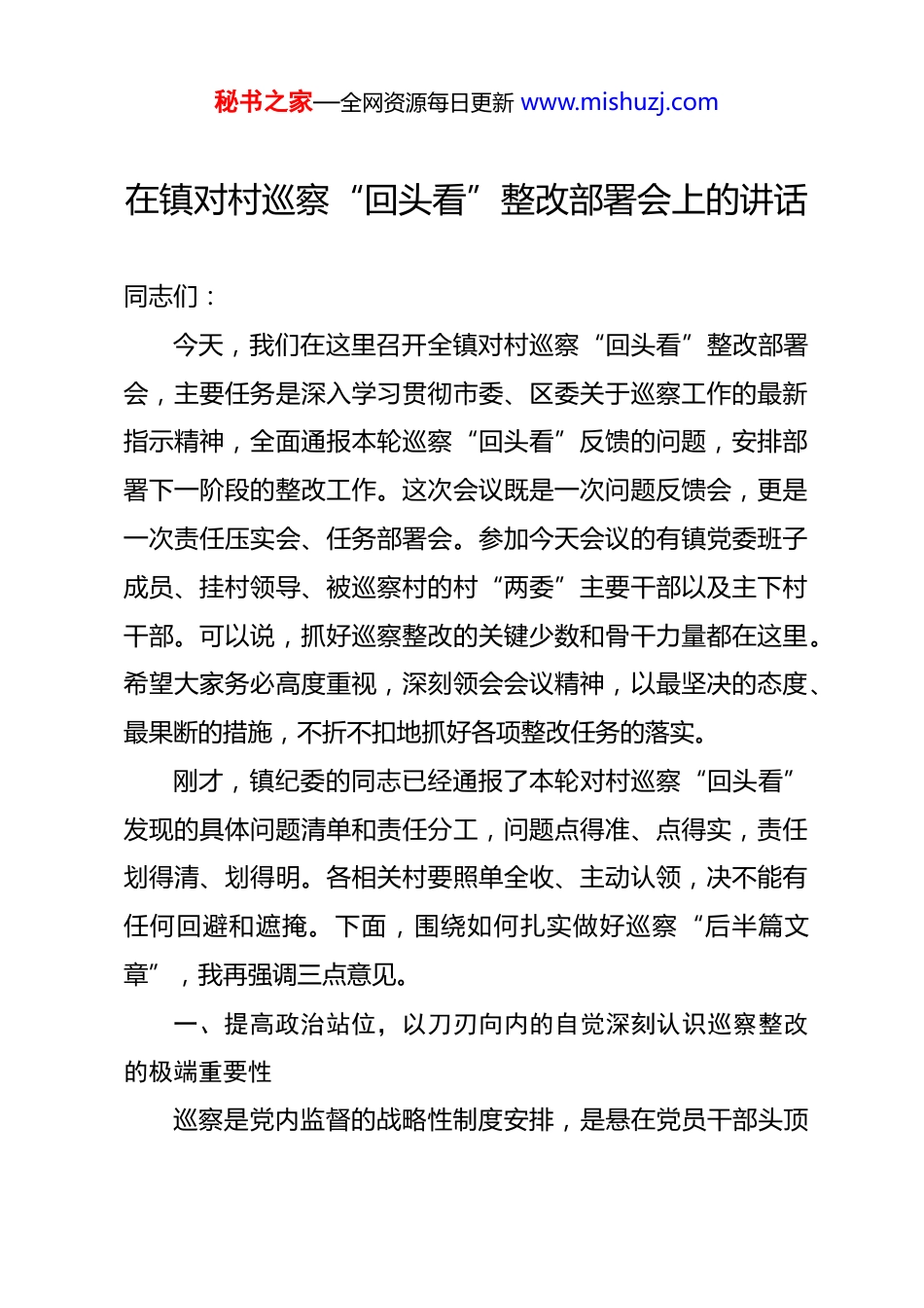 秘书之家—全网资源每日更新 www.mishuzj.com在镇对村巡察“回头看”整改部署会上的讲话 同志们:今天,我们在这里召开全镇对村巡察“回头看”整改部署会,主要任务是深入学习贯彻市委、区委关于巡察工作的最新指示精神,全面通报本轮巡察“回头看”反馈的问题,安排部署下一阶段的整改工作。这次会议既是一次问题反馈会,更是一次责任压实会、任务部署会。参加今天会议的有镇党委班子成员、挂村领导、被巡察村的村“两委”主要干部以及主下村干部。可以说,抓好巡察整改的关键少数和骨干力量都在这里。希望大家务必高度重视,深刻领会会议精神,以最坚决的态度、最果断的措施,不折不扣地抓好各项整改任务的落实。刚才,镇纪委的同志已经通报了本轮对村巡察“回头看”发现的具体问题清单和责任分工,问题点得准、点得实,责任划得清、划得明。各相关村要照单全收、主动认领,决不能有任何回避和遮掩。下面,围绕如何扎实做好巡察“后半篇文章”,我再强调三点意见。一、提高政治站位,以刀刃向内的自觉深刻认识巡察整改的极端重要性巡察是党内监督的战略性制度安排,是悬在党员干部头顶秘书之家—全网资源每日更新 www.mishuzj.com的“利剑”。而巡察整改,则是检验我们对党忠诚度的“试金石”,衡量我们政治判断力、政治领悟力、政治执行力的重要标尺。市委、区委开展对村巡察“回头看”,绝非走过场、搞形式,更不是一阵风、雨过地皮湿,而是要通过“政治体检”的复查,看一看上次巡察发现的问题是否真正整改到位,看一看我们的基层党组织是否真正健康强壮,看一看我们的干部队伍是否真正担当作为。对此,我们必须要有清醒的认识。第一,抓好巡察整改是必须完成的硬性政治任务。巡察反馈的问题,本质上是上级党组织指出的我们工作中存在的短板和漏洞。能否正视这些问题、解决这些问题,直接关系到上级党委的决策部署能否在**镇落地生根,关系到党的路线方针政策能否在基层得到不折不扣的执行。我们必须从讲政治、顾大局的高度,把巡察整改作为当前一项严肃而紧迫的政治任务来抓。要彻底摒弃“过关”心态,不能认为巡察组走了就万事大吉了,更不能有“新官不理旧账”的错误思想。对于反馈的每一个问题,我们都必须严肃对待、深挖根源,以“钉钉子”的精神一抓到底,确保件件有着落、事事有回音。第二,抓好巡察整改是推动全面从严治党向基层延伸的必然要求。近年来,我们不难发现,一些群众身边的“微腐败”和不正之风,严重侵蚀了群众的获得感,损害了党和政府在人秘书之家—全网资源每日更新 www.mishuzj.com民群众心中的形象。巡察“回头看”发现的问题,很多都集中在村级财务管理不规范、重大事项决策不民主、惠民政策落实不到位等领域,这些都是基层治理的薄弱环节,也是全面从严治党需要持续发力的重点。我们必须通过此次整改,坚决整治群众反映强烈的突出问题,让全面从严治党的压力层层传导到“神经末梢”,让铁的纪律真正在基层立起来、严起来,持续净化基层政治生态。第三,抓好巡察整改是提升基层治理能力、夯实乡村振兴基础的现实需要。当前,**镇正处在全面推进乡村振兴、加快高质量发展的关键时期。基础不牢,地动山摇。村级组织作为党在农村全部工作和战斗力的基础,其治理能力的强弱,直接决定了我们乡村振兴的成色。巡察反馈的问题,恰恰是我们加强基层组织建设、提升治理水平的最好契机。我们必须把整改过程变成一个补短板、强弱项、堵漏洞、建机制的过程,通过解决一个问题,带动规范一个领域,完善一套制度,真正把巡察整改的成果转化为推动基层治理提质增效的强大动力,为全镇的乡村振兴事业筑牢坚实的组织保障和制度保障。二、压实主体责任,以动真碰硬的担当全面落实巡察整改的各项举措问题已经摆在面前,任务已经非常明确。接下来,关键就秘书之家—全网资源每日更新 www.mishuzj.com在于落实。如果整改工作抓得不紧不实,责任压得不严不牢,那么再好的方案也只是一纸空文。全镇上下必须迅速行动起来,以最严格的标准、最有力的举措,确保整改工作取得实实在在的成效。第一,要构建一个“横向到边、纵向到底”的责任体系。抓好巡察整改,责任是关键...