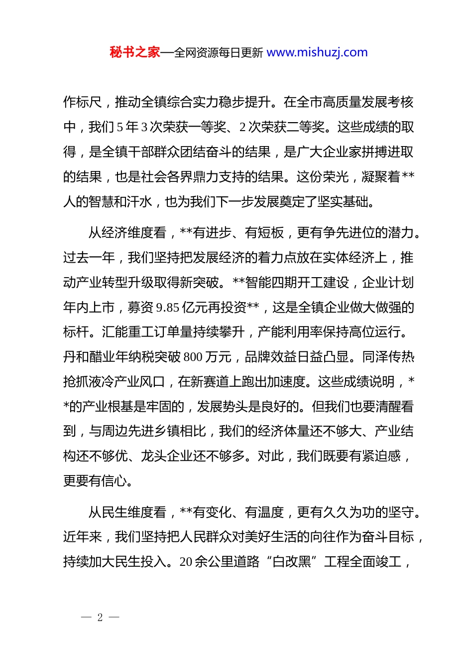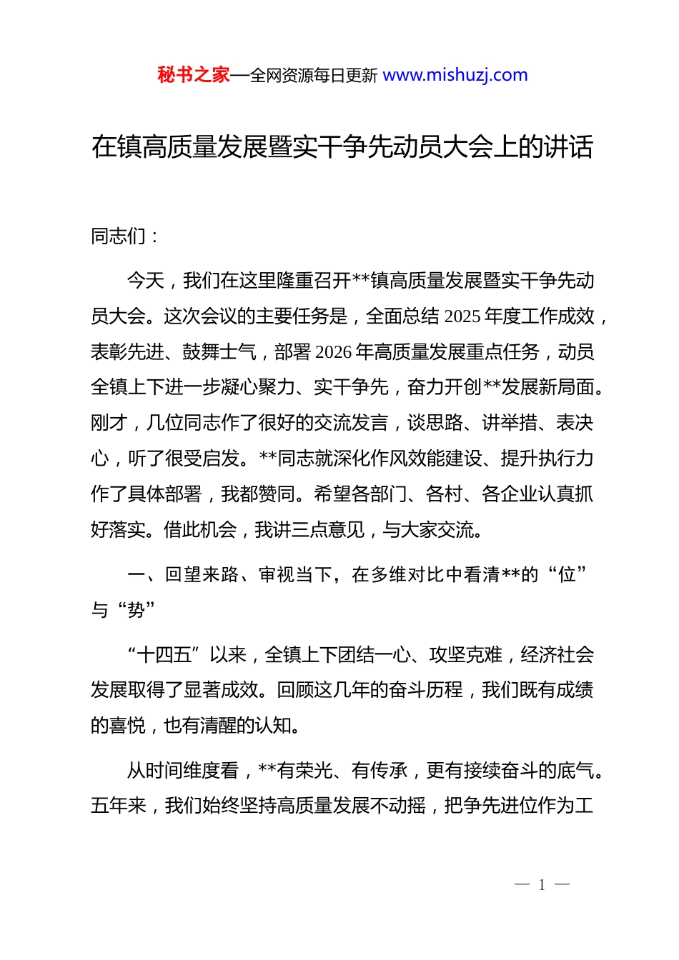 秘书之家—全网资源每日更新 www.mishuzj.com在镇高质量发展暨实干争先动员大会上的讲话同志们:今天,我们在这里隆重召开**镇高质量发展暨实干争先动员大会。这次会议的主要任务是,全面总结 2025 年度工作成效,表彰先进、鼓舞士气,部署 2026 年高质量发展重点任务,动员全镇上下进一步凝心聚力、实干争先,奋力开创**发展新局面。刚才,几位同志作了很好的交流发言,谈思路、讲举措、表决心,听了很受启发。**同志就深化作风效能建设、提升执行力作了具体部署,我都赞同。希望各部门、各村、各企业认真抓好落实。借此机会,我讲三点意见,与大家交流。一、回望来路、审视当下,在多维对比中看清**的“位”与“势”“十四五”以来,全镇上下团结一心、攻坚克难,经济社会发展取得了显著成效。回顾这几年的奋斗历程,我们既有成绩的喜悦,也有清醒的认知。从时间维度看,**有荣光、有传承,更有接续奋斗的底气。五年来,我们始终坚持高质量发展不动摇,把争先进位作为工— 1 —秘书之家—全网资源每日更新 www.mishuzj.com作标尺,推动全镇综合实力稳步提升。在全市高质量发展考核中,我们 5 年 3 次荣获一等奖、2 次荣获二等奖。这些成绩的取得,是全镇干部群众团结奋斗的结果,是广大企业家拼搏进取的结果,也是社会各界鼎力支持的结果。这份荣光,凝聚着**人的智慧和汗水,也为我们下一步发展奠定了坚实基础。从经济维度看,**有进步、有短板,更有争先进位的潜力。过去一年,我们坚持把发展经济的着力点放在实体经济上,推动产业转型升级取得新突破。**智能四期开工建设,企业计划年内上市,募资 9.85 亿元再投资**,这是全镇企业做大做强的标杆。汇能重工订单量持续攀升,产能利用率保持高位运行。丹和醋业年纳税突破 800 万元,品牌效益日益凸显。同泽传热抢抓液冷产业风口,在新赛道上跑出加速度。这些成绩说明,**的产业根基是牢固的,发展势头是良好的。但我们也要清醒看到,与周边先进乡镇相比,我们的经济体量还不够大、产业结构还不够优、龙头企业还不够多。对此,我们既要有紧迫感,更要有信心。从民生维度看,**有变化、有温度,更有久久为功的坚守。近年来,我们坚持把人民群众对美好生活的向往作为奋斗目标,持续加大民生投入。20 余公里道路“白改黑”工程全面竣工,— 2 —秘书之家—全网资源每日更新 www.mishuzj.com群众出行更加便捷。丹金路污水管网建成投用,集镇功能持续完善。**卫生院新住院大楼建成投用,基层医疗条件显著改善。这些看得见、摸得着的变化,让群众切实感受到了发展带来的实惠。同时,我们也要看到,群众对美好生活的期待在不断提高,我们在教育、医疗、养老等领域还存在不少短板,需要持续用劲、久久为功。从文化维度看,**有认同、有期盼,更有重塑形象的紧迫。**历史悠久、人文荟萃,有着深厚的文化底蕴。香醋酿造技艺代代相传,面粉加工产业特色鲜明,这些都是我们的宝贵财富。但在新时代背景下,如何把资源优势转化为发展优势,把文化底蕴转化为品牌影响力,还需要我们做大量工作。我们鲜明提出:**要振兴,必靠产业兴;**要进位,必靠项目进!这既是我们的发展理念,更是我们的行动宣言。二、认清机遇、直面挑战,在理性分析中把准**的“时”与“路”当前,**发展正处在爬坡过坎、滚石上山的关键时期。我们既要看到难得的历史机遇,也要正视面临的困难挑战,在变局中开新局,在危机中育新机。— 3 —秘书之家—全网资源每日更新 www.mishuzj.com一方面,机遇前所未有,必须抢抓风口、主动作为。从区位优势看,重大基础设施项目加速落地,正在重塑**的发展格局。丹金高速**段已正式进场施工,这条高速公路是国家和江苏省重点交通基础设施项目,设计为双向六车道,设计速度120 公里/小时,全长约 41 公里,其中丹阳段约 28.6 公里,总投资超过 145 亿元。项目建成后,**将实现 15 分钟内便捷上高速,与周边城市联系将更加紧密,物流成本将大幅降低,区域一体化发展将迈出实质性步伐。s358 东延项目也在加快谋划推进,这条一级公路全长约 17.7 公里,设计时速 80 公里,建成后将进一步优化我镇...