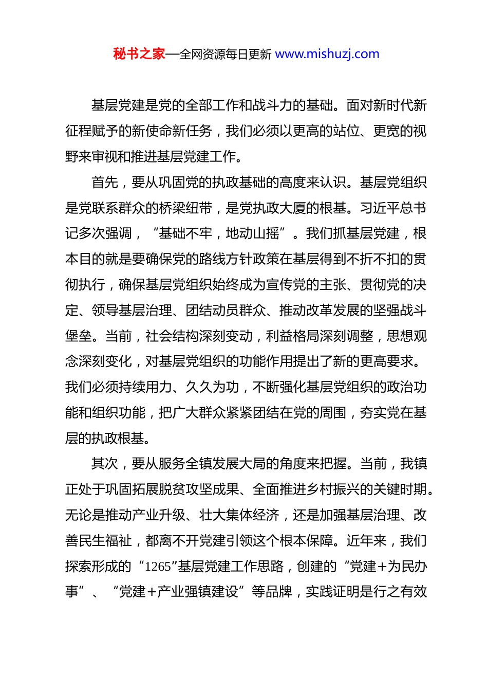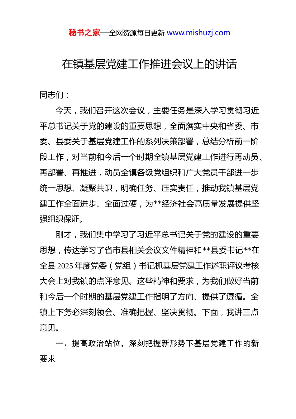 秘书之家—全网资源每日更新 www.mishuzj.com在镇基层党建工作推进会议上的讲话 同志们:今天,我们召开这次会议,主要任务是深入学习贯彻习近平总书记关于党的建设的重要思想,全面落实中央和省委、市委、县委关于基层党建工作的系列决策部署,总结分析前一阶段工作,对当前和今后一个时期全镇基层党建工作进行再动员、再部署、再推进,动员全镇各级党组织和广大党员干部进一步统一思想、凝聚共识,明确任务、压实责任,推动我镇基层党建工作全面进步、全面过硬,为**经济社会高质量发展提供坚强组织保证。刚才,我们集中学习了习近平总书记关于党的建设的重要思想,传达学习了省市县相关会议文件精神和**县委书记**在全县 2025 年度党委(党组)书记抓基层党建工作述职评议考核大会上对我镇的点评意见。这些精神和要求,为我们做好当前和今后一个时期的基层党建工作指明了方向、提供了遵循。全镇上下务必深刻领会、准确把握、坚决贯彻。下面,我讲三点意见。一、提高政治站位,深刻把握新形势下基层党建工作的新要求秘书之家—全网资源每日更新 www.mishuzj.com基层党建是党的全部工作和战斗力的基础。面对新时代新征程赋予的新使命新任务,我们必须以更高的站位、更宽的视野来审视和推进基层党建工作。首先,要从巩固党的执政基础的高度来认识。基层党组织是党联系群众的桥梁纽带,是党执政大厦的根基。习近平总书记多次强调,“基础不牢,地动山摇”。我们抓基层党建,根本目的就是要确保党的路线方针政策在基层得到不折不扣的贯彻执行,确保基层党组织始终成为宣传党的主张、贯彻党的决定、领导基层治理、团结动员群众、推动改革发展的坚强战斗堡垒。当前,社会结构深刻变动,利益格局深刻调整,思想观念深刻变化,对基层党组织的功能作用提出了新的更高要求。我们必须持续用力、久久为功,不断强化基层党组织的政治功能和组织功能,把广大群众紧紧团结在党的周围,夯实党在基层的执政根基。其次,要从服务全镇发展大局的角度来把握。当前,我镇正处于巩固拓展脱贫攻坚成果、全面推进乡村振兴的关键时期。无论是推动产业升级、壮大集体经济,还是加强基层治理、改善民生福祉,都离不开党建引领这个根本保障。近年来,我们探索形成的“1265”基层党建工作思路,创建的“党建+为民办事”、“党建+产业强镇建设”等品牌,实践证明是行之有效秘书之家—全网资源每日更新 www.mishuzj.com的。下一步,要持续深化拓展,推动党建工作与发展实践深度融合、同频共振。要充分发挥党组织的战斗堡垒作用和党员的先锋模范作用,把党的政治优势、组织优势转化为发展优势、治理效能,以高质量党建引领保障高质量发展。再次,要从解决自身存在问题的维度来审视。对照上级要求和群众期盼,我们的基层党建工作还存在一些短板弱项。有的党组织政治生活不够严肃,“三会一课”等制度落实不够规范;有的党员教育管理不够严格,先锋模范作用发挥不充分;有的干部作风不够扎实,联系服务群众不够紧密;部分村集体经济薄弱,带动增收能力不强。**县委书记**在述职评议会上对我镇的点评意见,一针见血地指出了我们工作中存在的问题,具有很强的针对性和指导性。我们必须正视问题、直面差距,以刮骨疗毒的勇气和久久为功的韧劲,切实加以整改解决。二、聚焦重点任务,全面提升基层党建工作质量做好今年基层党建工作,要紧盯目标、聚焦重点、精准发力。要严格对照上级部署和《**县 2025 年基层党建问题整改方案》要求,抓实抓细各项工作。第一,要高标准推进当前工作,夯实全年党建根基。第一季度是全年工作的开局起步阶段,至关重要。全镇各级党组织要充分认识抓好一季度党建工作的关键作用,紧盯时间节点,秘书之家—全网资源每日更新 www.mishuzj.com压实工作责任。一要严肃党内政治生活。认真落实“三会一课”、主题党日、民主评议党员等制度,提高组织生活质量,增强政治性、时代性、原则性、战斗性。近期要精心组织开好年度组织生活会,认真开展批评与自我批评,达到统一思想、增进团结、推动工作的目的。二要加强党员教育管理。深入贯彻落实《全国党员教育培训工作规划》精神,创新教育培...