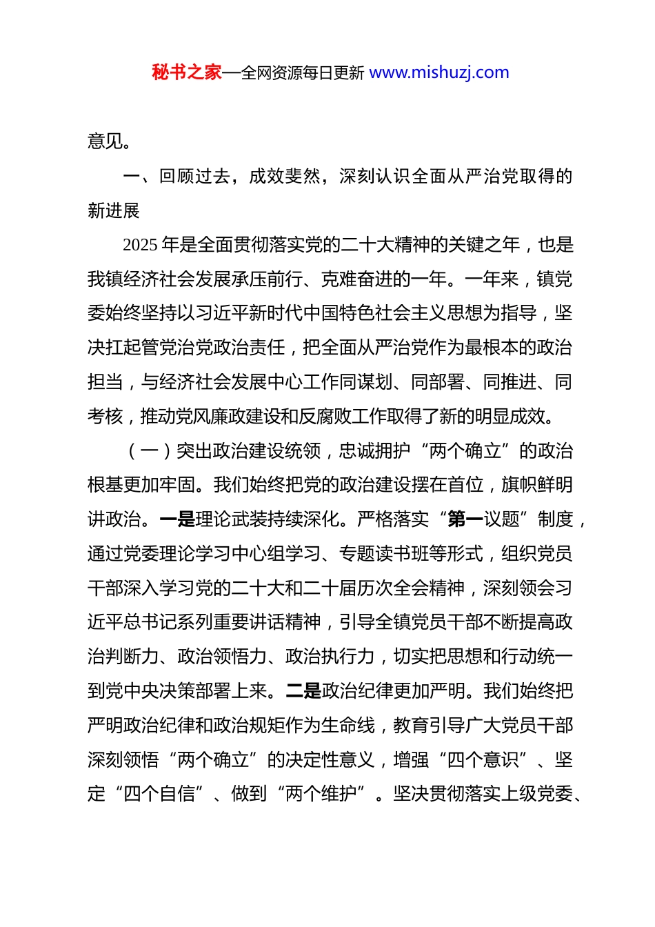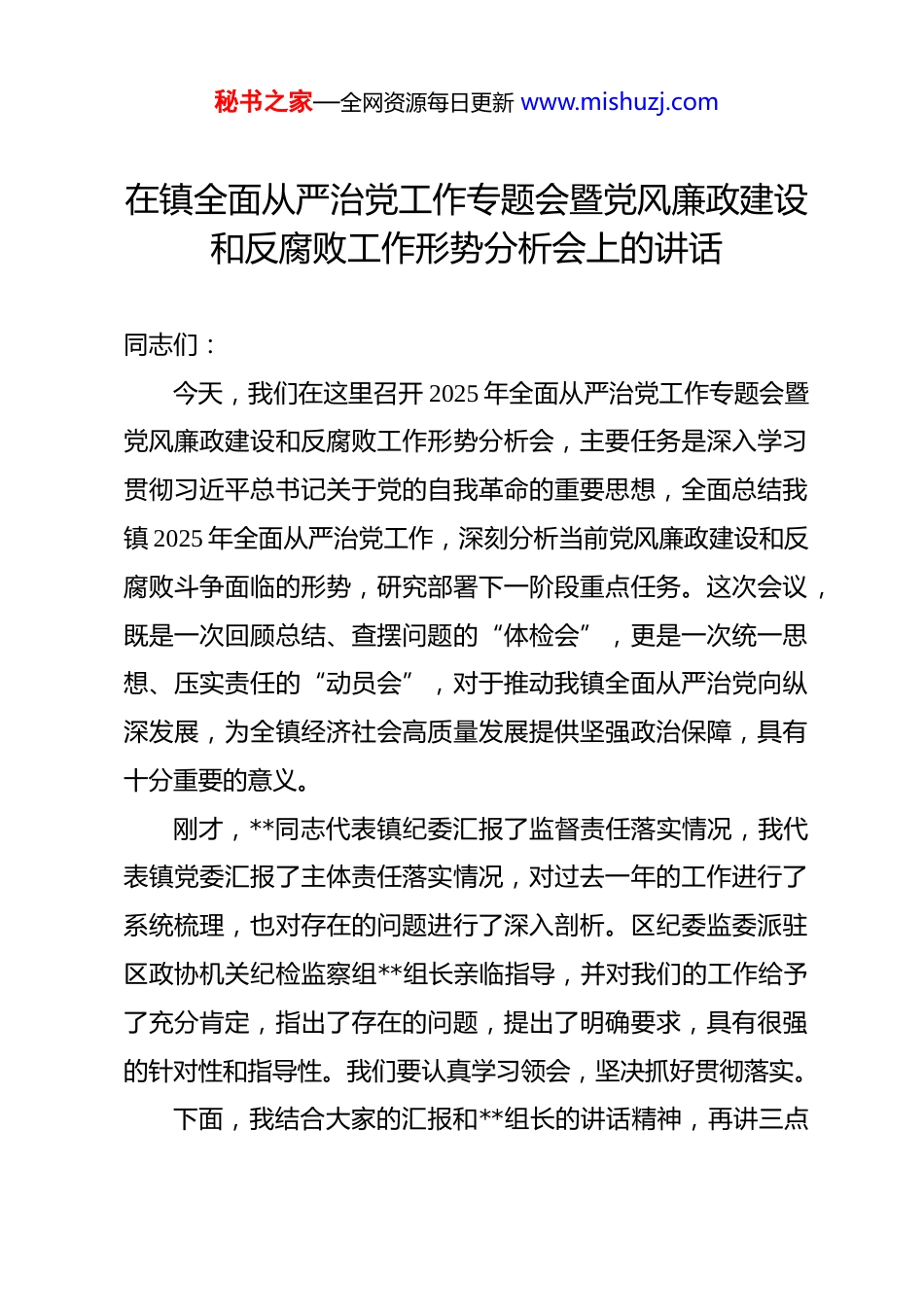 秘书之家—全网资源每日更新 www.mishuzj.com在镇全面从严治党工作专题会暨党风廉政建设和反腐败工作形势分析会上的讲话 同志们:今天,我们在这里召开 2025 年全面从严治党工作专题会暨党风廉政建设和反腐败工作形势分析会,主要任务是深入学习贯彻习近平总书记关于党的自我革命的重要思想,全面总结我镇 2025 年全面从严治党工作,深刻分析当前党风廉政建设和反腐败斗争面临的形势,研究部署下一阶段重点任务。这次会议,既是一次回顾总结、查摆问题的“体检会”,更是一次统一思想、压实责任的“动员会”,对于推动我镇全面从严治党向纵深发展,为全镇经济社会高质量发展提供坚强政治保障,具有十分重要的意义。刚才,**同志代表镇纪委汇报了监督责任落实情况,我代表镇党委汇报了主体责任落实情况,对过去一年的工作进行了系统梳理,也对存在的问题进行了深入剖析。区纪委监委派驻区政协机关纪检监察组**组长亲临指导,并对我们的工作给予了充分肯定,指出了存在的问题,提出了明确要求,具有很强的针对性和指导性。我们要认真学习领会,坚决抓好贯彻落实。下面,我结合大家的汇报和**组长的讲话精神,再讲三点秘书之家—全网资源每日更新 www.mishuzj.com意见。一、回顾过去,成效斐然,深刻认识全面从严治党取得的新进展2025 年是全面贯彻落实党的二十大精神的关键之年,也是我镇经济社会发展承压前行、克难奋进的一年。一年来,镇党委始终坚持以习近平新时代中国特色社会主义思想为指导,坚决扛起管党治党政治责任,把全面从严治党作为最根本的政治担当,与经济社会发展中心工作同谋划、同部署、同推进、同考核,推动党风廉政建设和反腐败工作取得了新的明显成效。(一)突出政治建设统领,忠诚拥护“两个确立”的政治根基更加牢固。我们始终把党的政治建设摆在首位,旗帜鲜明讲政治。一是理论武装持续深化。严格落实“第一议题”制度,通过党委理论学习中心组学习、专题读书班等形式,组织党员干部深入学习党的二十大和二十届历次全会精神,深刻领会习近平总书记系列重要讲话精神,引导全镇党员干部不断提高政治判断力、政治领悟力、政治执行力,切实把思想和行动统一到党中央决策部署上来。二是政治纪律更加严明。我们始终把严明政治纪律和政治规矩作为生命线,教育引导广大党员干部深刻领悟“两个确立”的决定性意义,增强“四个意识”、坚定“四个自信”、做到“两个维护”。坚决贯彻落实上级党委、秘书之家—全网资源每日更新 www.mishuzj.com政府的各项决策部署,确保政令畅通、令行禁止,以实际行动诠释对党的绝对忠诚。三是政治生态持续向好。通过严肃党内政治生活,严格执行民主集中制、“三重一大”事项集体决策等制度,党内政治生活的政治性、时代性、原则性、战斗性显著增强,营造了风清气正、干事创业的良好政治生态。(二)压实管党治党责任,“两个责任”同向发力的工作格局更加完善。我们牢固树立“抓好党建是最大政绩”的理念,层层传导压力,环环扣紧责任。一是主体责任扛得更稳。镇党委切实履行全面从含治党主体责任,全年召开党风廉政建设专题会议 4 次,定期分析研判形势,研究解决重大问题。我作为党委书记,认真履行“第一责任人”职责,对重要工作亲自部署、重大问题亲自过问、重点环节亲自协调。班子成员严格落实“一岗双责”,将党风廉政建设融入分管业务工作,形成了党委统一领导、党政齐抓共管、纪委组织协调、部门各负其责的工作格局。二是监督责任落得更实。镇纪委聚焦主责主业,深化运用“四种形态”,强化监督执纪问责。全年共处置问题线索 32 条,立案审查 11 件,给予党纪政务处分 13 人,挽回经济损失 120 余万元。通过精准监督、靶向执纪,释放了越往后执纪越严的强烈信号。三是制度笼子扎得更紧。我们坚持用制度管权、管事、管人,修订完善了《**镇“三重一大”事项决秘书之家—全网资源每日更新 www.mishuzj.com策制度实施办法》《**镇农村集体“三资”管理办法》等一批管长远、固根本的制度,从源头上堵塞了廉政风险漏洞。(三)深化正风肃纪反腐,激浊扬清、向上向善的发展氛围更加浓厚。我们坚持以钉钉子精神...