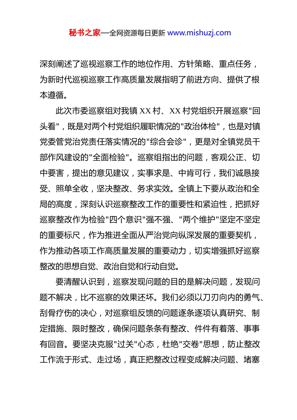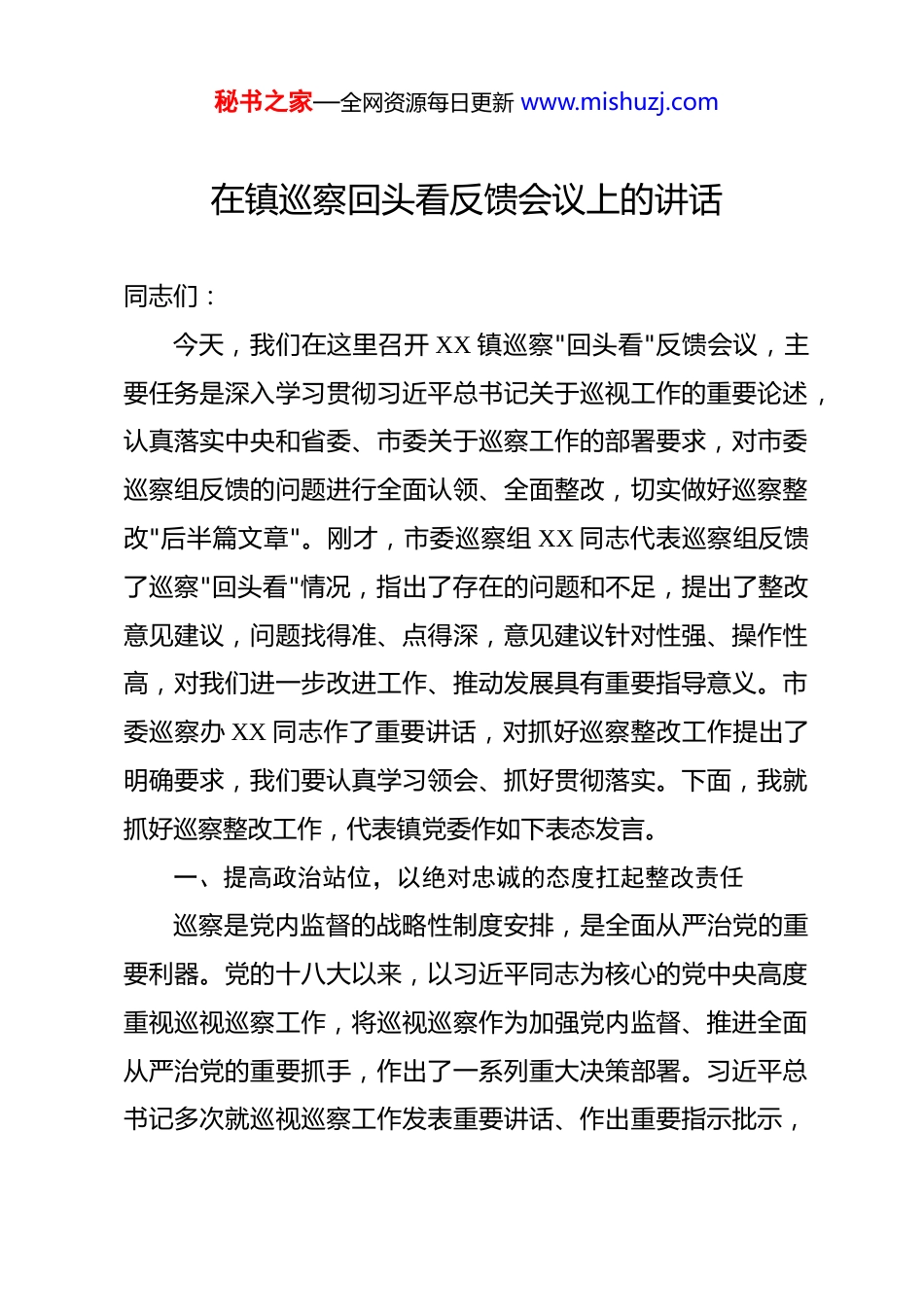 秘书之家—全网资源每日更新 www.mishuzj.com在镇巡察回头看反馈会议上的讲话 同志们:今天,我们在这里召开 XX 镇巡察"回头看"反馈会议,主要任务是深入学习贯彻习近平总书记关于巡视工作的重要论述,认真落实中央和省委、市委关于巡察工作的部署要求,对市委巡察组反馈的问题进行全面认领、全面整改,切实做好巡察整改"后半篇文章"。刚才,市委巡察组 XX 同志代表巡察组反馈了巡察"回头看"情况,指出了存在的问题和不足,提出了整改意见建议,问题找得准、点得深,意见建议针对性强、操作性高,对我们进一步改进工作、推动发展具有重要指导意义。市委巡察办 XX 同志作了重要讲话,对抓好巡察整改工作提出了明确要求,我们要认真学习领会、抓好贯彻落实。下面,我就抓好巡察整改工作,代表镇党委作如下表态发言。一、提高政治站位,以绝对忠诚的态度扛起整改责任巡察是党内监督的战略性制度安排,是全面从严治党的重要利器。党的十八大以来,以习近平同志为核心的党中央高度重视巡视巡察工作,将巡视巡察作为加强党内监督、推进全面从严治党的重要抓手,作出了一系列重大决策部署。习近平总书记多次就巡视巡察工作发表重要讲话、作出重要指示批示,秘书之家—全网资源每日更新 www.mishuzj.com深刻阐述了巡视巡察工作的地位作用、方针策略、重点任务,为新时代巡视巡察工作高质量发展指明了前进方向、提供了根本遵循。此次市委巡察组对我镇 XX 村、XX 村党组织开展巡察"回头看",既是对两个村党组织履职情况的"政治体检",也是对镇党委管党治党责任落实情况的"综合会诊",更是对全镇党员干部作风建设的"全面检验"。巡察组指出的问题,客观公正、切中要害,提出的意见建议,实事求是、中肯可行,我们诚恳接受、照单全收,坚决整改、务求实效。全镇上下要从政治和全局的高度,深刻认识巡察整改工作的重要性和紧迫性,把抓好巡察整改作为检验"四个意识"强不强、"两个维护"坚定不坚定的重要标尺,作为推进全面从严治党向纵深发展的重要契机,作为推动各项工作高质量发展的重要动力,切实增强抓好巡察整改的思想自觉、政治自觉和行动自觉。要清醒认识到,巡察发现问题的目的是解决问题,发现问题不解决,比不巡察的效果还坏。我们必须以刀刃向内的勇气、刮骨疗伤的决心,对巡察组反馈的问题逐条逐项认真研究、制定措施、限时整改,确保问题条条有整改、件件有着落、事事有回音。要坚决克服"过关"心态,杜绝"交卷"思想,防止整改工作流于形式、走过场,真正把整改过程变成解决问题、堵塞秘书之家—全网资源每日更新 www.mishuzj.com漏洞、加强管理、推动发展的过程。二、坚持问题导向,以务实有力的举措推进整改落实巡察整改是政治任务,必须以政治标准来衡量、用政治要求来落实。镇党委将切实担负起巡察整改的主体责任,成立巡察整改工作领导小组,我作为第一责任人,将亲自部署、亲自协调、亲自督办,班子成员要认真履行"一岗双责",抓好分管领域的整改工作。XX 村、XX 村党组织要承担起直接责任,村党组织书记要切实履行第一责任人职责,对整改工作负总责、亲自抓,确保整改任务按时完成、取得实效。针对巡察组反馈的问题,我们将逐项逐条进行梳理分析,建立问题清单、任务清单、责任清单,明确整改目标、整改措施、整改时限和责任人员,实行台账管理、挂图作战、销号推进。要坚持分类施策、精准发力,对能够立即解决的问题,立行立改、即知即改;对需要一定时间解决的问题,明确时间表、路线图,限期整改到位;对需要长期坚持的问题,建立长效机制,持续用力、久久为功。要坚持举一反三、标本兼治,既要解决具体问题,又要深挖问题根源,从制度机制层面堵塞漏洞、补齐短板,做到解决一个问题、完善一套制度、堵塞一批漏洞。要突出整改重点,抓住关键环节。在加强党的政治建设方面,要进一步强化理论学习,深入学习贯彻习近平新时代中国秘书之家—全网资源每日更新 www.mishuzj.com特色社会主义思想,严格落实"第一议题"制度,规范党内政治生活,提高"三会一课"质量,切实增强党组织的凝聚力、战斗力。在落实惠民政策方面,要全面排查政策落实情况,确保各项惠民政策...