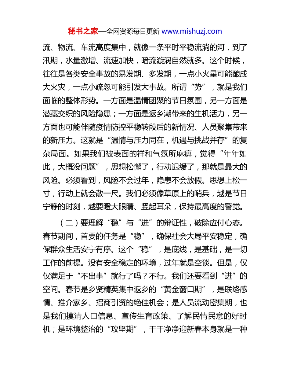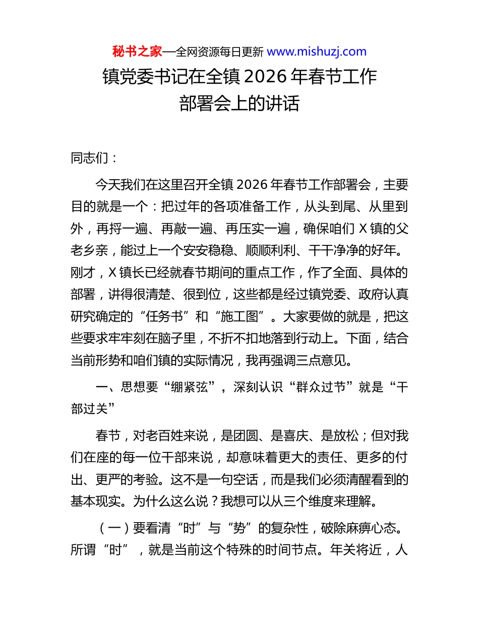 秘书之家—全网资源每日更新 www.mishuzj.com镇党委书记在全镇 2026 年春节工作部署会上的讲话同志们:今天我们在这里召开全镇 2026 年春节工作部署会,主要目的就是一个:把过年的各项准备工作,从头到尾、从里到外,再捋一遍、再敲一遍、再压实一遍,确保咱们 X 镇的父老乡亲,能过上一个安安稳稳、顺顺利利、干干净净的好年。刚才,X 镇长已经就春节期间的重点工作,作了全面、具体的部署,讲得很清楚、很到位,这些都是经过镇党委、政府认真研究确定的“任务书”和“施工图”。大家要做的就是,把这些要求牢牢刻在脑子里,不折不扣地落到行动上。下面,结合当前形势和咱们镇的实际情况,我再强调三点意见。一、思想要“绷紧弦”,深刻认识“群众过节”就是“干部过关”春节,对老百姓来说,是团圆、是喜庆、是放松;但对我们在座的每一位干部来说,却意味着更大的责任、更多的付出、更严的考验。这不是一句空话,而是我们必须清醒看到的基本现实。为什么这么说?我想可以从三个维度来理解。(一)要看清“时”与“势”的复杂性,破除麻痹心态。所谓“时”,就是当前这个特殊的时间节点。年关将近,人秘书之家—全网资源每日更新 www.mishuzj.com流、物流、车流高度集中,就像一条平时平稳流淌的河,到了汛期,水量激增、流速加快,暗流漩涡自然就多。这个时候,往往是各类安全事故的易发期、多发期,一点小火星可能酿成大火灾,一点小疏忽可能引发大事故。所谓“势”,就是我们面临的整体形势。一方面是温情团聚的节日氛围,另一方面是潜藏交织的风险隐患;一方面是返乡潮带来的生机活力,另一方面也可能伴随疫情防控平稳转段后的新情况、人员聚集带来的新压力。这就是“温情与压力同在,机遇与挑战并存”的复杂局面。如果我们被表面的祥和气氛所麻痹,觉得“年年如此,大概没问题”,思想松懈了,行动迟缓了,那就是最大的风险。必须看到,风险不会过年,隐患不会放假。思想上松一寸,行动上就会散一尺。我们必须像草原上的哨兵,越是节日宁静的时刻,越要瞪大眼睛、竖起耳朵,保持最高度的警觉。(二)要理解“稳”与“进”的辩证性,破除应付心态。春节期间,首要的任务是“稳”,确保社会大局平安稳定,确保群众生活安宁有序。这个“稳”,是底线,是基础,是一切工作的前提。没有安全稳定的环境,过年就是空谈。但是,仅仅满足于“不出事”就行了吗?不行。我们还要看到“进”的空间。春节是乡贤精英集中返乡的“黄金窗口期”,是联络感情、推介家乡、招商引资的绝佳机会;是人员流动密集期,也是我们摸清人口信息、宣传生育政策、了解民情民意的好时机;是环境整治的“攻坚期”,干干净净迎新春本身就是一种秘书之家—全网资源每日更新 www.mishuzj.com进步。所以,“稳”不是消极的守成,“进”也不是冒进的蛮干。我们要在全力“保稳定、守底线”的同时,敏锐地抓住蕴含其中的“促发展、惠民生”的机遇,把“稳”的基础打得更牢,把“进”的步伐迈得更实。不能把春节工作简单理解为“看看摊、值值班”,而要主动作为,把“假期”变成推动工作的“工期”。(三)要把握“情”与“责”的统一性,破除旁观心态。我们常说“以百姓心为心”。过年了,群众盼的是平安、是顺畅、是舒心。这份期盼,就是对我们工作最深情的嘱托。我们做好春节期间的工作,本质上就是践行以人民为中心的发展思想,就是回应群众的期盼。这份工作,带着感情去做和带着任务去做,效果截然不同。带着感情,你就会把独居老人家里的用电用火安全,当成自己父母家的事来操心;你就会把老街占道经营带来的拥堵,当成自己出门不便来着急;你就会把困难群众能不能温暖过冬,当成自己家的事来惦记。这就是“情”。而“责”,就是我们的岗位职责、党员身份赋予的使命。党员干部,就是要在群众最需要的时候站在最前面,在万家团圆的时候坚守在第一线。这份“情”与“责”是高度统一的。只有把群众的冷暖真正放在心头,我们肩上的责任才能扛得更稳、落得更实。决不能当“旁观者”“评论家”,必须要当“主攻手”“实干家”,用我们的“辛苦指数”换取群众的“幸福指数”“平安指数”。秘书之家—全网...