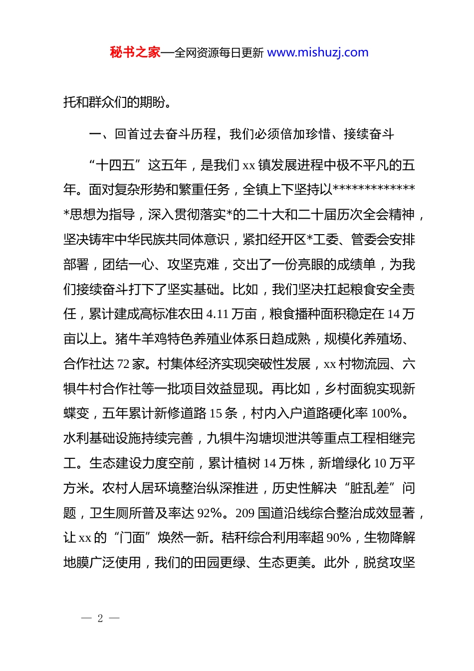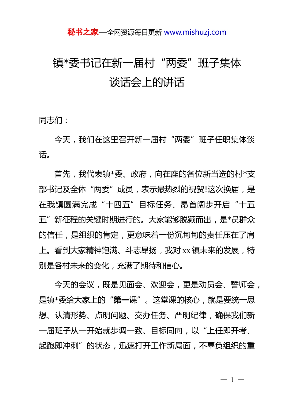 秘书之家—全网资源每日更新 www.mishuzj.com镇*委书记在新一届村“两委”班子集体谈话会上的讲话同志们:今天,我们在这里召开新一届村“两委”班子任职集体谈话。首先,我代表镇*委、政府,向在座的各位新当选的村*支部书记及全体“两委”成员,表示最热烈的祝贺!这次换届,是在我镇圆满完成“十四五”目标任务、昂首阔步开启“十五五”新征程的关键时期进行的。大家能够脱颖而出,是*员群众的信任,是组织的肯定,更意味着一份沉甸甸的责任压在了肩上。看到大家精神饱满、斗志昂扬,我对 xx 镇未来的发展,特别是各村未来的变化,充满了期待和信心。今天的会议,既是见面会、欢迎会,更是动员会、誓师会,是镇*委给大家上的“第一课”。这堂课的核心,就是要统一思想、认清形势、点明问题、交办任务、严明纪律,确保我们新一届班子从一开始就步调一致、目标同向,以“上任即开考、起跑即冲刺”的状态,迅速打开工作新局面,不辜负组织的重— 1 —秘书之家—全网资源每日更新 www.mishuzj.com托和群众们的期盼。一、回首过去奋斗历程,我们必须倍加珍惜、接续奋斗“十四五”这五年,是我们 xx 镇发展进程中极不平凡的五年。面对复杂形势和繁重任务,全镇上下坚持以**************思想为指导,深入贯彻落实*的二十大和二十届历次全会精神,坚决铸牢中华民族共同体意识,紧扣经开区*工委、管委会安排部署,团结一心、攻坚克难,交出了一份亮眼的成绩单,为我们接续奋斗打下了坚实基础。比如,我们坚决扛起粮食安全责任,累计建成高标准农田 4.11 万亩,粮食播种面积稳定在 14 万亩以上。猪牛羊鸡特色养殖业体系日趋成熟,规模化养殖场、合作社达 72 家。村集体经济实现突破性发展,xx 村物流园、六犋牛村合作社等一批项目效益显现。再比如,乡村面貌实现新蝶变,五年累计新修道路 15 条,村内入户道路硬化率 100%。水利基础设施持续完善,九犋牛沟塘坝泄洪等重点工程相继完工。生态建设力度空前,累计植树 14 万株,新增绿化 10 万平方米。农村人居环境整治纵深推进,历史性解决“脏乱差”问题,卫生厕所普及率达 92%。209 国道沿线综合整治成效显著,让 xx 的“门面”焕然一新。秸秆综合利用率超 90%,生物降解地膜广泛使用,我们的田园更绿、生态更美。此外,脱贫攻坚— 2 —秘书之家—全网资源每日更新 www.mishuzj.com成果持续巩固,35 户 82 人脱贫群众生活有保障。各类惠民补贴按时足额发放到低保户、残疾人等困难群众手中。医保参保 1.3万人,养老保险参保率 95%,4333 名被征地农民享受养老保障。更可喜的是,随着经开区的快速发展,越来越多村民实现了“家门口”就业,钱包鼓了,笑脸多了。中心校、卫生院遗留问题彻底解决,公共服务更加均衡可及。同时,刚刚过去的2025 年,我们顶住了压力,干成了不少难事。我们以坚决态度完成了中央环保督察、各级巡视巡察交办事项整改。按时完成了违规取水井的封停任务。我们保障了机场高速等一批重点项目 500 余亩土地征收,正在攻坚 s27 项目征地。我们认真推进耕地图斑、林草图斑整改。完成了大量信访积案的化解,“接诉即办”响应更快、办结率更高。安全生产、森林防火等工作扎实有效,社会大局保持和谐稳定。特别是刚刚完成的村“两委”换届,过程平稳有序,结果风清气正,为未来发展提供了坚强组织保证。同志们,回顾这些成绩,是在**************思想指引,上级*委、政府关心支持下,所有镇村干部、全体*员群众同心同德、苦干实干的结果。充分证明,xx 镇的干部队伍是想干事、能干事、也能干成事的!事实告诉我们,只要我们心往一处想、— 3 —秘书之家—全网资源每日更新 www.mishuzj.com劲往一处使,就没有克服不了的困难。今天在座的各位,接过的是基础扎实、势头向好的“接力棒”,这是我们干事创业的最大底气和最好平台,大家务必倍加珍惜,只能争光添彩,不能添堵添乱。二、正视当前存在问题,坚决破除影响发展的思想障碍与作风顽疾在肯定成绩、坚定信心的同时,我们必须保持清醒的头脑。换届完成,绝不是“歇歇脚”“松口气”的时候,相反,更繁重的发展任务、更复杂的治...