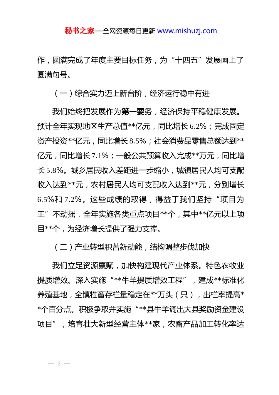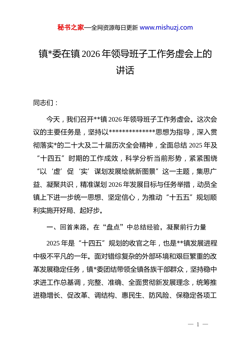 秘书之家—全网资源每日更新 www.mishuzj.com镇*委在镇 2026 年领导班子工作务虚会上的讲话同志们:今天,我们召开**镇 2026 年领导班子工作务虚会。这次会议的主要任务是,坚持以**************思想为指导,深入贯彻落实*的二十大及二十届历次全会精神,全面总结 2025 年及“十四五”时期的工作成效,科学分析当前形势,紧紧围绕“以‘虚’促‘实’谋划发展绘就新图景”这一主题,集思广益、凝聚共识,精准谋划 2026 年发展目标与任务举措,动员全镇上下进一步统一思想、坚定信心,为推动“十五五”规划顺利实施开好局、起好步。一、回首来路,在“盘点”中总结经验,凝聚前行力量2025 年是“十四五”规划的收官之年,也是**镇发展进程中极不平凡的一年。面对错综复杂的外部环境和艰巨繁重的改革发展稳定任务,镇*委团结带领全镇各族干部群众,坚持稳中求进工作总基调,完整、准确、全面贯彻新发展理念,统筹推进稳增长、促改革、调结构、惠民生、防风险、保稳定各项工— 1 —秘书之家—全网资源每日更新 www.mishuzj.com作,圆满完成了年度主要目标任务,为“十四五”发展画上了圆满句号。(一)综合实力迈上新台阶,经济运行稳中有进我们始终把发展作为第一要务,经济保持平稳健康发展。预计全年实现地区生产总值**亿元,同比增长 6.2%;完成固定资产投资**亿元,同比增长 8.5%;社会消费品零售总额达到**亿元,同比增长 7.1%;一般公共预算收入完成**万元,同比增长 5.8%。城乡居民收入差距进一步缩小,城镇居民人均可支配收入达到**元,农村居民人均可支配收入达到**元,分别增长6.5%和 7.2%。这些成绩的取得,得益于我们坚持“项目为王”不动摇,全年实施各类重点项目**个,其中**亿元以上项目**个,为经济增长提供了强力支撑。(二)产业转型积蓄新动能,结构调整步伐加快我们立足资源禀赋,加快构建现代产业体系。特色农牧业提质增效。深入实施“**牛羊提质增效工程”,建成**标准化养殖基地,全镇牲畜存栏量稳定在**万头(只),出栏率提高**个百分点。积极争取并实施“**县牛羊调出大县奖励资金建设项目”,培育壮大新型经营主体**家,农畜产品加工转化率达— 2 —秘书之家—全网资源每日更新 www.mishuzj.com到**%,产业链条进一步延伸。文旅产业融合发展。依托“**湖”、“**峡”等得天独厚的旅游资源,大力发展生态旅游和乡村旅游,**村乡村振兴示范点建设初见成效,全年接待游客**万人次,实现旅游综合收入**万元,同比增长**%,文旅融合发展的步伐明显加快,“**旅游”品牌知名度持续提升。(三)城乡面貌展现新形象,基础设施日趋完善我们坚持规划引领、建管并重,统筹推进城镇更新和乡村建设。城镇功能不断完善。实施**路、**巷等市政道路改造工程,完成**小区、**小区等老旧小区改造项目**个,惠及居民**户。加快推进**镇集中供热、污水处理配套管网建设,新增供热面积**万平方米,污水收集率达到**%。乡村建设扎实推进。深入学习运用“千万工程”经验,扎实推进农村人居环境整治提升行动,完成改厕**座,清理各类垃圾**吨,创建省级美丽乡村示范村**个,**村被评选为全州乡村振兴示范村,村容村貌焕然一新。(四)民生福祉达到新水平,社会事业全面进步我们始终坚持以人民为中心的发展思想,把群众的“关键小事”当作“头等大事”。民生实事落地见效。坚持“群众提、— 3 —秘书之家—全网资源每日更新 www.mishuzj.com代表定、政府办、人大评”的民生实事票决制,年初确定的**件民生实事项目全部完工。**中心寄校教学楼建成投用,新增学位**个;**水利博物馆主体完工,填补了我镇水利科普场馆的空白。社会保障坚实有力。全面落实就业、养老、医保等惠民政策,发放各类救助资金**万元,新增城镇就业**人,农村劳动力转移就业**人次,兜牢了民生底线。(五)治理效能实现新提升,社会大局和谐稳定我们坚持 dj 引领基层治理,社会治理现代化水平不断提高。dj 根基更加牢固。深入实施“dj 强基”工程,整顿软弱涣散*组织**个,创建“五星级”*支部**个。治理模式更加高效。全面推行“网格化+信息化”治理模式,划分基础网格**个,配备...