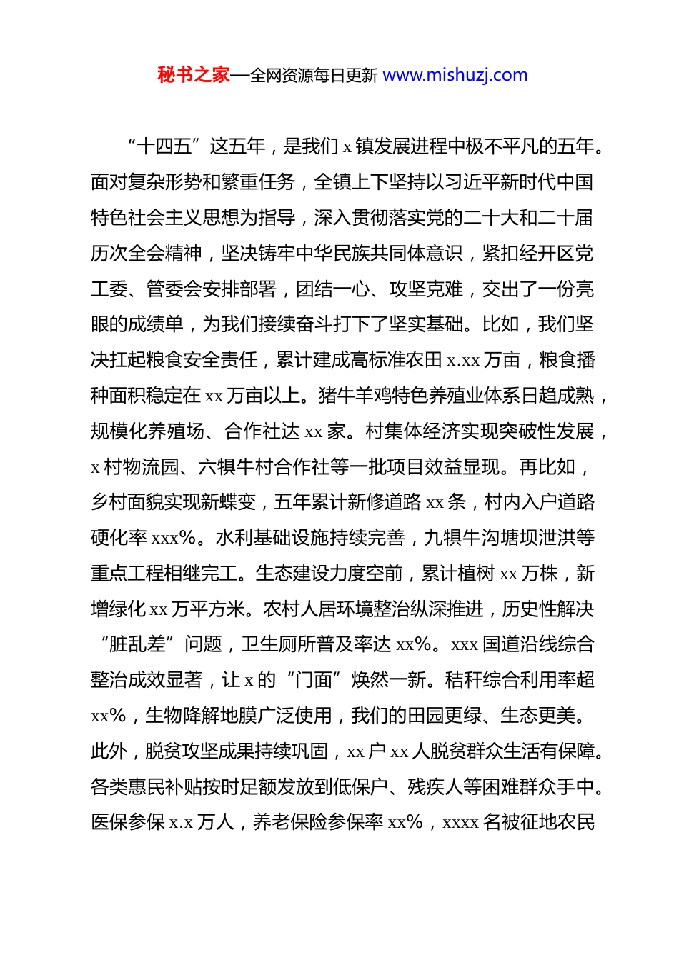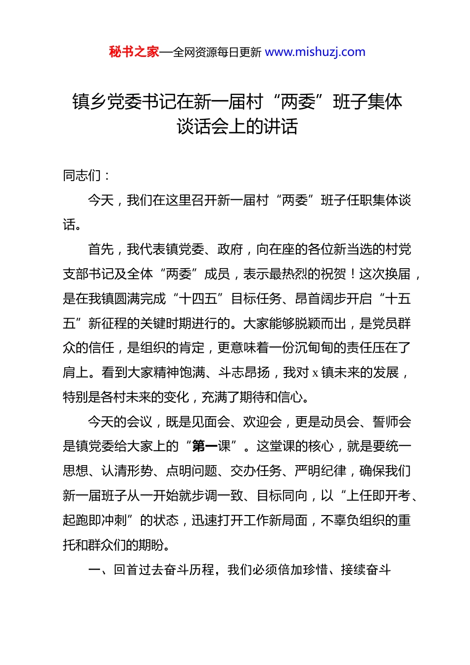 秘书之家—全网资源每日更新 www.mishuzj.com镇乡党委书记在新一届村“两委”班子集体谈话会上的讲话 同志们:今天,我们在这里召开新一届村“两委”班子任职集体谈话。首先,我代表镇党委、政府,向在座的各位新当选的村党支部书记及全体“两委”成员,表示最热烈的祝贺!这次换届,是在我镇圆满完成“十四五”目标任务、昂首阔步开启“十五五”新征程的关键时期进行的。大家能够脱颖而出,是党员群众的信任,是组织的肯定,更意味着一份沉甸甸的责任压在了肩上。看到大家精神饱满、斗志昂扬,我对 x 镇未来的发展,特别是各村未来的变化,充满了期待和信心。今天的会议,既是见面会、欢迎会,更是动员会、誓师会是镇党委给大家上的“第一课”。这堂课的核心,就是要统一思想、认清形势、点明问题、交办任务、严明纪律,确保我们新一届班子从一开始就步调一致、目标同向,以“上任即开考、起跑即冲刺”的状态,迅速打开工作新局面,不辜负组织的重托和群众们的期盼。一、回首过去奋斗历程,我们必须倍加珍惜、接续奋斗秘书之家—全网资源每日更新 www.mishuzj.com“十四五”这五年,是我们 x 镇发展进程中极不平凡的五年。面对复杂形势和繁重任务,全镇上下坚持以习近平新时代中国特色社会主义思想为指导,深入贯彻落实党的二十大和二十届历次全会精神,坚决铸牢中华民族共同体意识,紧扣经开区党工委、管委会安排部署,团结一心、攻坚克难,交出了一份亮眼的成绩单,为我们接续奋斗打下了坚实基础。比如,我们坚决扛起粮食安全责任,累计建成高标准农田 x.xx 万亩,粮食播种面积稳定在 xx 万亩以上。猪牛羊鸡特色养殖业体系日趋成熟,规模化养殖场、合作社达 xx 家。村集体经济实现突破性发展,x 村物流园、六犋牛村合作社等一批项目效益显现。再比如,乡村面貌实现新蝶变,五年累计新修道路 xx 条,村内入户道路硬化率 xxx%。水利基础设施持续完善,九犋牛沟塘坝泄洪等重点工程相继完工。生态建设力度空前,累计植树 xx 万株,新增绿化 xx 万平方米。农村人居环境整治纵深推进,历史性解决“脏乱差”问题,卫生厕所普及率达 xx%。xxx 国道沿线综合整治成效显著,让 x 的“门面”焕然一新。秸秆综合利用率超xx%,生物降解地膜广泛使用,我们的田园更绿、生态更美。此外,脱贫攻坚成果持续巩固,xx 户 xx 人脱贫群众生活有保障。各类惠民补贴按时足额发放到低保户、残疾人等困难群众手中。医保参保 x.x 万人,养老保险参保率 xx%,xxxx 名被征地农民秘书之家—全网资源每日更新 www.mishuzj.com享受养老保障。更可喜的是,随着经开区的快速发展,越来越多村民实现了“家门口”就业,钱包鼓了,笑脸多了。中心校、卫生院遗留问题彻底解决,公共服务更加均衡可及。同时,刚刚过去的 xxxx 年,我们顶住了压力,干成了不少难事。我们以坚决态度完成了中央环保督察、各级巡视巡察交办事项整改。按时完成了违规取水井的封停任务。我们保障了机场高速等一批重点项目 xxx 余亩土地征收,正在攻坚 Sxx 项目征地。我们认真推进耕地图斑、林草图斑整改。完成了大量信访积案的化解,“接诉即办”响应更快、办结率更高。安全生产、森林防火等工作扎实有效,社会大局保持和谐稳定。特别是刚刚完成的村“两委”换届,过程平稳有序,结果风清气正,为未来发展提供了坚强组织保证。同志们,回顾这些成绩,是在习近平新时代中国特色社会主义思想指引,上级党委、政府关心支持下,所有镇村干部、全体党员群众同心同德、苦干实干的结果。充分证明,x 镇的干部队伍是想干事、能干事、也能干成事的!事实告诉我们,只要我们心往一处想、劲往一处使,就没有克服不了的困难。今天在座的各位,接过的是基础扎实、势头向好的“接力棒”,这是我们干事创业的最大底气和最好平台,大家务必倍加珍惜,只能争光添彩,不能添堵添乱。秘书之家—全网资源每日更新 www.mishuzj.com二、正视当前存在问题,坚决破除影响发展的思想障碍与作风顽疾在肯定成绩、坚定信心的同时,我们必须保持清醒的头脑换届完成,绝不是“歇歇脚”“松口气”的时候,相反,更繁重的发展任务、更...