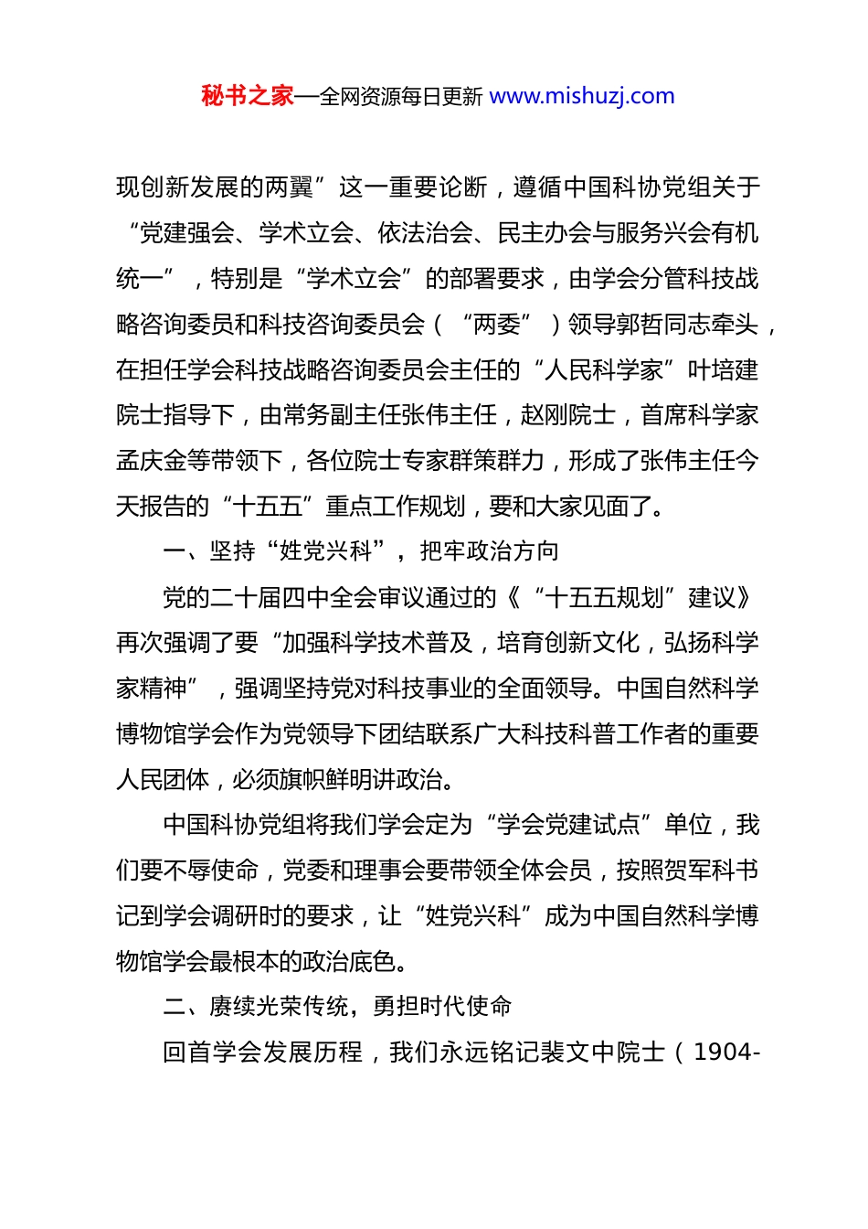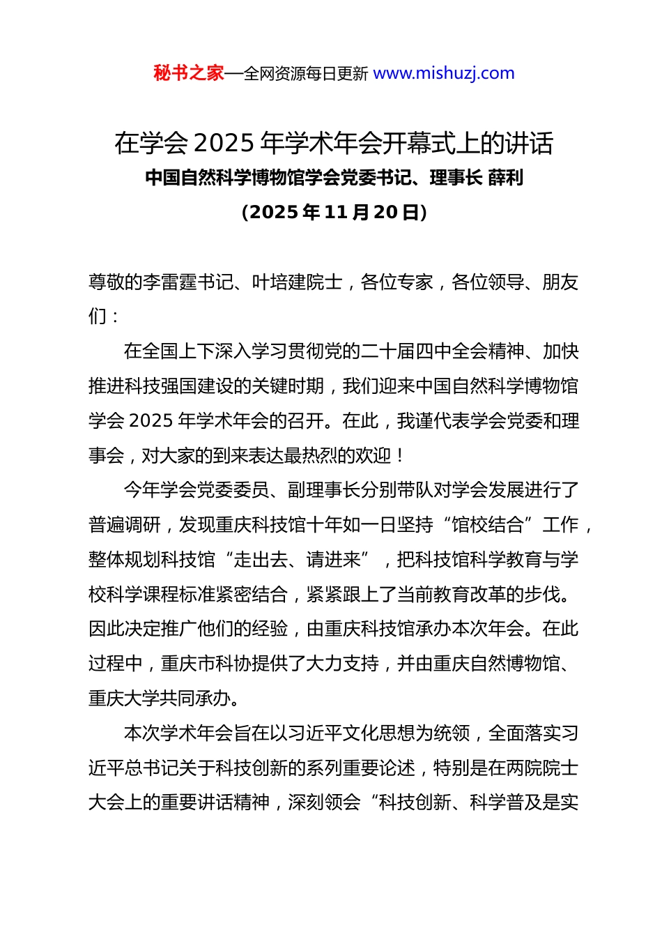 秘书之家—全网资源每日更新 www.mishuzj.com在学会 2025 年学术年会开幕式上的讲话中国自然科学博物馆学会党委书记、理事长 薛利(2025 年 11 月 20 日)尊敬的李雷霆书记、叶培建院士,各位专家,各位领导、朋友们:在全国上下深入学习贯彻党的二十届四中全会精神、加快推进科技强国建设的关键时期,我们迎来中国自然科学博物馆学会 2025 年学术年会的召开。在此,我谨代表学会党委和理事会,对大家的到来表达最热烈的欢迎!今年学会党委委员、副理事长分别带队对学会发展进行了普遍调研,发现重庆科技馆十年如一日坚持“馆校结合”工作,整体规划科技馆“走出去、请进来”,把科技馆科学教育与学校科学课程标准紧密结合,紧紧跟上了当前教育改革的步伐。因此决定推广他们的经验,由重庆科技馆承办本次年会。在此过程中,重庆市科协提供了大力支持,并由重庆自然博物馆、重庆大学共同承办。本次学术年会旨在以习近平文化思想为统领,全面落实习近平总书记关于科技创新的系列重要论述,特别是在两院院士大会上的重要讲话精神,深刻领会“科技创新、科学普及是实秘书之家—全网资源每日更新 www.mishuzj.com现创新发展的两翼”这一重要论断,遵循中国科协党组关于“党建强会、学术立会、依法治会、民主办会与服务兴会有机统一”,特别是“学术立会”的部署要求,由学会分管科技战略咨询委员和科技咨询委员会(“两委”)领导郭哲同志牵头,在担任学会科技战略咨询委员会主任的“人民科学家”叶培建院士指导下,由常务副主任张伟主任,赵刚院士,首席科学家孟庆金等带领下,各位院士专家群策群力,形成了张伟主任今天报告的“十五五”重点工作规划,要和大家见面了。一、坚持“姓党兴科”,把牢政治方向党的二十届四中全会审议通过的《“十五五规划”建议》再次强调了要“加强科学技术普及,培育创新文化,弘扬科学家精神”,强调坚持党对科技事业的全面领导。中国自然科学博物馆学会作为党领导下团结联系广大科技科普工作者的重要人民团体,必须旗帜鲜明讲政治。中国科协党组将我们学会定为“学会党建试点”单位,我们要不辱使命,党委和理事会要带领全体会员,按照贺军科书记到学会调研时的要求,让“姓党兴科”成为中国自然科学博物馆学会最根本的政治底色。二、赓续光荣传统,勇担时代使命回首学会发展历程,我们永远铭记裴文中院士(1904-秘书之家—全网资源每日更新 www.mishuzj.com1982),作为中国自然科学博物馆协会创始人和第一届理事长,他是第一个北京猿人头盖骨的发现者,是中国旧石器考古学,第四纪哺乳动物学和地层学的奠基人,北大地质系毕业、获巴黎大学博士学位的裴文中理事长,在他身上体现出的自强不息的科学探索和创新精神,至今对学术界有深刻的影响。他虽然已于 1982 年仙逝,但是我们永远不会忘记他对党忠诚,学术严谨,培育新人的办会初衷。在学会创立之初的裴文中院士、周明镇院士到李象益、徐善衍、程东红等历任理事长的卓越领导下,中国自然科学博物馆学会不断开拓创新,取得了显著成就,积累了丰富经验,是我们继往开来的力量源泉。三、聚焦年会主题,共绘发展蓝图本次学术年会,我们按照“顶层设计、系统集约、系统工程”的重要理念和方法,力求体现系统性、前瞻性和实践性。学会党委扩大会研究决定,由学会科技战略咨询委员会提出“十五五”规划的基本原则建议,请学会科技战略咨询委员会常务副主任张伟同志,向大家报告学会科技咨询委“十五五”规划(征求意见稿),提交大会审议,并请各专委会、工委会从各个学术领域提出落实措施,形成自己专委会、工委会的规划。秘书之家—全网资源每日更新 www.mishuzj.com我们今年学术年会的主角是“人民科学家”,学会科技战略咨询委员会主任叶培建院士,作《追逐梦想、勇于探索,创新是“探月精神”的灵魂》的主题报告,他将为我们展现老一辈航天人航天报国的家国情怀、严谨务实的工作作风、合作共赢的开放精神,开启一场精神洗礼和学术盛宴。我们还有两支主角团队,一是围绕叶培建院士主报告展开的特邀报告团队,比如学会高级专家张东辉院士的《利用机器学习揭开水的奥秘》,学会党委委员...