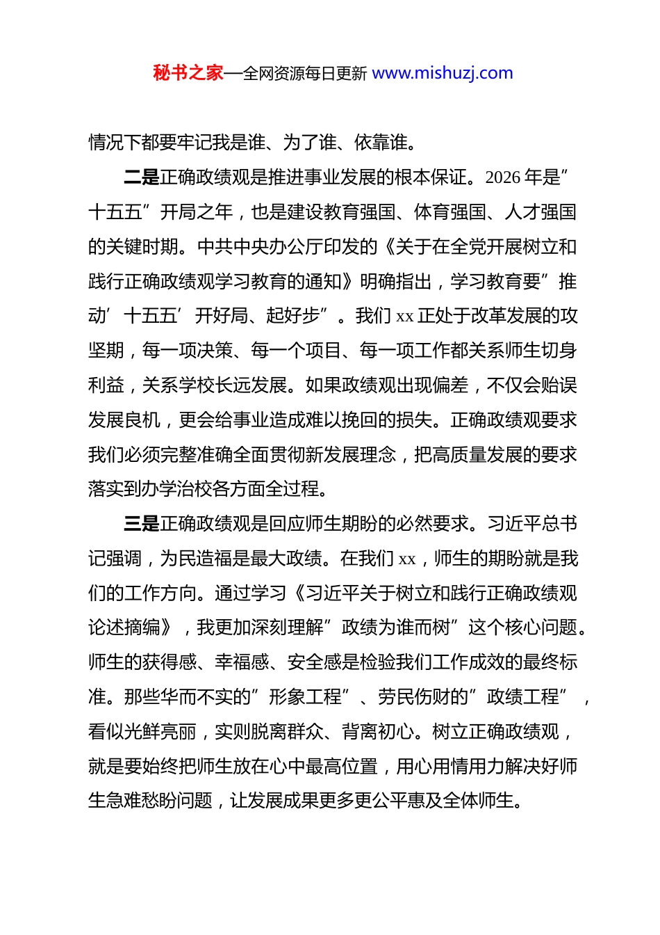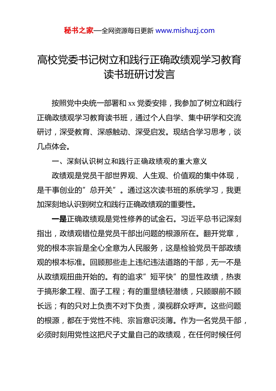 秘书之家—全网资源每日更新 www.mishuzj.com高校党委书记树立和践行正确政绩观学习教育读书班研讨发言 按照党中央统一部署和 xx 党委安排,我参加了树立和践行正确政绩观学习教育读书班,通过个人自学、集中研学和交流研讨,深受教育、深感触动、深受启发。现结合学习思考,谈几点体会。一、深刻认识树立和践行正确政绩观的重大意义政绩观是党员干部世界观、人生观、价值观的集中体现,是干事创业的”总开关”。通过这次读书班的系统学习,我更加深刻地认识到树立和践行正确政绩观的重要性。一是正确政绩观是党性修养的试金石。习近平总书记深刻指出,政绩观错位是党员干部出问题的根源所在。翻开党章,党的根本宗旨是全心全意为人民服务,这是检验党员干部政绩观的根本标准。回顾那些走上违纪违法道路的干部,无一不是从政绩观扭曲开始的。有的追求”短平快”的显性政绩,热衷于搞形象工程、面子工程;有的重显绩轻潜绩,只顾眼前不顾长远;有的只对上负责不对下负责,漠视群众呼声。这些问题的根源,都在于党性不纯、宗旨意识淡薄。作为一名党员干部,必须时刻用党性这把尺子丈量自己的政绩观,在任何时候任何秘书之家—全网资源每日更新 www.mishuzj.com情况下都要牢记我是谁、为了谁、依靠谁。二是正确政绩观是推进事业发展的根本保证。2026 年是”十五五”开局之年,也是建设教育强国、体育强国、人才强国的关键时期。中共中央办公厅印发的《关于在全党开展树立和践行正确政绩观学习教育的通知》明确指出,学习教育要”推动’十五五’开好局、起好步”。我们 xx 正处于改革发展的攻坚期,每一项决策、每一个项目、每一项工作都关系师生切身利益,关系学校长远发展。如果政绩观出现偏差,不仅会贻误发展良机,更会给事业造成难以挽回的损失。正确政绩观要求我们必须完整准确全面贯彻新发展理念,把高质量发展的要求落实到办学治校各方面全过程。三是正确政绩观是回应师生期盼的必然要求。习近平总书记强调,为民造福是最大政绩。在我们 xx,师生的期盼就是我们的工作方向。通过学习《习近平关于树立和践行正确政绩观论述摘编》,我更加深刻理解”政绩为谁而树”这个核心问题。师生的获得感、幸福感、安全感是检验我们工作成效的最终标准。那些华而不实的”形象工程”、劳民伤财的”政绩工程”,看似光鲜亮丽,实则脱离群众、背离初心。树立正确政绩观,就是要始终把师生放在心中最高位置,用心用情用力解决好师生急难愁盼问题,让发展成果更多更公平惠及全体师生。秘书之家—全网资源每日更新 www.mishuzj.com二、准确把握正确政绩观的核心要义这次读书班邀请了 xx 省委党校、xx 大学专家教授作专题辅导报告,从理论逻辑、历史逻辑、实践逻辑等维度对正确政绩观进行了深入阐释。通过学习,我对正确政绩观的核心要义有了更加系统的把握。一是深刻理解”政绩为谁而树”的根本立场。习近平总书记反复强调,人民对美好生活的向往就是我们的奋斗目标。正确政绩观的核心,就是始终坚持以人民为中心的发展思想。在xx 的实际工作中,我们要经常扪心自问:制定的政策是不是真正惠及师生?推进的改革是不是得到师生拥护?建设的项目是不是符合师生需要?如果答案是否定的,就要及时校准方向。政绩好不好,最终要由师生来评判。那些搞”花架子”、做”表面文章”的行为,群众看在眼里、记在心里,最终都会被时间和实践所检验。我们必须把师生满意作为衡量政绩的根本标准,把师生的呼声作为第一信号,把师生的需要作为第一选择,把师生的利益作为第一考虑,把师生的满意作为第一标准。二是准确把握”树什么样的政绩”的科学内涵。习近平总书记指出,既要做让人民看得见、摸得着、得实惠的实事,也要做为后人作铺垫、打基础、利长远的好事。这深刻阐明了显绩与潜绩的辩证关系。在 xx 的发展历程中,既有可以量化的显秘书之家—全网资源每日更新 www.mishuzj.com性成果,也有难以量化的隐性积累;既有立竿见影的即时成效,也有厚积薄发的长期效应。正确处理这对关系,要求我们既要有功成不必在我的精神境界,又要有功成必定有我的历史担当;既要追求看得见、摸得着的显绩,...