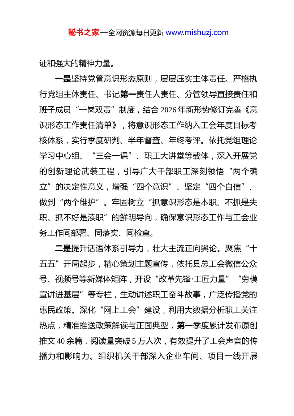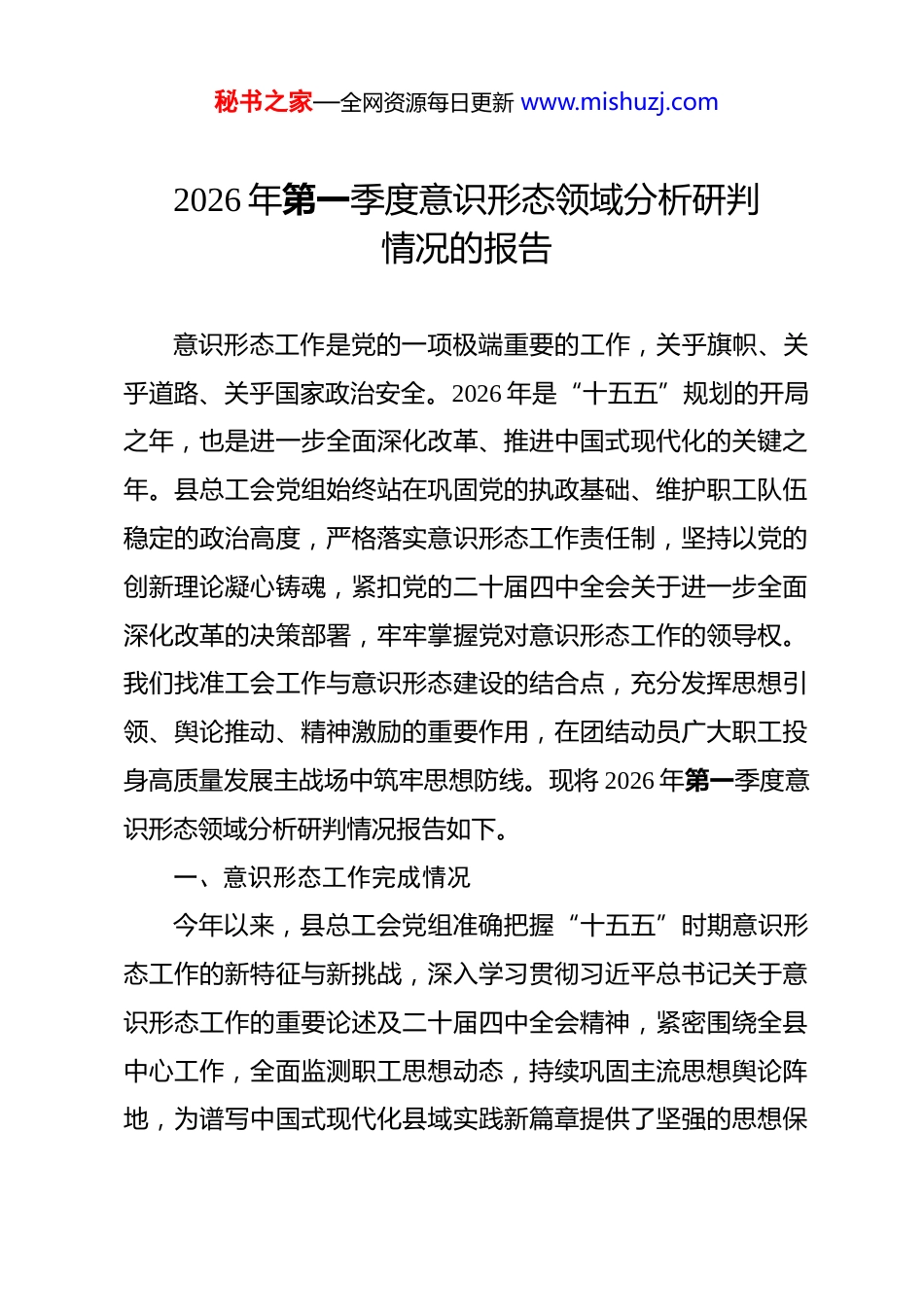 秘书之家—全网资源每日更新 www.mishuzj.com2026 年第一季度意识形态领域分析研判情况的报告 意识形态工作是党的一项极端重要的工作,关乎旗帜、关乎道路、关乎国家政治安全。2026 年是“十五五”规划的开局之年,也是进一步全面深化改革、推进中国式现代化的关键之年。县总工会党组始终站在巩固党的执政基础、维护职工队伍稳定的政治高度,严格落实意识形态工作责任制,坚持以党的创新理论凝心铸魂,紧扣党的二十届四中全会关于进一步全面深化改革的决策部署,牢牢掌握党对意识形态工作的领导权。我们找准工会工作与意识形态建设的结合点,充分发挥思想引领、舆论推动、精神激励的重要作用,在团结动员广大职工投身高质量发展主战场中筑牢思想防线。现将 2026 年第一季度意识形态领域分析研判情况报告如下。一、意识形态工作完成情况今年以来,县总工会党组准确把握“十五五”时期意识形态工作的新特征与新挑战,深入学习贯彻习近平总书记关于意识形态工作的重要论述及二十届四中全会精神,紧密围绕全县中心工作,全面监测职工思想动态,持续巩固主流思想舆论阵地,为谱写中国式现代化县域实践新篇章提供了坚强的思想保秘书之家—全网资源每日更新 www.mishuzj.com证和强大的精神力量。一是坚持党管意识形态原则,层层压实主体责任。严格执行党组主体责任、书记第一责任人责任、分管领导直接责任和班子成员“一岗双责”制度,结合 2026 年新形势修订完善《意识形态工作责任清单》,将意识形态工作纳入工会年度目标考核体系,实行季度研判、半年督查、年终考评。依托党组理论学习中心组、“三会一课”、职工大讲堂等载体,深入开展党的创新理论武装工程,引导广大干部职工深刻领悟“两个确立”的决定性意义,增强“四个意识”、坚定“四个自信”、做到“两个维护”。牢固树立“抓意识形态是本职、不抓是失职、抓不好是渎职”的鲜明导向,确保意识形态工作与工会业务工作同部署、同落实、同检查。二是提升话语体系引导力,壮大主流正向舆论。聚焦“十五五”开局起步,精心策划主题宣传,依托县总工会微信公众号、视频号等新媒体矩阵,开设“改革先锋·工匠力量”“劳模宣讲进基层”等专栏,生动讲述职工奋斗故事,广泛传播党的惠民政策。深化“网上工会”建设,利用大数据分析职工关注热点,精准推送政策解读与正面典型,第一季度累计发布原创推文 40 余篇,阅读量突破 5 万人次,有效提升了工会声音的传播力和影响力。组织机关干部深入企业车间、项目一线开展秘书之家—全网资源每日更新 www.mishuzj.com“面对面”座谈宣讲 12 场,及时回应职工关切,凝聚改革共识,画好最大同心圆。三是建强管好各类阵地,守牢网络安全底线。严格落实信息发布“三审三校”制度,加强对工会网站、微信群、公众号等自有阵地的日常监管,坚决杜绝错误观点和敏感信息传播。坚持正能量是总要求、管得住是硬道理,引导职工群众理性表达诉求,在大是大非面前旗帜鲜明、敢于亮剑。深入开展“清朗·网络空间”专项行动,配合网信部门净化网络环境,倡导文明上网、理性发声,营造风清气正的网络生态。依托工人文化宫、职工书屋等实体阵地,举办红色经典诵读、形势政策报告会等活动 8 场,让党的创新理论飞入寻常百姓家。四是锻造过硬宣教队伍,激发人才队伍活力。实施意识形态工作队伍素质提升计划,选派骨干力量参加省市级专题培训班,着力培养一批政治坚定、业务精通、作风优良的网宣员和评论员。鼓励干部加强战略性、前瞻性研究,针对新业态劳动者、青年职工等群体的思想特点,探索分众化、互动式宣传教育新模式。强化战斗精神培育,定期开展舆情应对模拟演练,提升干部队伍在复杂舆论环境下的研判力、引导力和处置力,确保关键时刻拉得出、冲得上、打得赢。二、本领域意识形态方面存在的风险隐患秘书之家—全网资源每日更新 www.mishuzj.com虽然我县工会系统意识形态总体态势平稳向好,但对照党的二十届四中全会提出的新要求,对照职工群众日益增长的美好生活需要,仍存在一些不容忽视的风险隐患和薄弱环节。一是对新形势下意识形态工作的复杂性认识不够深刻,政治站位有待进一步提...