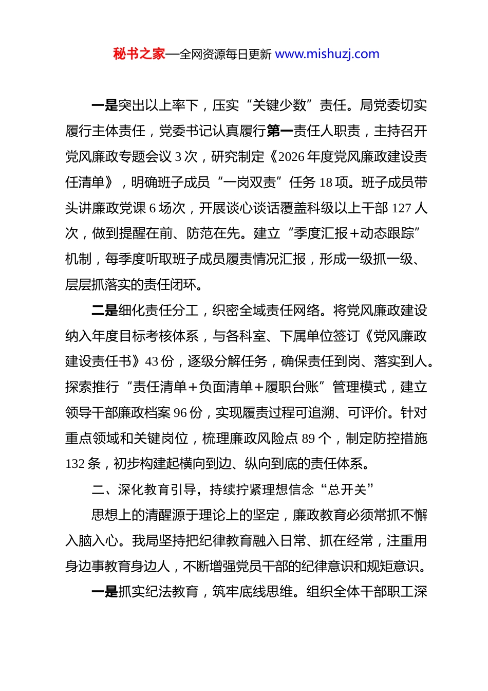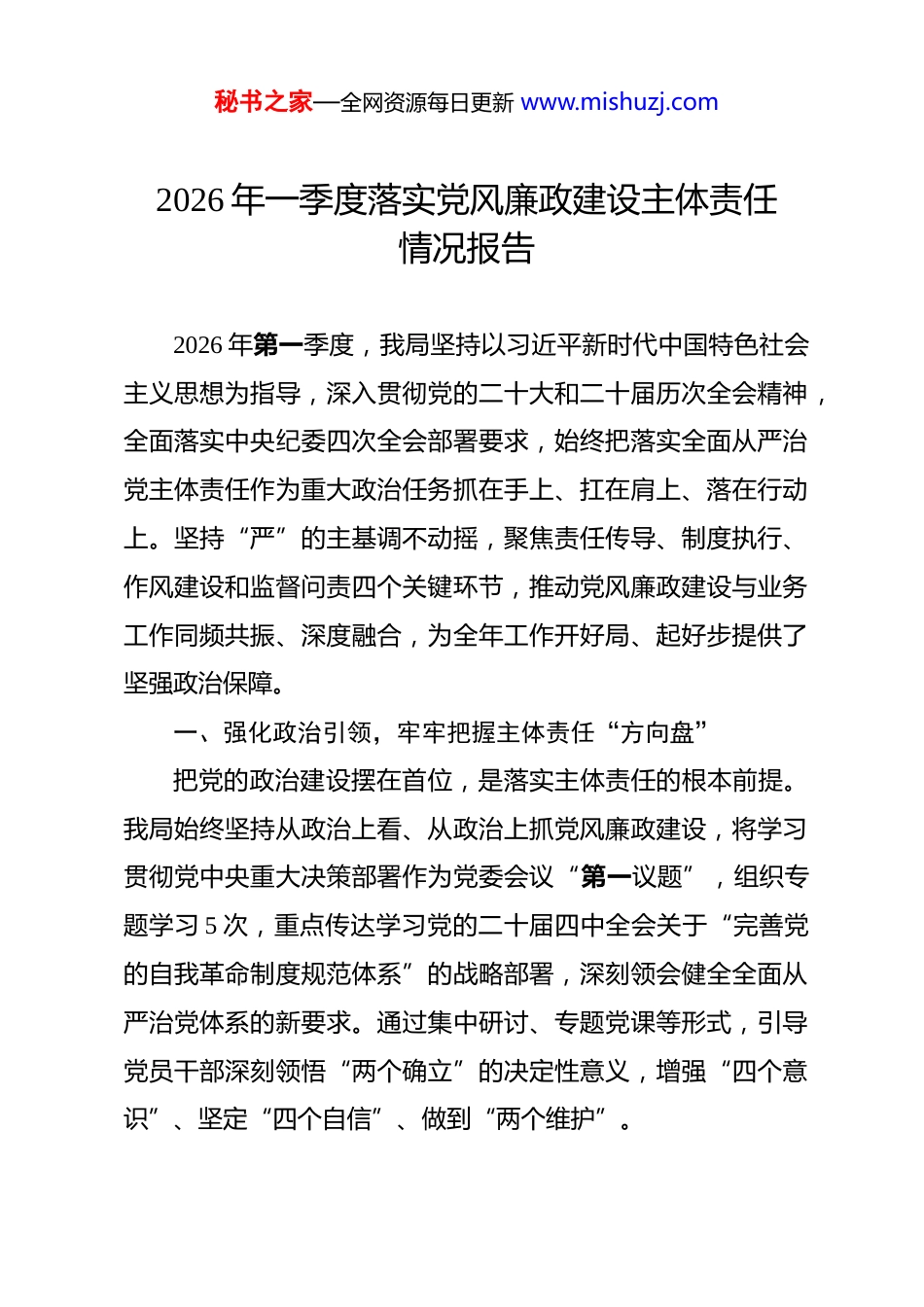 秘书之家—全网资源每日更新 www.mishuzj.com2026 年一季度落实党风廉政建设主体责任情况报告 2026 年第一季度,我局坚持以习近平新时代中国特色社会主义思想为指导,深入贯彻党的二十大和二十届历次全会精神,全面落实中央纪委四次全会部署要求,始终把落实全面从严治党主体责任作为重大政治任务抓在手上、扛在肩上、落在行动上。坚持“严”的主基调不动摇,聚焦责任传导、制度执行、作风建设和监督问责四个关键环节,推动党风廉政建设与业务工作同频共振、深度融合,为全年工作开好局、起好步提供了坚强政治保障。一、强化政治引领,牢牢把握主体责任“方向盘”把党的政治建设摆在首位,是落实主体责任的根本前提。我局始终坚持从政治上看、从政治上抓党风廉政建设,将学习贯彻党中央重大决策部署作为党委会议“第一议题”,组织专题学习 5 次,重点传达学习党的二十届四中全会关于“完善党的自我革命制度规范体系”的战略部署,深刻领会健全全面从严治党体系的新要求。通过集中研讨、专题党课等形式,引导党员干部深刻领悟“两个确立”的决定性意义,增强“四个意识”、坚定“四个自信”、做到“两个维护”。秘书之家—全网资源每日更新 www.mishuzj.com一是突出以上率下,压实“关键少数”责任。局党委切实履行主体责任,党委书记认真履行第一责任人职责,主持召开党风廉政专题会议 3 次,研究制定《2026 年度党风廉政建设责任清单》,明确班子成员“一岗双责”任务 18 项。班子成员带头讲廉政党课 6 场次,开展谈心谈话覆盖科级以上干部 127 人次,做到提醒在前、防范在先。建立“季度汇报+动态跟踪”机制,每季度听取班子成员履责情况汇报,形成一级抓一级、层层抓落实的责任闭环。二是细化责任分工,织密全域责任网络。将党风廉政建设纳入年度目标考核体系,与各科室、下属单位签订《党风廉政建设责任书》43 份,逐级分解任务,确保责任到岗、落实到人。探索推行“责任清单+负面清单+履职台账”管理模式,建立领导干部廉政档案 96 份,实现履责过程可追溯、可评价。针对重点领域和关键岗位,梳理廉政风险点 89 个,制定防控措施132 条,初步构建起横向到边、纵向到底的责任体系。二、深化教育引导,持续拧紧理想信念“总开关”思想上的清醒源于理论上的坚定,廉政教育必须常抓不懈入脑入心。我局坚持把纪律教育融入日常、抓在经常,注重用身边事教育身边人,不断增强党员干部的纪律意识和规矩意识。一是抓实纪法教育,筑牢底线思维。组织全体干部职工深秘书之家—全网资源每日更新 www.mishuzj.com入学习新修订的《中国共产党纪律处分条例》,开展专题培训2 轮,参训人员达 680 人次。邀请市纪委监委同志作警示教育辅导报告,结合近年来本系统查处的违纪违法典型案例,剖析问题根源,揭示腐败危害。组织观看《警钟长鸣 2025》等警示教育片 4 部,分批次赴市廉政教育基地开展现场教学,累计参与320 人次,让党员干部受警醒、明底线、知敬畏。二是创新教育形式,提升渗透力感染力。打破传统“填鸭式”教育模式,推出“清风讲堂”微课堂系列,利用碎片化时间推送党纪法规解读、廉洁文化故事等内容 36 期,阅读量超1.2 万人次。举办“家风助廉”主题活动,向干部职工家属发放《家庭助廉倡议书》400 余份,征集廉洁家书 57 封,推动廉洁教育向“八小时之外”延伸。组织开展“青年话清廉”演讲比赛,激发年轻干部思廉、崇廉、守廉的内在自觉。三、聚焦作风建设,坚决打好正风肃纪“持久战”作风问题关系人心向背,必须寸步不让、久久为功。我局紧盯“四风”隐形变异新动向,持续深化专项整治,推动作风建设常态化长效化。一是严查享乐主义、奢靡之风。围绕元旦、春节等重要节点,开展明察暗访 4 轮,重点检查公款吃喝、违规收送礼品礼金、公车私用等问题,发现问题线索 3 条,均已移交纪检监察秘书之家—全网资源每日更新 www.mishuzj.com机构处理。严格执行公务接待“三单合一”制度,一季度公务接待费用同比下降 14.6%。对 2 起违反中央八项规定精神典型问题进行通报曝光,释放越往后执纪越严的强烈信号。二是纠治形式主义、官僚主...