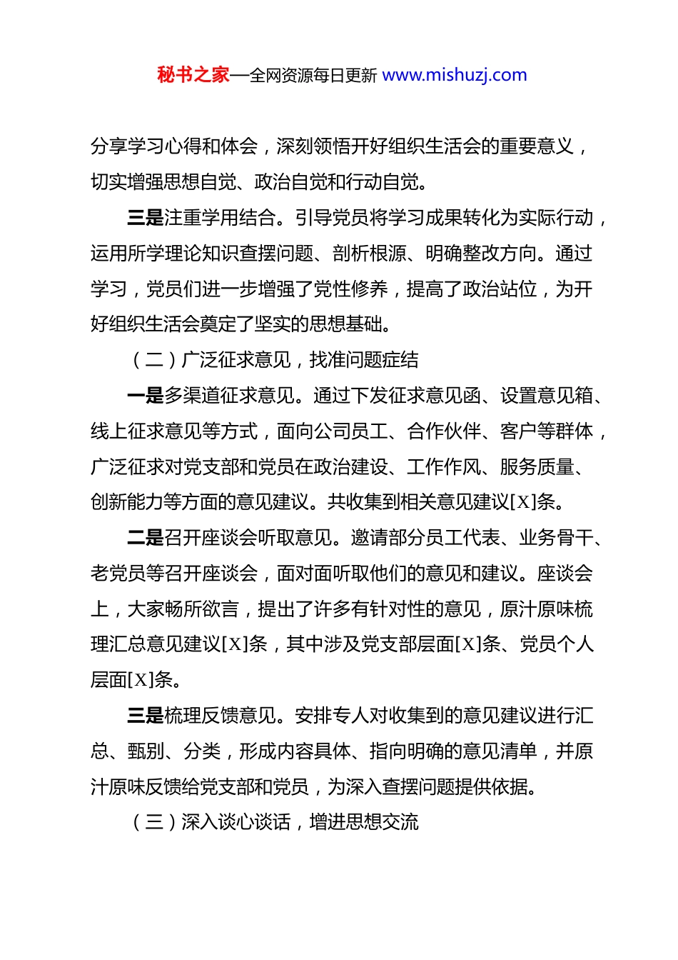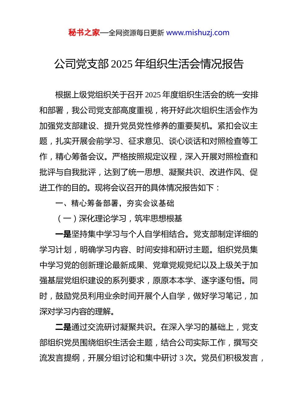 秘书之家—全网资源每日更新 www.mishuzj.com公司党支部 2025 年组织生活会情况报告 根据上级党组织关于召开 2025 年度组织生活会的统一安排和部署,我公司党支部高度重视,将开好此次组织生活会作为加强党支部建设、提升党员党性修养的重要契机。紧扣会议主题,扎实开展会前学习、征求意见、谈心谈话和对照检查等工作,精心筹备会议。严格按照规定议程,深入开展对照检查和批评与自我批评,达到了统一思想、凝聚共识、改进作风、促进工作的目的。现将会议召开的具体情况报告如下:一、精心筹备部署,夯实会议基础(一)深化理论学习,筑牢思想根基一是坚持集中学习与个人自学相结合。党支部制定详细的学习计划,明确学习内容、时间安排和研讨主题。组织党员集中学习党的创新理论最新成果、党章党规党纪以及上级关于加强基层党组织建设的系列要求,原原本本学、逐字逐句悟。同时,鼓励党员利用业余时间开展个人自学,做好学习笔记,加深对学习内容的理解。二是通过交流研讨凝聚共识。在深入学习的基础上,党支部组织党员围绕组织生活会主题,结合公司实际工作,撰写交流发言提纲,开展分组讨论和集中研讨 3 次。党员们积极发言,秘书之家—全网资源每日更新 www.mishuzj.com分享学习心得和体会,深刻领悟开好组织生活会的重要意义,切实增强思想自觉、政治自觉和行动自觉。三是注重学用结合。引导党员将学习成果转化为实际行动,运用所学理论知识查摆问题、剖析根源、明确整改方向。通过学习,党员们进一步增强了党性修养,提高了政治站位,为开好组织生活会奠定了坚实的思想基础。(二)广泛征求意见,找准问题症结一是多渠道征求意见。通过下发征求意见函、设置意见箱、线上征求意见等方式,面向公司员工、合作伙伴、客户等群体,广泛征求对党支部和党员在政治建设、工作作风、服务质量、创新能力等方面的意见建议。共收集到相关意见建议[X]条。二是召开座谈会听取意见。邀请部分员工代表、业务骨干、老党员等召开座谈会,面对面听取他们的意见和建议。座谈会上,大家畅所欲言,提出了许多有针对性的意见,原汁原味梳理汇总意见建议[X]条,其中涉及党支部层面[X]条、党员个人层面[X]条。三是梳理反馈意见。安排专人对收集到的意见建议进行汇总、甄别、分类,形成内容具体、指向明确的意见清单,并原汁原味反馈给党支部和党员,为深入查摆问题提供依据。(三)深入谈心谈话,增进思想交流秘书之家—全网资源每日更新 www.mishuzj.com一是落实“四必谈”要求。党支部书记与支部委员、支部委员之间、支部委员与党员、党员与党员之间广泛开展谈心谈话。谈话坚持实事求是、敞开心扉,既交流工作,也沟通思想,既指出问题,也提出建议。通过谈心谈话,把问题谈开、把思想谈通、把意见谈实,增进了党员之间的了解和信任。二是确保谈话全覆盖。共开展会前谈心谈话[X]次,覆盖全体党员及重点岗位员工,谈话[X]人,面对面交流意见建议[X]条。通过谈心谈话,为开展批评与自我批评营造了良好氛围。(四)认真对照检查,撰写发言材料一是党支部对照检查。党支部对照党章党规、上级党组织要求和公司发展实际,深入查摆存在的问题,深刻剖析思想、组织、作风等方面的根源,明确整改方向。党支部书记亲自牵头把关,确保对照检查材料的政治性、针对性和实效性。二是党员个人对照检查。党员自己动手撰写发言提纲,主动认领党支部问题中属于个人的部分,深入查摆个人在思想、工作、作风等方面存在的突出问题,做到见人见事见思想。党支部书记对党员个人发言提纲逐一审阅,对查摆问题不深、剖析根源不透、整改措施不实的提出修改意见,确保材料质量。二、严肃开展批评,确保会议质量(一)查摆问题深刻到位秘书之家—全网资源每日更新 www.mishuzj.com党支部和党员紧密结合工作实际,对照规定的要求,全面查摆在贯彻落实上级决策部署、推动公司发展、服务员工群众、加强自身建设等方面存在的突出问题。在查摆过程中,既讲问题表现,又析症结根源,既谈客观因素,更挖主观原因,真正把问题找准、把根源剖深、把整改方向理清。(二)相互批评坦诚直率会上,党员们的自我批评做到了刀刃向内、...