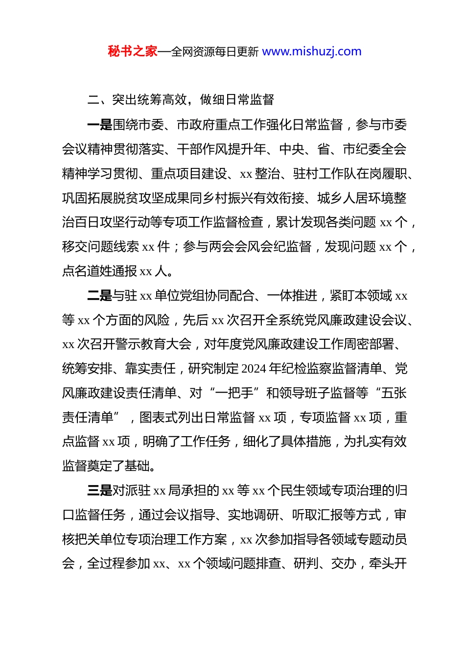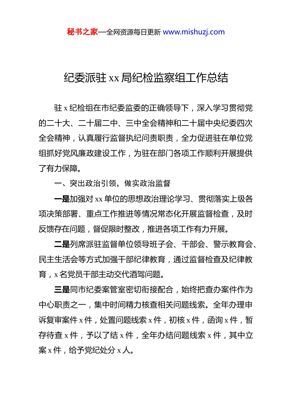 秘书之家—全网资源每日更新 www.mishuzj.com纪委派驻 xx 局纪检监察组工作总结驻 x 纪检组在市纪委监委的正确领导下,深入学习贯彻党的二十大、二十届二中、三中全会精神和二十届中央纪委四次全会精神,认真履行监督执纪问责职责,全力促进驻在单位党组抓好党风廉政建设工作,为驻在部门各项工作顺利开展提供了有力保障。一、突出政治引领,做实政治监督一是加强对 xx 单位的思想政治理论学习、贯彻落实上级各项决策部署、重点工作推进等情况常态化开展监督检查,及时反馈存在问题,督促限时整改,推进各项工作有力开展。二是列席派驻监督单位领导班子会、干部会、警示教育会、民主生活会等方式加强干部纪律教育,通过监督检查及纪律教育,x 名党员干部主动交代酒驾问题。三是同市纪委案管室密切衔接配合,始终把查办案件作为中心职责之一,集中时间精力核查相关问题线索。全年办理申诉复审案件 x 件,处置问题线索 x 件,初核 x 件,函询 x 件,暂存待查 x 件,予以了结 x 件,全年办结问题线索 x 件,其中立案 x 件,给予党纪处分 x 人。秘书之家—全网资源每日更新 www.mishuzj.com二、突出统筹高效,做细日常监督一是围绕市委、市政府重点工作强化日常监督,参与市委会议精神贯彻落实、干部作风提升年、中央、省、市纪委全会精神学习贯彻、重点项目建设、xx 整治、驻村工作队在岗履职、巩固拓展脱贫攻坚成果同乡村振兴有效衔接、城乡人居环境整治百日攻坚行动等专项工作监督检查,累计发现各类问题 xx 个,移交问题线索 xx 件;参与两会会风会纪监督,发现问题 xx 个,点名道姓通报 xx 人。二是与驻 xx 单位党组协同配合、一体推进,紧盯本领域 xx等 xx 个方面的风险,先后 xx 次召开全系统党风廉政建设会议、xx 次召开警示教育大会,对年度党风廉政建设工作周密部署、统筹安排、靠实责任,研究制定 2024 年纪检监察监督清单、党风廉政建设责任清单、对“一把手”和领导班子监督等“五张责任清单”,图表式列出日常监督 xx 项,专项监督 xx 项,重点监督 xx 项,明确了工作任务,细化了具体措施,为扎实有效监督奠定了基础。三是对派驻 xx 局承担的 xx 等 xx 个民生领域专项治理的归口监督任务,通过会议指导、实地调研、听取汇报等方式,审核把关单位专项治理工作方案,xx 次参加指导各领域专题动员会,全过程参加 xx、xx 个领域问题排查、研判、交办,牵头开秘书之家—全网资源每日更新 www.mishuzj.com展 xx 专题调研,跟踪督办 xx 违法案件办理,下沉一线开展 xx和 xx 调查问卷,累计开展专项督查 xx 次,发出监察建议书 xx份,主动发现并督促整改问题 xx 个,推动建立完善相关制度机制 xx 项,持续巩固专项治理工作成果。三、突出精准发力,强化执纪问责一是做细信访监督。坚持“小信访、大民生”,做好“送上门”的群众工作。严格执行《纪检监察机关处理检举控告工作规则》有关规定,始终将信访件核查处理放在首要位置,坚持统筹联动,在专项督导、日常检查、案件查办的过程中,了解掌握信访件具体事由,学习所涉及行业政策法规,争取在最短时间科学审慎启动处置程序,积极回应群众关切。二是做实干中学学中干,参与审查调查实战实践。积极融入“xx”联合办案机制,多轮次参与留置案件调查、有偿顶岗代班、审计反馈问题、局机关在职在编人员违规参与经营等案件查办。今年以来,共参与案件查办 xx 件次,办结信访件 xx 件,对归口单位党员干部运用第一种形态处理 xx 人。三是将 x 名纪检监察干部分成 x 个监督小组,建立分科室和局属单位包抓机制,每月至少开展一次监督检查,形成检查报告,及时发现处理违规违纪问题,2024 年共开展监督检查 xx次,查纠问题 xx 个,下发督办件 xx 份,工作提醒函 xx 份,切秘书之家—全网资源每日更新 www.mishuzj.com实把监督“探头”建在一线,把监督“触角”延伸一线,实现监督无死角。四是强化机关财务监督。集中对机关财务账户进行清理核查,及时督促消除长期睡眠账户 xx 个,财务人员提交个人征信报告 xx 份,做到防微杜渐...