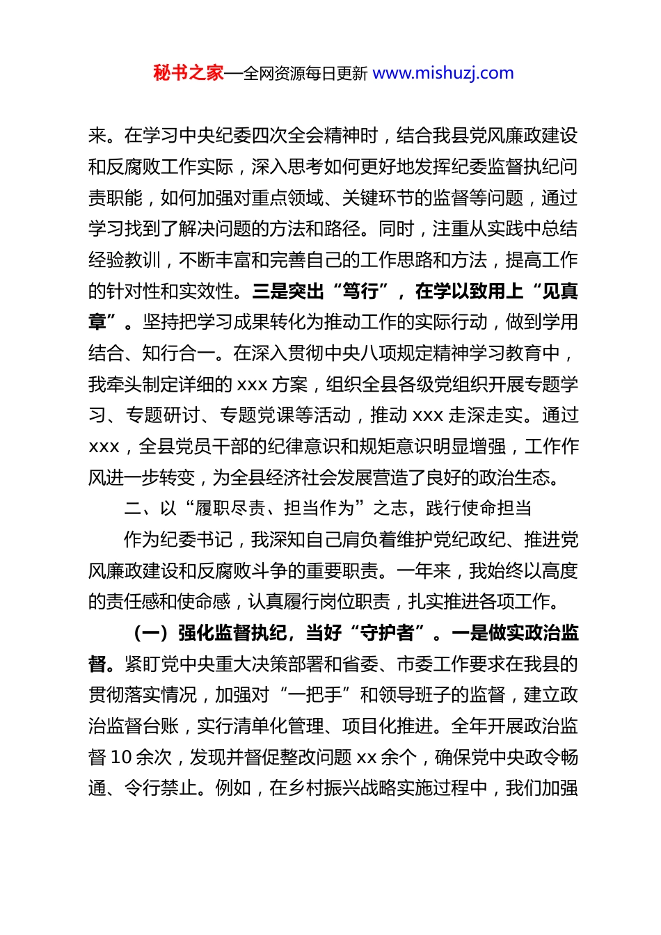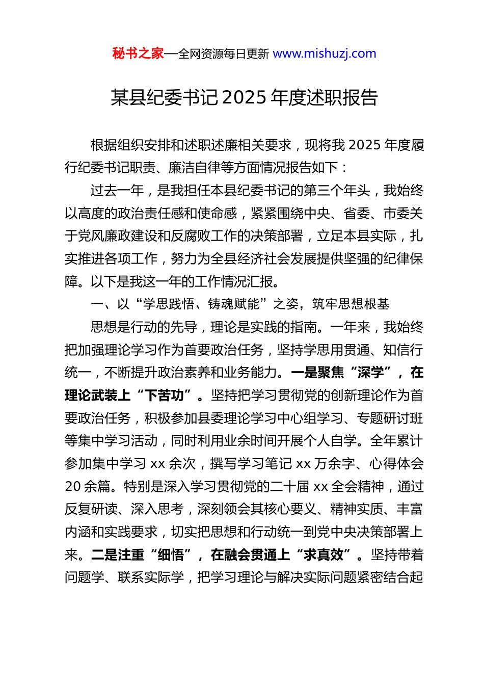 秘书之家—全网资源每日更新 www.mishuzj.com某县纪委书记 2025 年度述职报告根据组织安排和述职述廉相关要求,现将我 2025 年度履行纪委书记职责、廉洁自律等方面情况报告如下:过去一年,是我担任本县纪委书记的第三个年头,我始终以高度的政治责任感和使命感,紧紧围绕中央、省委、市委关于党风廉政建设和反腐败工作的决策部署,立足本县实际,扎实推进各项工作,努力为全县经济社会发展提供坚强的纪律保障。以下是我这一年的工作情况汇报。一、以“学思践悟、铸魂赋能”之姿,筑牢思想根基思想是行动的先导,理论是实践的指南。一年来,我始终把加强理论学习作为首要政治任务,坚持学思用贯通、知信行统一,不断提升政治素养和业务能力。一是聚焦“深学”,在理论武装上“下苦功”。坚持把学习贯彻党的创新理论作为首要政治任务,积极参加县委理论学习中心组学习、专题研讨班等集中学习活动,同时利用业余时间开展个人自学。全年累计参加集中学习 xx 余次,撰写学习笔记 xx 万余字、心得体会20 余篇。特别是深入学习贯彻党的二十届 xx 全会精神,通过反复研读、深入思考,深刻领会其核心要义、精神实质、丰富内涵和实践要求,切实把思想和行动统一到党中央决策部署上来。二是注重“细悟”,在融会贯通上“求真效”。坚持带着问题学、联系实际学,把学习理论与解决实际问题紧密结合起秘书之家—全网资源每日更新 www.mishuzj.com来。在学习中央纪委四次全会精神时,结合我县党风廉政建设和反腐败工作实际,深入思考如何更好地发挥纪委监督执纪问责职能,如何加强对重点领域、关键环节的监督等问题,通过学习找到了解决问题的方法和路径。同时,注重从实践中总结经验教训,不断丰富和完善自己的工作思路和方法,提高工作的针对性和实效性。三是突出“笃行”,在学以致用上“见真章”。坚持把学习成果转化为推动工作的实际行动,做到学用结合、知行合一。在深入贯彻中央八项规定精神学习教育中,我牵头制定详细的 xxx 方案,组织全县各级党组织开展专题学习、专题研讨、专题党课等活动,推动 xxx 走深走实。通过xxx,全县党员干部的纪律意识和规矩意识明显增强,工作作风进一步转变,为全县经济社会发展营造了良好的政治生态。二、以“履职尽责、担当作为”之志,践行使命担当作为纪委书记,我深知自己肩负着维护党纪政纪、推进党风廉政建设和反腐败斗争的重要职责。一年来,我始终以高度的责任感和使命感,认真履行岗位职责,扎实推进各项工作。(一)强化监督执纪,当好“守护者”。一是做实政治监督。紧盯党中央重大决策部署和省委、市委工作要求在我县的贯彻落实情况,加强对“一把手”和领导班子的监督,建立政治监督台账,实行清单化管理、项目化推进。全年开展政治监督 10 余次,发现并督促整改问题 xx 余个,确保党中央政令畅通、令行禁止。例如,在乡村振兴战略实施过程中,我们加强秘书之家—全网资源每日更新 www.mishuzj.com对资金使用、项目推进等方面的监督检查,严肃查处了一批侵害群众利益的不正之风和腐败问题,为乡村振兴战略的顺利实施提供了坚强的纪律保障。二是做深日常监督。充分发挥“室组地”联动监督优势,整合监督力量,加强对重点领域、关键环节的日常监督。建立廉政档案,对全县科级以上干部的廉政情况进行动态管理。全年开展日常监督检查 xx 余次,发现问题线索 xx 余条,运用第一种形态处理干部 xx 余人次,做到早发现、早提醒、早纠正,防止小毛病演变成大错误。三是做细专项监督。针对群众反映强烈的突出问题,开展专项整治行动。聚焦教育医疗、养老社保、生态环保等领域,开展专项监督 xx余项,查处了一批群众身边的腐败和作风问题,切实维护了群众的切身利益。例如,在开展医疗领域腐败问题专项整治中,我们严肃查处了 x 医院 x 医生收受回扣、开大处方等问题,追回违规资金数十万元,赢得了群众的广泛好评。(二)深化反腐倡廉,打好“攻坚战”。一是保持高压态势。坚持有腐必反、有贪必肃,对腐败问题“零容忍”。全年立案审查调查违纪违法案件 x 起,处分党员干部 x 人,其中涉及科级干部 x 人,形...