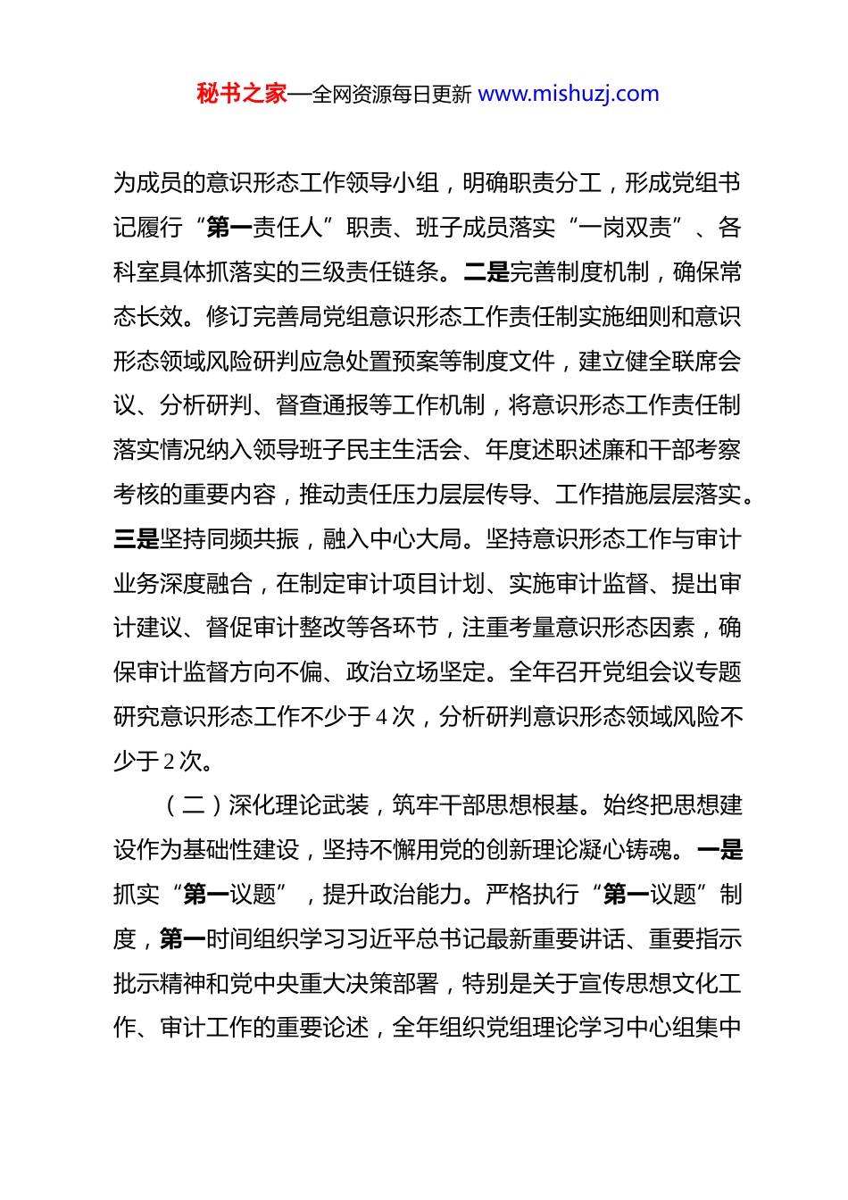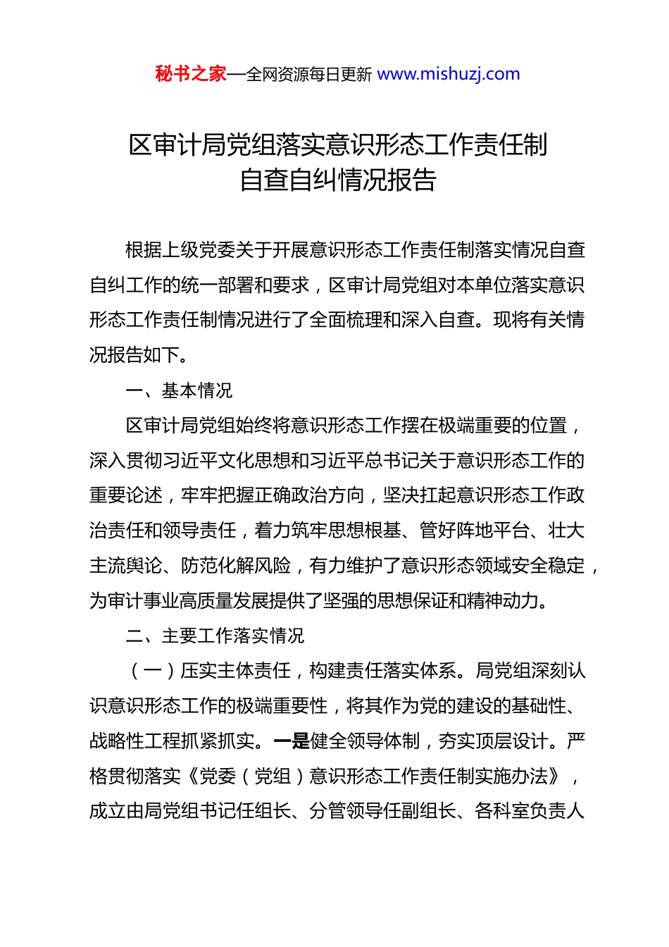 秘书之家—全网资源每日更新 www.mishuzj.com区审计局党组落实意识形态工作责任制自查自纠情况报告 根据上级党委关于开展意识形态工作责任制落实情况自查自纠工作的统一部署和要求,区审计局党组对本单位落实意识形态工作责任制情况进行了全面梳理和深入自查。现将有关情况报告如下。一、基本情况区审计局党组始终将意识形态工作摆在极端重要的位置,深入贯彻习近平文化思想和习近平总书记关于意识形态工作的重要论述,牢牢把握正确政治方向,坚决扛起意识形态工作政治责任和领导责任,着力筑牢思想根基、管好阵地平台、壮大主流舆论、防范化解风险,有力维护了意识形态领域安全稳定,为审计事业高质量发展提供了坚强的思想保证和精神动力。二、主要工作落实情况(一)压实主体责任,构建责任落实体系。局党组深刻认识意识形态工作的极端重要性,将其作为党的建设的基础性、战略性工程抓紧抓实。一是健全领导体制,夯实顶层设计。严格贯彻落实《党委(党组)意识形态工作责任制实施办法》,成立由局党组书记任组长、分管领导任副组长、各科室负责人秘书之家—全网资源每日更新 www.mishuzj.com为成员的意识形态工作领导小组,明确职责分工,形成党组书记履行“第一责任人”职责、班子成员落实“一岗双责”、各科室具体抓落实的三级责任链条。二是完善制度机制,确保常态长效。修订完善局党组意识形态工作责任制实施细则和意识形态领域风险研判应急处置预案等制度文件,建立健全联席会议、分析研判、督查通报等工作机制,将意识形态工作责任制落实情况纳入领导班子民主生活会、年度述职述廉和干部考察考核的重要内容,推动责任压力层层传导、工作措施层层落实。三是坚持同频共振,融入中心大局。坚持意识形态工作与审计业务深度融合,在制定审计项目计划、实施审计监督、提出审计建议、督促审计整改等各环节,注重考量意识形态因素,确保审计监督方向不偏、政治立场坚定。全年召开党组会议专题研究意识形态工作不少于 4 次,分析研判意识形态领域风险不少于 2 次。(二)深化理论武装,筑牢干部思想根基。始终把思想建设作为基础性建设,坚持不懈用党的创新理论凝心铸魂。一是抓实“第一议题”,提升政治能力。严格执行“第一议题”制度,第一时间组织学习习近平总书记最新重要讲话、重要指示批示精神和党中央重大决策部署,特别是关于宣传思想文化工作、审计工作的重要论述,全年组织党组理论学习中心组集中秘书之家—全网资源每日更新 www.mishuzj.com学习和专题研讨共 20 余次,引领全局干部职工深刻领悟“两个确立”的决定性意义,增强“四个意识”、坚定“四个自信”、做到“两个维护”。二是创新学习载体,增强渗透实效。充分利用“学习强国”学习平台、审计署“审计大讲堂”、市委党校线上课程等资源,拓展学习渠道,组织开展党章党规知识竞赛、红色经典诵读、主题党日等活动,评选“学习标兵”,营造比学赶超的浓厚氛围。三是推动成果转化,服务审计实践。将理论学习成果转化为完善审计制度机制、创新审计技术方法、提升审计监督效能的具体举措,围绕贯彻落实党的二十届历次全会精神开展专题调研,形成高质量调研报告,推动党的创新理论在审计实践中落地生根、开花结果。(三)严格阵地管理,守好意识形态安全防线。牢固树立阵地意识,坚持主管主办和属地管理原则,确保各类意识形态阵地可管可控。一是规范宣传阵地管理。严格执行局门户网站信息发布“三审三校”制度,明确审核流程和责任主体,确保发布内容准确、导向正确。加强微信公众号内容策划与审核把关,聚焦宣传审计法规政策、审计工作动态、先进典型事迹,弘扬主旋律,传播正能量。全年审核发布各类信息数百条,未出现任何导向错误。二是强化网络意识形态安全。定期开展全局网络安全风险排查,升级安全防护设备,及时修补系统漏洞,秘书之家—全网资源每日更新 www.mishuzj.com加强审计业务数据和涉密信息的安全管理,严防信息泄露。建立常态化网络舆情监测机制,重点加强对涉及审计工作、民生热点等领域舆情的收集、分析和研判,妥善处置各类网络舆情,未发生重大负面舆情事件。三是加强思想动态引导。...
