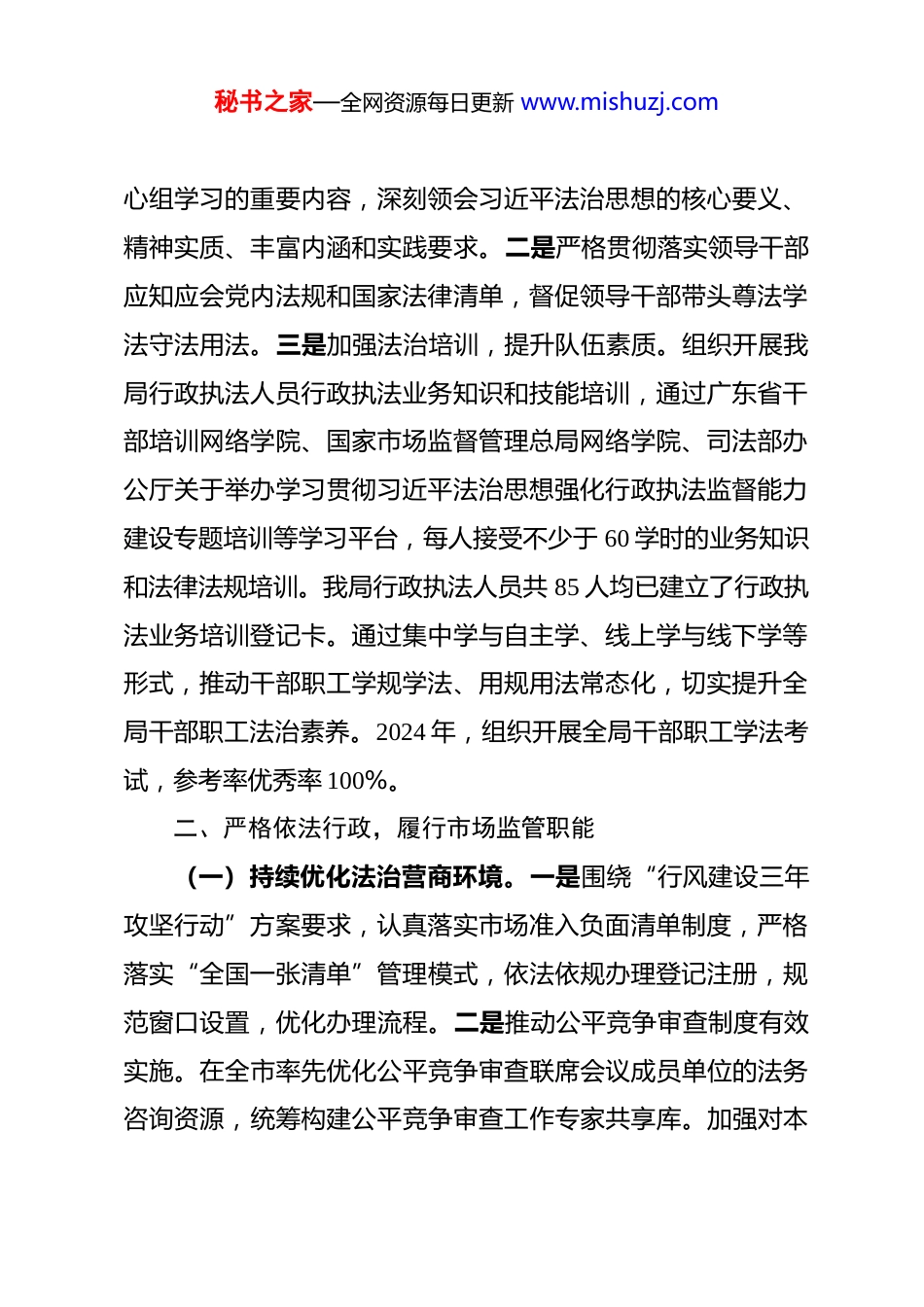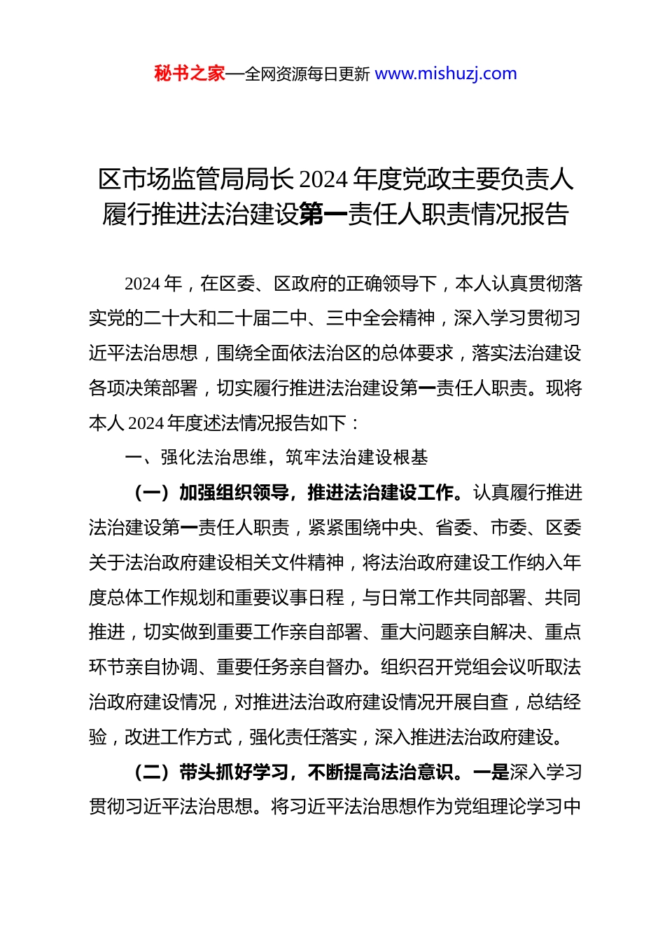 秘书之家—全网资源每日更新 www.mishuzj.com区市场监管局局长 2024 年度党政主要负责人履行推进法治建设第一责任人职责情况报告2024 年,在区委、区政府的正确领导下,本人认真贯彻落实党的二十大和二十届二中、三中全会精神,深入学习贯彻习近平法治思想,围绕全面依法治区的总体要求,落实法治建设各项决策部署,切实履行推进法治建设第一责任人职责。现将本人 2024 年度述法情况报告如下:一、强化法治思维,筑牢法治建设根基(一)加强组织领导,推进法治建设工作。认真履行推进法治建设第一责任人职责,紧紧围绕中央、省委、市委、区委关于法治政府建设相关文件精神,将法治政府建设工作纳入年度总体工作规划和重要议事日程,与日常工作共同部署、共同推进,切实做到重要工作亲自部署、重大问题亲自解决、重点环节亲自协调、重要任务亲自督办。组织召开党组会议听取法治政府建设情况,对推进法治政府建设情况开展自查,总结经验,改进工作方式,强化责任落实,深入推进法治政府建设。(二)带头抓好学习,不断提高法治意识。一是深入学习贯彻习近平法治思想。将习近平法治思想作为党组理论学习中秘书之家—全网资源每日更新 www.mishuzj.com心组学习的重要内容,深刻领会习近平法治思想的核心要义、精神实质、丰富内涵和实践要求。二是严格贯彻落实领导干部应知应会党内法规和国家法律清单,督促领导干部带头尊法学法守法用法。三是加强法治培训,提升队伍素质。组织开展我局行政执法人员行政执法业务知识和技能培训,通过广东省干部培训网络学院、国家市场监督管理总局网络学院、司法部办公厅关于举办学习贯彻习近平法治思想强化行政执法监督能力建设专题培训等学习平台,每人接受不少于 60 学时的业务知识和法律法规培训。我局行政执法人员共 85 人均已建立了行政执法业务培训登记卡。通过集中学与自主学、线上学与线下学等形式,推动干部职工学规学法、用规用法常态化,切实提升全局干部职工法治素养。2024 年,组织开展全局干部职工学法考试,参考率优秀率 100%。二、严格依法行政,履行市场监管职能(一)持续优化法治营商环境。一是围绕“行风建设三年攻坚行动”方案要求,认真落实市场准入负面清单制度,严格落实“全国一张清单”管理模式,依法依规办理登记注册,规范窗口设置,优化办理流程。二是推动公平竞争审查制度有效实施。在全市率先优化公平竞争审查联席会议成员单位的法务咨询资源,统筹构建公平竞争审查工作专家共享库。加强对本秘书之家—全网资源每日更新 www.mishuzj.com级人民政府相关部门的工作指导,2024 年全区各单位通过审查涉及经营主体经济活动的规章、规范性文件的具体政策措施 28件。三是坚持“严保护、大保护、快保护”总体要求,综合运用日常管理、行政执法、社会治理、媒体宣传等手段强化知识产权保护。四是加强事中事后监管,深入推进“双随机、一公开”监管工作,全面推行涉企“综合查一次”。抽查结果全部通过国家企业信用信息公示系统向社会公示。(二)加强重点领域监管,筑牢市场安全底线。食品安全方面,做好食品安全“两个责任”工作,按时完成督导任务,食品安全员配备率 100%。药械化安全方面,开展药品、化妆品、医疗器械监督检查、监督抽查、不良事件监测,积极开展药械化领域各专项整治行动,强化风险管理。产品质量安全方面,深入推进电动自行车安全隐患全链条整治行动和开展儿童学生用品、老年用品等“一老一小”产品质量安全守护行动。特种设备安全方面,全区共注册在用特种设备 6827 台(辆、条),同比增长 7.2%。抽查各类特种设备 684 台(套),下达《特种设备安全监察指令书》77 份。(三)规范行政执法行为,提高执法水平。一是落实行政执法“三项制度”,积极推广使用广东省行政执法信息平台、双公示平台等办理行政检查、行政处罚等行政执法案件,利用秘书之家—全网资源每日更新 www.mishuzj.com“互联网+”实现行政执法全过程留痕和可追溯管理。二是加强行政执法日常监督工作,定期对我局行政执法单位开展执法案卷评查,同时积极参与市、区司法局组织的执法案卷评查工作,对评查发现的问...