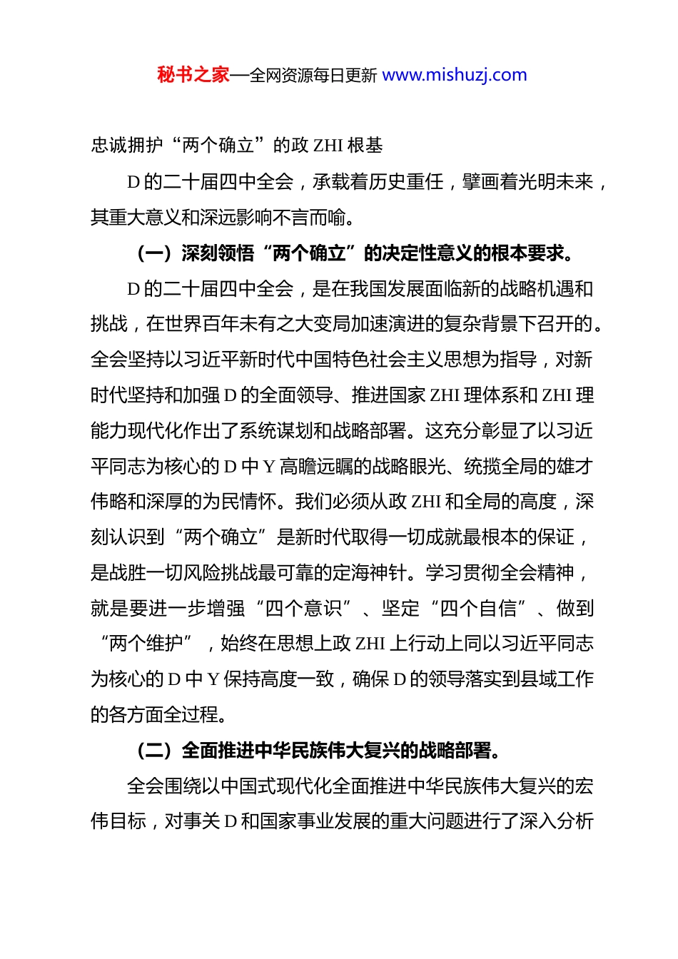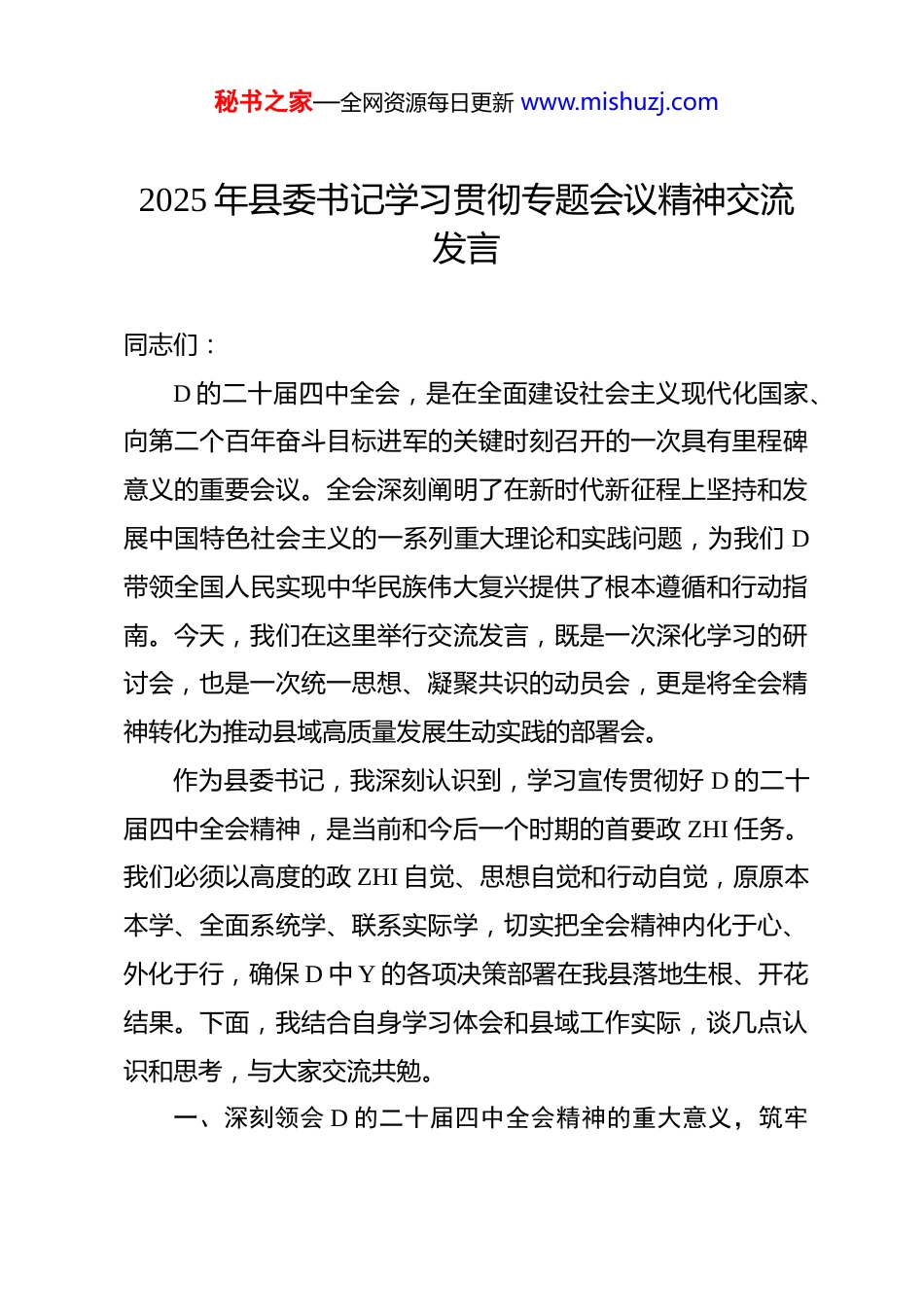 秘书之家—全网资源每日更新 www.mishuzj.com2025 年县委书记学习贯彻专题会议精神交流发言同志们:D 的二十届四中全会,是在全面建设社会主义现代化国家、向第二个百年奋斗目标进军的关键时刻召开的一次具有里程碑意义的重要会议。全会深刻阐明了在新时代新征程上坚持和发展中国特色社会主义的一系列重大理论和实践问题,为我们 D带领全国人民实现中华民族伟大复兴提供了根本遵循和行动指南。今天,我们在这里举行交流发言,既是一次深化学习的研讨会,也是一次统一思想、凝聚共识的动员会,更是将全会精神转化为推动县域高质量发展生动实践的部署会。作为县委书记,我深刻认识到,学习宣传贯彻好 D 的二十届四中全会精神,是当前和今后一个时期的首要政 ZHI 任务。我们必须以高度的政 ZHI 自觉、思想自觉和行动自觉,原原本本学、全面系统学、联系实际学,切实把全会精神内化于心、外化于行,确保 D 中 Y 的各项决策部署在我县落地生根、开花结果。下面,我结合自身学习体会和县域工作实际,谈几点认识和思考,与大家交流共勉。一、深刻领会 D 的二十届四中全会精神的重大意义,筑牢秘书之家—全网资源每日更新 www.mishuzj.com忠诚拥护“两个确立”的政 ZHI 根基D 的二十届四中全会,承载着历史重任,擘画着光明未来,其重大意义和深远影响不言而喻。(一)深刻领悟“两个确立”的决定性意义的根本要求。D 的二十届四中全会,是在我国发展面临新的战略机遇和挑战,在世界百年未有之大变局加速演进的复杂背景下召开的。全会坚持以习近平新时代中国特色社会主义思想为指导,对新时代坚持和加强 D 的全面领导、推进国家 ZHI 理体系和 ZHI 理能力现代化作出了系统谋划和战略部署。这充分彰显了以习近平同志为核心的 D 中 Y 高瞻远瞩的战略眼光、统揽全局的雄才伟略和深厚的为民情怀。我们必须从政 ZHI 和全局的高度,深刻认识到“两个确立”是新时代取得一切成就最根本的保证,是战胜一切风险挑战最可靠的定海神针。学习贯彻全会精神,就是要进一步增强“四个意识”、坚定“四个自信”、做到“两个维护”,始终在思想上政 ZHI 上行动上同以习近平同志为核心的 D 中 Y 保持高度一致,确保 D 的领导落实到县域工作的各方面全过程。(二)全面推进中华民族伟大复兴的战略部署。全会围绕以中国式现代化全面推进中华民族伟大复兴的宏伟目标,对事关 D 和国家事业发展的重大问题进行了深入分析秘书之家—全网资源每日更新 www.mishuzj.com和系统部署,为实现第二个百年奋斗目标提供了清晰的路线图和任务书。从实现经济高质量发展到建设社会主义文化强国,从推动全面深化改革到加强生态文明建设,从增进人民福祉到维护国家安全,全会精神覆盖了国家发展的方方面面。这要求我们必须胸怀“国之大者”,站在全国、全省、全市大局中思考和谋划县域发展,将县域的发展与国家战略紧密衔接,以一域之光为全局添彩,切实肩负起实现中华民族伟大复兴的时代重任。(三)推动县域高质量发展和现代化建设的根本遵循。当前,我县正处于转型发展的关键时期,既面临着国家战略叠加、政策红利释放的重大机遇,也面临着区域竞争激烈、自身短板突出的严峻挑战。全会精神为我们破解发展难题、增强发展动能、提升 ZHI 理效能指明了方向、提供了遵循。全会强调坚持和加强 D 的全面领导、推进国家 ZHI 理体系和 ZHI 理能力现代化、推动高质量发展、坚持以人民为中心等一系列重大论断,是指导我们做好县域各项工作的根本大法。我们必须以全会精神统一思想、武装头脑,对照全会部署要求,全面审视和谋划我县发展路径,找准切入点和着力点,将国家战略转化为县域发展的具体实践,开创我县高质量发展新局面。二、准确把握 D 的二十届四中全会精神的核心要义和实践秘书之家—全网资源每日更新 www.mishuzj.com要求,锚定县域发展的战略方向和重点任务D 的二十届四中全会内涵丰富、博大精深,我们要深刻领会其核心要义,并转化为县域发展的具体实践。(一)深刻领会坚持和加强 D 的全面领导的根本要求。全会强调,坚持和加强 D 的全面领导,是推进中国特色...