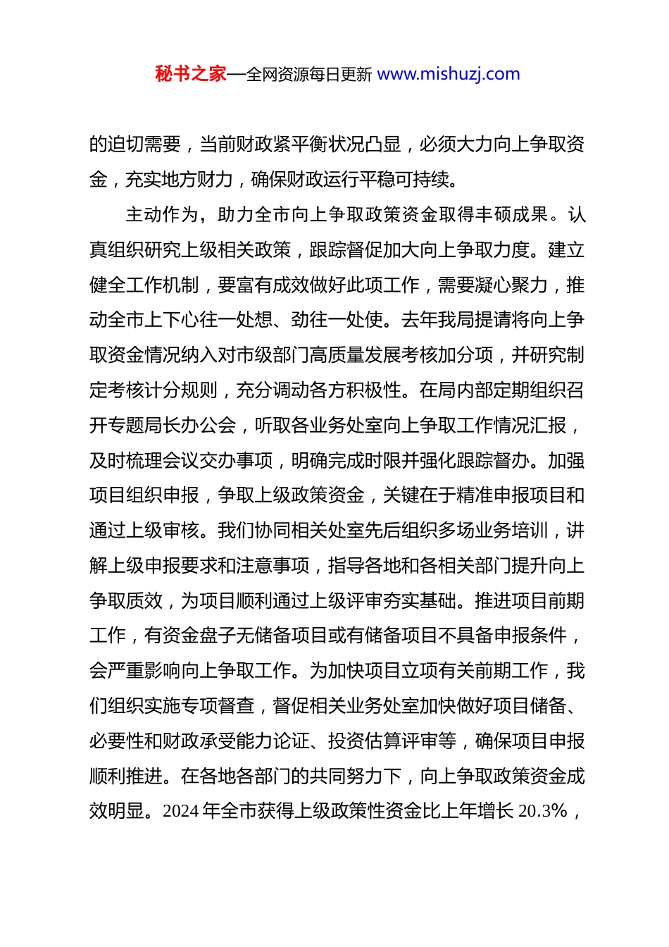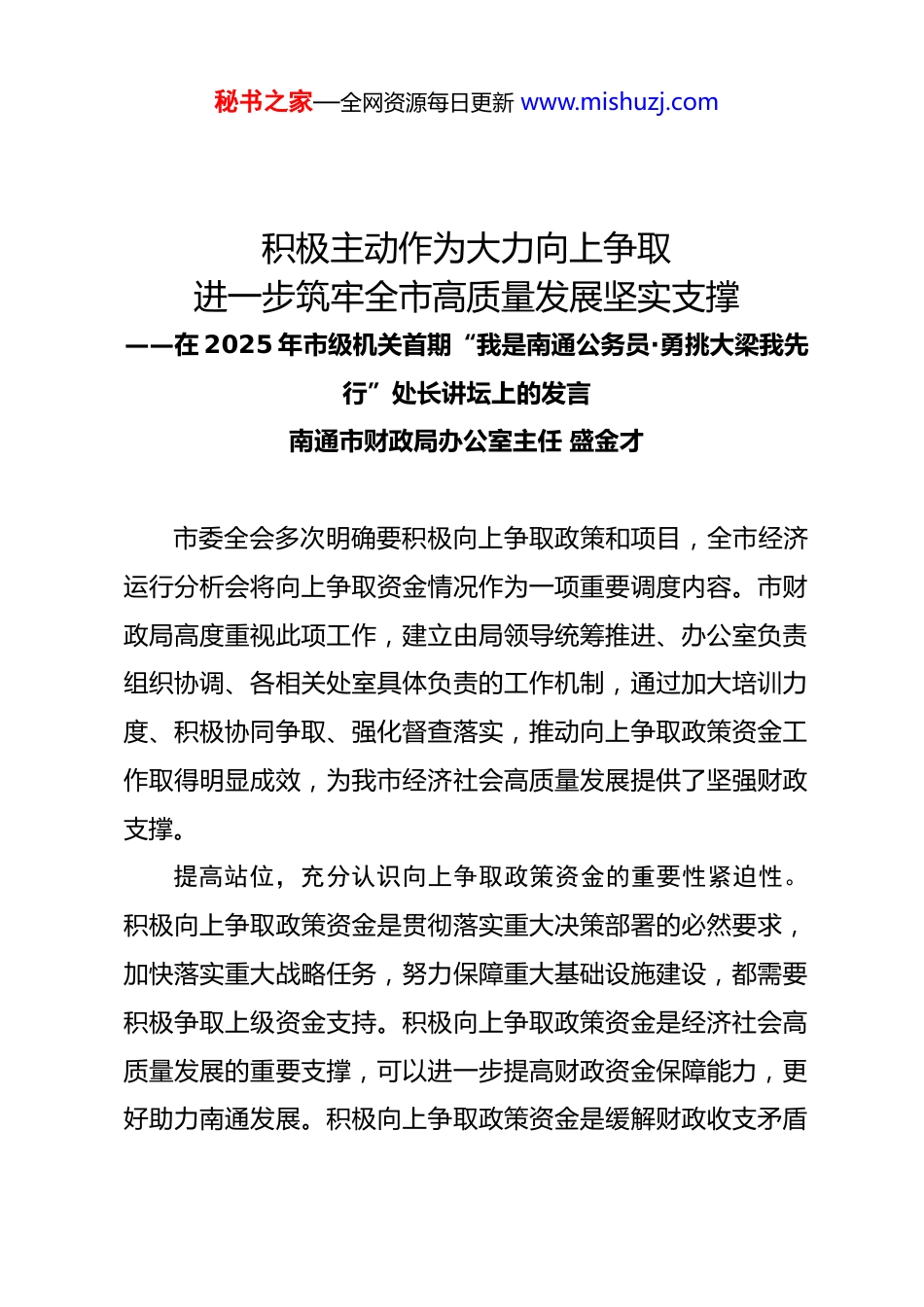 秘书之家—全网资源每日更新 www.mishuzj.com积极主动作为大力向上争取进一步筑牢全市高质量发展坚实支撑——在 2025 年市级机关首期“我是南通公务员·勇挑大梁我先行”处长讲坛上的发言南通市财政局办公室主任 盛金才市委全会多次明确要积极向上争取政策和项目,全市经济运行分析会将向上争取资金情况作为一项重要调度内容。市财政局高度重视此项工作,建立由局领导统筹推进、办公室负责组织协调、各相关处室具体负责的工作机制,通过加大培训力度、积极协同争取、强化督查落实,推动向上争取政策资金工作取得明显成效,为我市经济社会高质量发展提供了坚强财政支撑。提高站位,充分认识向上争取政策资金的重要性紧迫性。积极向上争取政策资金是贯彻落实重大决策部署的必然要求,加快落实重大战略任务,努力保障重大基础设施建设,都需要积极争取上级资金支持。积极向上争取政策资金是经济社会高质量发展的重要支撑,可以进一步提高财政资金保障能力,更好助力南通发展。积极向上争取政策资金是缓解财政收支矛盾秘书之家—全网资源每日更新 www.mishuzj.com的迫切需要,当前财政紧平衡状况凸显,必须大力向上争取资金,充实地方财力,确保财政运行平稳可持续。主动作为,助力全市向上争取政策资金取得丰硕成果。认真组织研究上级相关政策,跟踪督促加大向上争取力度。建立健全工作机制,要富有成效做好此项工作,需要凝心聚力,推动全市上下心往一处想、劲往一处使。去年我局提请将向上争取资金情况纳入对市级部门高质量发展考核加分项,并研究制定考核计分规则,充分调动各方积极性。在局内部定期组织召开专题局长办公会,听取各业务处室向上争取工作情况汇报,及时梳理会议交办事项,明确完成时限并强化跟踪督办。加强项目组织申报,争取上级政策资金,关键在于精准申报项目和通过上级审核。我们协同相关处室先后组织多场业务培训,讲解上级申报要求和注意事项,指导各地和各相关部门提升向上争取质效,为项目顺利通过上级评审夯实基础。推进项目前期工作,有资金盘子无储备项目或有储备项目不具备申报条件,会严重影响向上争取工作。为加快项目立项有关前期工作,我们组织实施专项督查,督促相关业务处室加快做好项目储备、必要性和财政承受能力论证、投资估算评审等,确保项目申报顺利推进。在各地各部门的共同努力下,向上争取政策资金成效明显。2024 年全市获得上级政策性资金比上年增长 20.3%,秘书之家—全网资源每日更新 www.mishuzj.com其中超长期特别国债资金份额位列全省第三、政府债券资金份额位列全省第四。持续发力,推动全市向上争取政策资金工作再上新台阶。通过对去年以来工作情况的分析研究,发现还存在向上争取不够积极主动,未精准掌握申报要求导致部分项目上级审核不通过,以及项目获批后推进不快等问题。要进一步发扬“钉钉子”精神,克服“差不多”心态,力求精益求精、止于至善;切实增强干字当头、干在实处、干出精彩的实践之力。加大工作力度、强化工作举措,确保在有限的资金盘子中争取获得更大份额。加强业务培训,用好政策首先要研究吃透政策,要突出善作善成,坚定不移把抢抓机遇作为制胜之道。我们将会同相关部门进一步加大政策培训力度,指导各地各单位准确把握政策关键点和申报要求,科学做好项目储备申报,推动项目申报获批率作为考核权重之一,切实提高项目成熟度和申报成功率,用好用足政策红利。强化跟踪推进,一分部署,九分落实,要坚定不移把真抓实干作为发展之基。我们将继续督促局各业务处室认真落实相关工作机制要求,加强与项目主管部门对接,密切跟踪项目申报进展,积极主动向上沟通汇报,并推动在单位内部建立激励机制,努力促进取得更大成效。推动落地见效,花钱必问效,无效必问责,要坚定不移把绩效为先作为重中之秘书之家—全网资源每日更新 www.mishuzj.com重。我们将实时跟进项目获批和资金下达情况,对获批项目实行项目库和全生命周期跟踪监督管理,加强财会监督和绩效评价,确保资金规范、高效使用,推动加快形成实物工作量,切实发挥扩投资、促增长、稳预期作用。