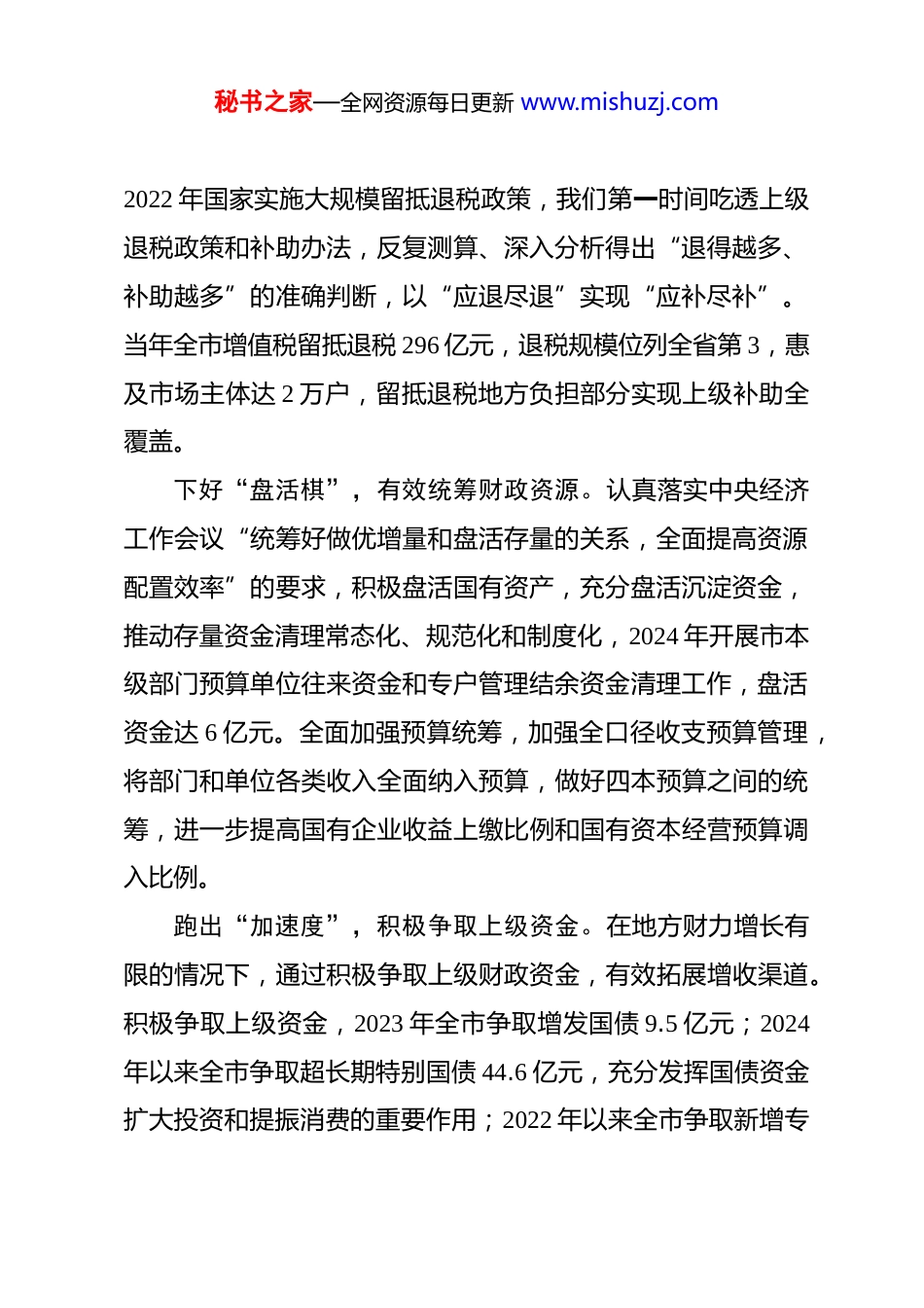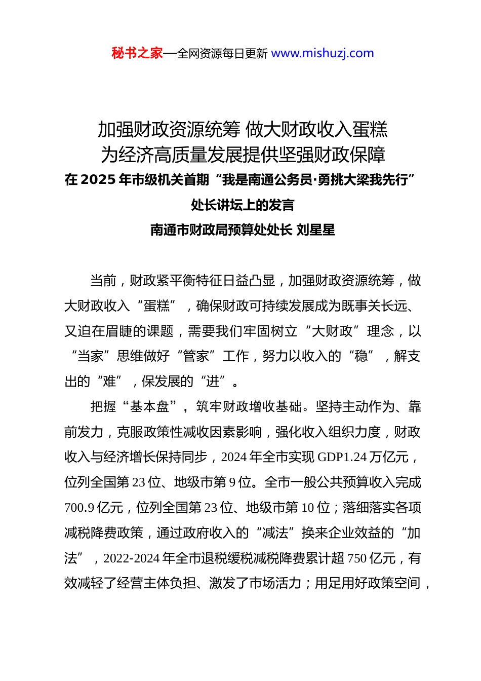 秘书之家—全网资源每日更新 www.mishuzj.com加强财政资源统筹 做大财政收入蛋糕为经济高质量发展提供坚强财政保障在 2025 年市级机关首期“我是南通公务员·勇挑大梁我先行”处长讲坛上的发言南通市财政局预算处处长 刘星星当前,财政紧平衡特征日益凸显,加强财政资源统筹,做大财政收入“蛋糕”,确保财政可持续发展成为既事关长远、又迫在眉睫的课题,需要我们牢固树立“大财政”理念,以“当家”思维做好“管家”工作,努力以收入的“稳”,解支出的“难”,保发展的“进”。把握“基本盘”,筑牢财政增收基础。坚持主动作为、靠前发力,克服政策性减收因素影响,强化收入组织力度,财政收入与经济增长保持同步,2024 年全市实现 GDP1.24 万亿元,位列全国第 23 位、地级市第 9 位。全市一般公共预算收入完成700.9 亿元,位列全国第 23 位、地级市第 10 位;落细落实各项减税降费政策,通过政府收入的“减法”换来企业效益的“加法”,2022-2024 年全市退税缓税减税降费累计超 750 亿元,有效减轻了经营主体负担、激发了市场活力;用足用好政策空间,秘书之家—全网资源每日更新 www.mishuzj.com2022 年国家实施大规模留抵退税政策,我们第一时间吃透上级退税政策和补助办法,反复测算、深入分析得出“退得越多、补助越多”的准确判断,以“应退尽退”实现“应补尽补”。当年全市增值税留抵退税 296 亿元,退税规模位列全省第 3,惠及市场主体达 2 万户,留抵退税地方负担部分实现上级补助全覆盖。下好“盘活棋”,有效统筹财政资源。认真落实中央经济工作会议“统筹好做优增量和盘活存量的关系,全面提高资源配置效率”的要求,积极盘活国有资产,充分盘活沉淀资金,推动存量资金清理常态化、规范化和制度化,2024 年开展市本级部门预算单位往来资金和专户管理结余资金清理工作,盘活资金达 6 亿元。全面加强预算统筹,加强全口径收支预算管理,将部门和单位各类收入全面纳入预算,做好四本预算之间的统筹,进一步提高国有企业收益上缴比例和国有资本经营预算调入比例。跑出“加速度”,积极争取上级资金。在地方财力增长有限的情况下,通过积极争取上级财政资金,有效拓展增收渠道。积极争取上级资金,2023 年全市争取增发国债 9.5 亿元;2024年以来全市争取超长期特别国债 44.6 亿元,充分发挥国债资金扩大投资和提振消费的重要作用;2022 年以来全市争取新增专秘书之家—全网资源每日更新 www.mishuzj.com项债券 496.3 亿元,有力支持了北沿江高铁、轨交等一批重大交通城建项目和学校、医院等重点民生项目建设。积极争取体制分成财力,认真研究省市财政体制,积极争取上级分配政策向我市倾斜,近三年体制分成财力呈逐年增长态势。同时积极向上争取完善转移支付政策体系,多次向省厅建议在确定基本公共服务领域分担比例等政策时考虑我市人口老龄化、产业结构、交通现状等要素。2024 年省对基本公共服务领域共同财政事权省级分担比例新一轮调整中,海安市、启东市由二档地区调为三档地区,转移支付明显增加。当前,我市发展面临不少挑战,特别是房地产、建筑业等传统优势产业持续低迷,收入质量较苏南地区存在一定差距。下一步,我们将充分发挥财政职能,用好用足更加积极的财政政策,推动财政收入量质齐升和可持续增长,为全市高质量发展提供坚强财政支撑。一是提升招商质效,夯实税源根基。全力支持产业链、科技、资本等九大领域招商,注重招商品质、招商效能和招商产出贡献度。二是坚持政策赋能,促进经济回升。主动承接、积极落实上级一揽子增量政策,优化完善产业、科技、人才、金融等政策体系,促进科技创新、产业焕新、数智转型。三是加大征管力度,强化挖潜增收。加强财税协同共治,持续跟踪重点税源,密切关注家纺电商和船舶行业劳务外秘书之家—全网资源每日更新 www.mishuzj.com包等暴露多年的税收流失问题,防止跑冒滴漏,确保颗粒归仓。