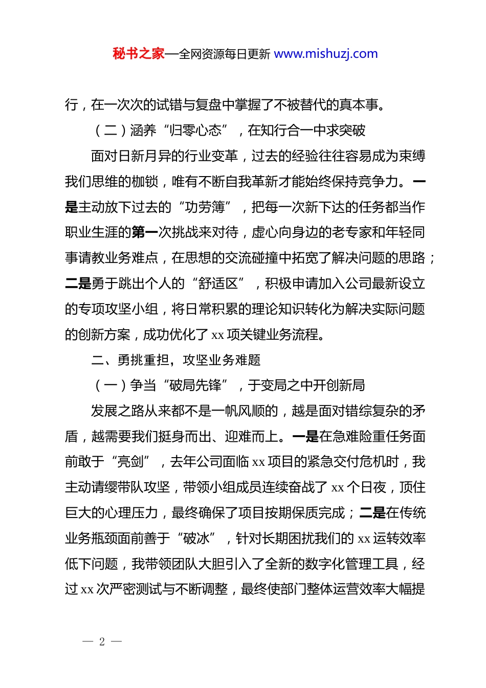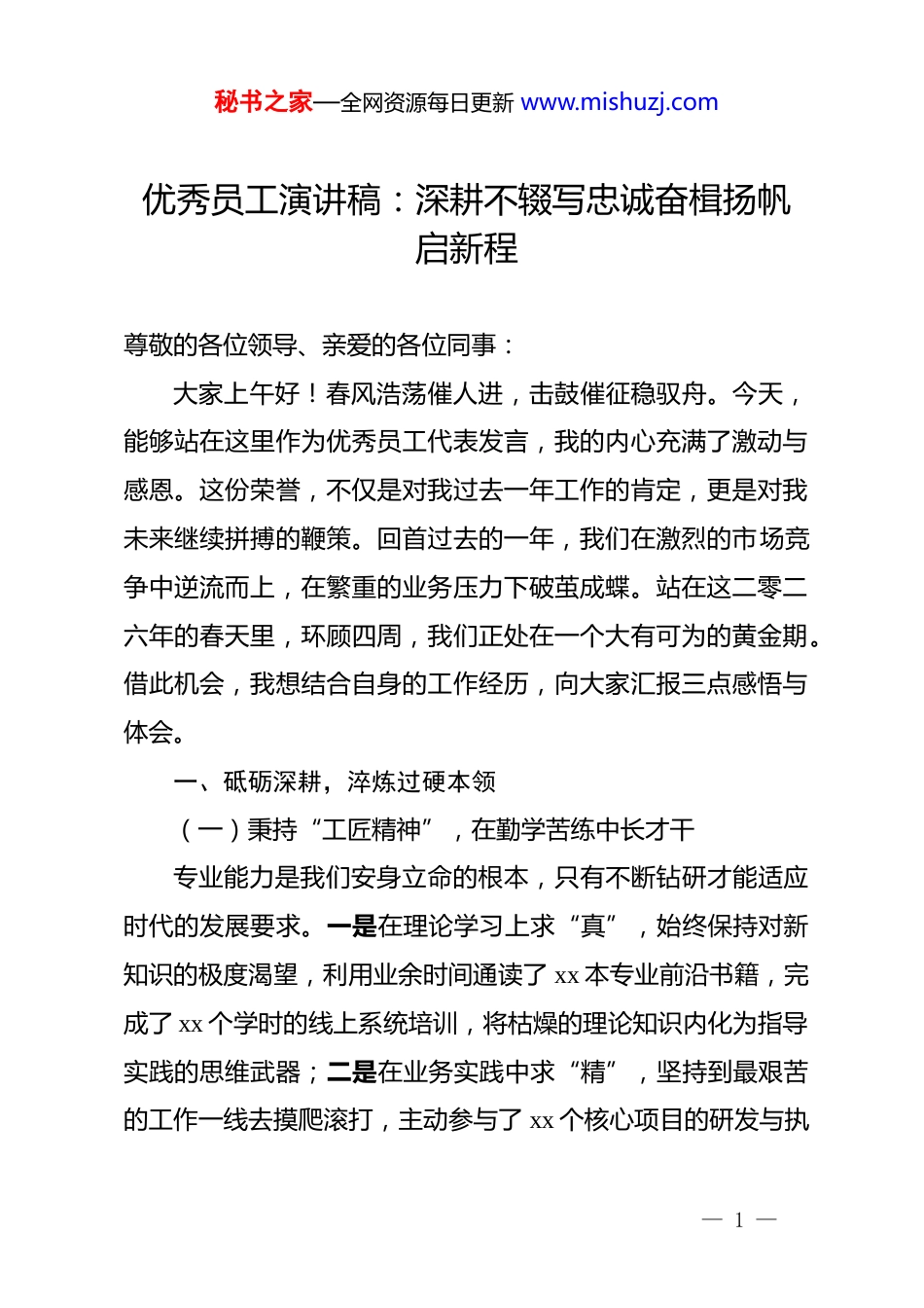 秘书之家—全网资源每日更新 www.mishuzj.com优秀员工演讲稿:深耕不辍写忠诚奋楫扬帆启新程尊敬的各位领导、亲爱的各位同事:大家上午好!春风浩荡催人进,击鼓催征稳驭舟。今天,能够站在这里作为优秀员工代表发言,我的内心充满了激动与感恩。这份荣誉,不仅是对我过去一年工作的肯定,更是对我未来继续拼搏的鞭策。回首过去的一年,我们在激烈的市场竞争中逆流而上,在繁重的业务压力下破茧成蝶。站在这二零二六年的春天里,环顾四周,我们正处在一个大有可为的黄金期。借此机会,我想结合自身的工作经历,向大家汇报三点感悟与体会。一、砥砺深耕,淬炼过硬本领(一)秉持“工匠精神”,在勤学苦练中长才干专业能力是我们安身立命的根本,只有不断钻研才能适应时代的发展要求。一是在理论学习上求“真”,始终保持对新知识的极度渴望,利用业余时间通读了 xx 本专业前沿书籍,完成了 xx 个学时的线上系统培训,将枯燥的理论知识内化为指导实践的思维武器;二是在业务实践中求“精”,坚持到最艰苦的工作一线去摸爬滚打,主动参与了 xx 个核心项目的研发与执— 1 —秘书之家—全网资源每日更新 www.mishuzj.com行,在一次次的试错与复盘中掌握了不被替代的真本事。(二)涵养“归零心态”,在知行合一中求突破面对日新月异的行业变革,过去的经验往往容易成为束缚我们思维的枷锁,唯有不断自我革新才能始终保持竞争力。一是主动放下过去的“功劳簿”,把每一次新下达的任务都当作职业生涯的第一次挑战来对待,虚心向身边的老专家和年轻同事请教业务难点,在思想的交流碰撞中拓宽了解决问题的思路;二是勇于跳出个人的“舒适区”,积极申请加入公司最新设立的专项攻坚小组,将日常积累的理论知识转化为解决实际问题的创新方案,成功优化了 xx 项关键业务流程。二、勇挑重担,攻坚业务难题(一)争当“破局先锋”,于变局之中开创新局发展之路从来都不是一帆风顺的,越是面对错综复杂的矛盾,越需要我们挺身而出、迎难而上。一是在急难险重任务面前敢于“亮剑”,去年公司面临 xx 项目的紧急交付危机时,我主动请缨带队攻坚,带领小组成员连续奋战了 xx 个日夜,顶住巨大的心理压力,最终确保了项目按期保质完成;二是在传统业务瓶颈面前善于“破冰”,针对长期困扰我们的 xx 运转效率低下问题,我带领团队大胆引入了全新的数字化管理工具,经过 xx 次严密测试与不断调整,最终使部门整体运营效率大幅提— 2 —秘书之家—全网资源每日更新 www.mishuzj.com升了 xx%。(二)坚守“压舱基石”,于大考面前彰显担当越是在追求速度与效益的高速发展阶段,越需要有人默默守住质量与安全的底线,做企业前行路上最坚实的后盾。一是严把业务输出的“质量关”,在日常繁杂的工作中建立起极其严苛的自查自纠工作机制,对经手的 xx 份重要战略文件和 xx个核心关键数据进行了逐字逐句的反复核对,实现了全年业务推进零差错的骄人记录;二是筑牢防范危机的“防火墙”,密切关注宏观经济走向与行业市场风向,精准预判了 xx 次可能对公司主营业务造成严重冲击的潜在风险,并联合相关部门提前制定了详尽周密的应对预案,为公司切实挽回了 xx 万元的直接经济损失。三、锚定未来,续写奋斗华章(一)点燃“星火微光”,以团队协作聚木成林一滴水只有放进大海里才永远不会干涸,一个人的力量再耀眼也离不开优秀团队的滋养与支撑。一是毫不保留地发挥“传帮带”作用,主动担任了 xx 名新入职大学生的业务导师,将自己多年在市场上积累的实战经验和工作技巧倾囊相授,帮助他们迅速褪去青涩,快速成长为独当一面的骨干力量;二是全心全意地当好“螺丝钉”角色,在跨部门协作的复杂网络中— 3 —秘书之家—全网资源每日更新 www.mishuzj.com始终秉持全局观念,从不计较个人部门的短期得失,积极配合其他业务线高效完成了 xx 项跨界联合攻关任务,用实打实的行动诠释了休戚与共的深厚团队精神。(二)高扬“实干风帆”,以奋进姿态扬帆远航站在二零二六年启航的崭新起点上,昨日的鲜花与掌声已经化作今后破浪前行的不竭动力,全新的宏伟征程正等待着我们去奋力开拓...