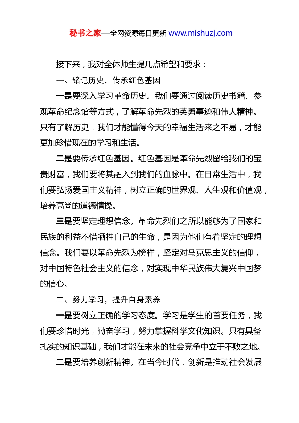 秘书之家—全网资源每日更新 www.mishuzj.com在 2026 年清明祭扫活动上的讲话 尊敬的老师们、亲爱的同学们:大家好!在这春风轻拂、草木葳蕤的清明时节,我们怀着无比崇敬的心情,齐聚于此,举行以“缅怀英烈志,共筑强国梦”为主题的清明祭扫活动,深切缅怀那些为国家独立、民族解放和人民幸福而英勇捐躯的革命先烈。他们的丰功伟绩如同一座座不朽的丰碑,矗立在历史的长河中,激励着我们在新时代的征程中不忘初心、奋勇前行。在此,我谨代表学校党委,向长眠于此的革命先烈致以最崇高的敬意和最沉痛的哀悼!他们用热血和生命换来了我们今天的和平与安宁,他们是国家的脊梁、民族的英雄,是我们永远学习的榜样。他们的精神,是中华民族宝贵的精神财富,将永远熠熠生辉。清明,作为中华民族的传统节日,承载着我们对先人的缅怀和对历史的铭记。每一位先烈都是一座精神的灯塔,照亮我们前行的道路。作为新时代的青年,我们肩负着实现中华民族伟大复兴的历史使命,更应该铭记先烈的遗志,传承他们的精神。秘书之家—全网资源每日更新 www.mishuzj.com接下来,我对全体师生提几点希望和要求:一、铭记历史,传承红色基因一是要深入学习革命历史。我们要通过阅读历史书籍、参观革命纪念馆等方式,了解革命先烈的英勇事迹和伟大精神。只有了解历史,我们才能懂得今天的幸福生活来之不易,才能更加珍惜现在的学习和生活。二是要传承红色基因。红色基因是革命先烈留给我们的宝贵财富,我们要将其融入到我们的血脉中。在日常生活中,我们要弘扬爱国主义精神,树立正确的世界观、人生观和价值观,培养高尚的道德情操。三是要坚定理想信念。革命先烈们之所以能够为了国家和民族的利益不惜牺牲自己的生命,是因为他们有着坚定的理想信念。我们要以革命先烈为榜样,坚定对马克思主义的信仰,对中国特色社会主义的信念,对实现中华民族伟大复兴中国梦的信心。二、努力学习,提升自身素养一是要树立正确的学习态度。学习是学生的首要任务,我们要珍惜时光,勤奋学习,努力掌握科学文化知识。只有具备扎实的知识基础,我们才能在未来的社会竞争中立于不败之地。二是要培养创新精神。在当今时代,创新是推动社会发展秘书之家—全网资源每日更新 www.mishuzj.com的重要动力。我们要敢于创新,勇于探索,培养自己的创新思维和实践能力。只有不断创新,我们才能适应时代的发展需求。三是要提高综合素质。除了学习知识,我们还要注重培养自己的综合素质,包括品德修养、身体素质、艺术素养等。只有全面发展,我们才能成为有理想、有道德、有文化、有纪律的社会主义建设者和接班人。三、勇于担当,践行使命责任一是要增强社会责任感。我们生活在一个伟大的时代,国家的发展和民族的振兴需要我们每一个人的努力。我们要关心国家大事,关注社会热点问题,积极参与社会实践活动,为社会做出自己的贡献。二是要培养团队合作精神。在未来的工作和生活中,我们需要与他人合作,共同完成各项任务。我们要学会与他人沟通协作,相互支持,相互帮助,共同实现目标。三是要发扬艰苦奋斗精神。实现中华民族伟大复兴的中国梦,需要我们付出长期的努力和艰辛的奋斗。我们要不怕困难,勇于挑战,在艰苦奋斗中磨炼自己的意志,实现自己的人生价值。老师们、同学们,革命先烈们的精神是我们前进的动力,他们的遗志是我们奋斗的目标。让我们在缅怀先烈的同时,汲秘书之家—全网资源每日更新 www.mishuzj.com取他们的精神力量,以更加饱满的热情、更加坚定的信念,投入到学习和工作中去。最后,让我们一起默哀,向革命先烈致以最崇高的敬意!让我们铭记他们的功勋,传承他们的精神,为实现中华民族伟大复兴的中国梦而努力奋斗!