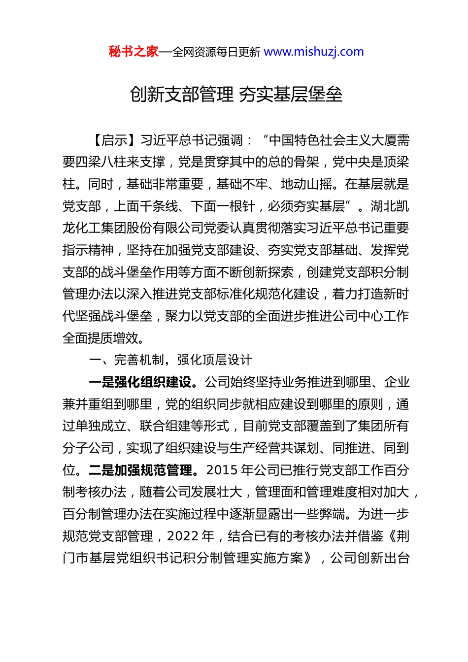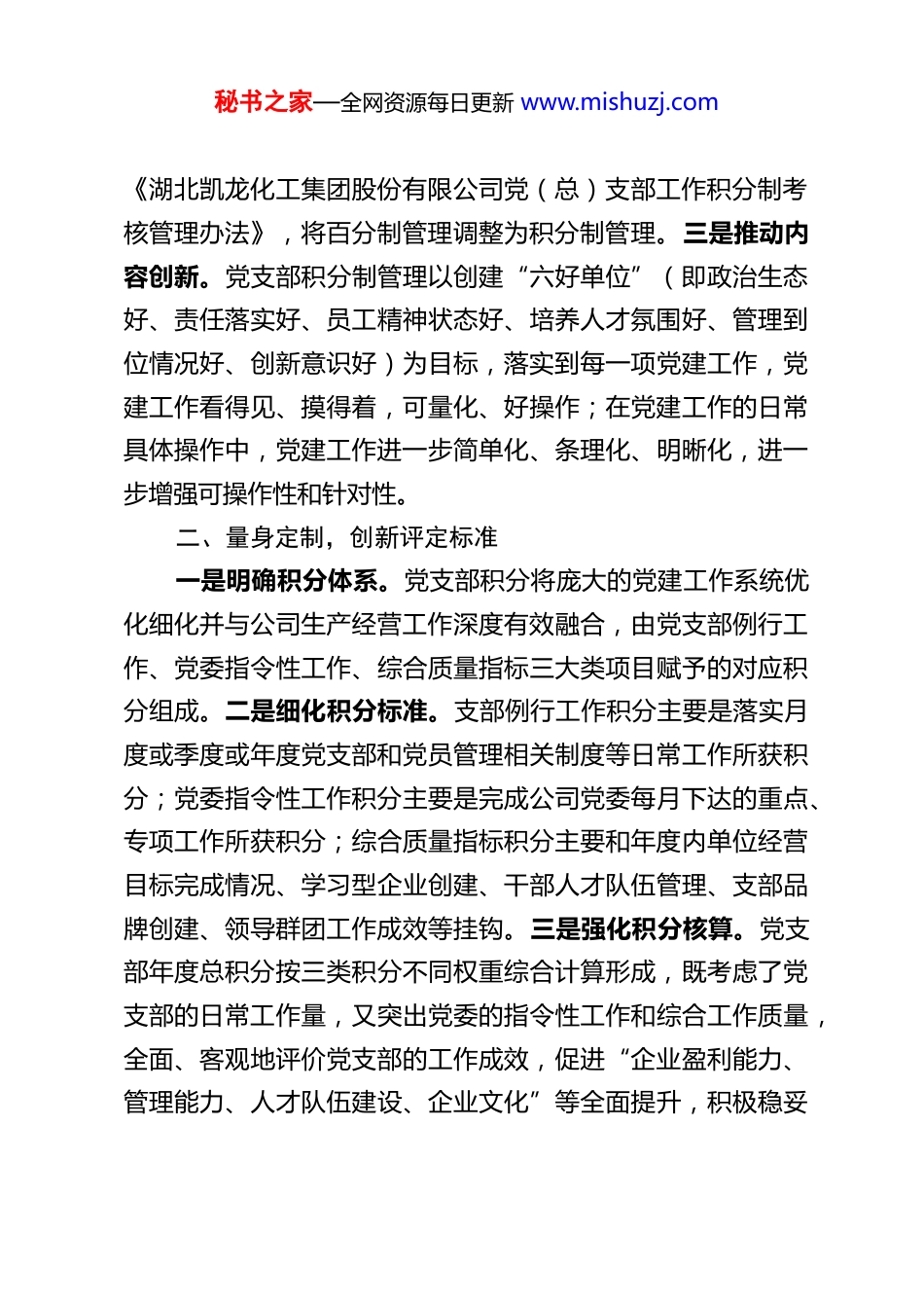秘书之家—全网资源每日更新 www.mishuzj.com创新支部管理 夯实基层堡垒【启示】习近平总书记强调:“中国特色社会主义大厦需要四梁八柱来支撑,党是贯穿其中的总的骨架,党中央是顶梁柱。同时,基础非常重要,基础不牢、地动山摇。在基层就是党支部,上面千条线、下面一根针,必须夯实基层”。湖北凯龙化工集团股份有限公司党委认真贯彻落实习近平总书记重要指示精神,坚持在加强党支部建设、夯实党支部基础、发挥党支部的战斗堡垒作用等方面不断创新探索,创建党支部积分制管理办法以深入推进党支部标准化规范化建设,着力打造新时代坚强战斗堡垒,聚力以党支部的全面进步推进公司中心工作全面提质增效。一、完善机制,强化顶层设计一是强化组织建设。公司始终坚持业务推进到哪里、企业兼并重组到哪里,党的组织同步就相应建设到哪里的原则,通过单独成立、联合组建等形式,目前党支部覆盖到了集团所有分子公司,实现了组织建设与生产经营共谋划、同推进、同到位。二是加强规范管理。2015 年公司已推行党支部工作百分制考核办法,随着公司发展壮大,管理面和管理难度相对加大,百分制管理办法在实施过程中逐渐显露出一些弊端。为进一步规范党支部管理,2022 年,结合已有的考核办法并借鉴《荆门市基层党组织书记积分制管理实施方案》,公司创新出台秘书之家—全网资源每日更新 www.mishuzj.com《湖北凯龙化工集团股份有限公司党(总)支部工作积分制考核管理办法》,将百分制管理调整为积分制管理。三是推动内容创新。党支部积分制管理以创建“六好单位”(即政治生态好、责任落实好、员工精神状态好、培养人才氛围好、管理到位情况好、创新意识好)为目标,落实到每一项党建工作,党建工作看得见、摸得着,可量化、好操作;在党建工作的日常具体操作中,党建工作进一步简单化、条理化、明晰化,进一步增强可操作性和针对性。二、量身定制,创新评定标准一是明确积分体系。党支部积分将庞大的党建工作系统优化细化并与公司生产经营工作深度有效融合,由党支部例行工作、党委指令性工作、综合质量指标三大类项目赋予的对应积分组成。二是细化积分标准。支部例行工作积分主要是落实月度或季度或年度党支部和党员管理相关制度等日常工作所获积分;党委指令性工作积分主要是完成公司党委每月下达的重点、专项工作所获积分;综合质量指标积分主要和年度内单位经营目标完成情况、学习型企业创建、干部人才队伍管理、支部品牌创建、领导群团工作成效等挂钩。三是强化积分核算。党支部年度总积分按三类积分不同权重综合计算形成,既考虑了党支部的日常工作量,又突出党委的指令性工作和综合工作质量,全面、客观地评价党支部的工作成效,促进“企业盈利能力、管理能力、人才队伍建设、企业文化”等全面提升,积极稳妥秘书之家—全网资源每日更新 www.mishuzj.com推进中心工作向好发展。“积分管理”将党建工作“软任务”转为“硬指标”,进一步明确党支部任务,增强各党支部对党建工作的主动性和针对性,有效激发基层党建工作活力。三、严格考核,注重结果运用支部积分以月度为周期,按照“月度统计,年度定格”的方式进行综合评定,积分制在支部规范化建设上充分发挥“指挥棒”作用,激励各党支部进一步自我加压,形成比学赶超、争当先锋的良好氛围。一是实行月度统计。每月初各党支部对照《党支部例行工作任务清单积分标准》和党委下达的当月指令性工作任务,通过公司 OA 报表流程上报当月工作计划,月底上报完成情况,上级党总支和公司党委对当月工作完成情况进行评价并逐项给予积分,当月及时公布统计情况。二是开展年度评比。年底各支部上报综合质量指标完成情况佐证材料,上级党总支和公司党委进行考评并逐项给予积分。按权重比例计算后形成支部年度总积分。公司党委对照定格标准,根据党支部年度总积分,同时考虑“一票否决”情形,对党支部给予“优秀”“良好”“合格”“基本合格”“不合格”五个档级进行定格。三是强化结果运用。积分定格结果与评先评优、工作经费标准、优秀员工评定等挂钩。2023 年,通过党支部积分制管理,公司评定 3 个“优秀”党支部,并将优秀...