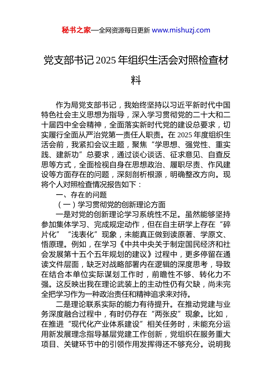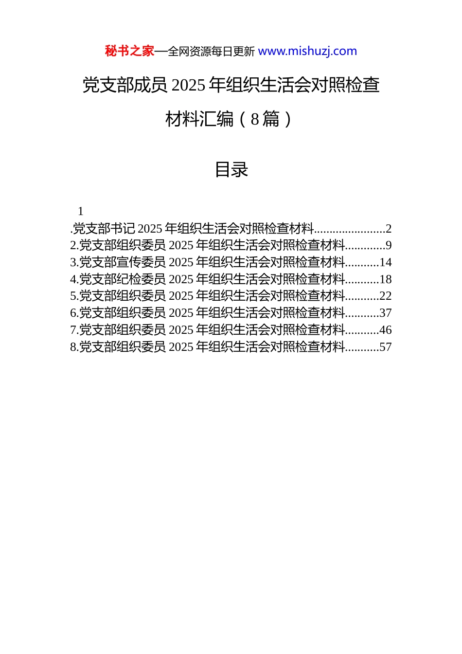 秘书之家—全网资源每日更新 www.mishuzj.com党支部成员 2025 年组织生活会对照检查材料汇编(8 篇)目录1.党支部书记 2025 年组织生活会对照检查材料.......................22.党支部组织委员 2025 年组织生活会对照检查材料.............93.党支部宣传委员 2025 年组织生活会对照检查材料...........144.党支部纪检委员 2025 年组织生活会对照检查材料...........185.党支部组织委员 2025 年组织生活会对照检查材料...........226.党支部组织委员 2025 年组织生活会对照检查材料...........377.党支部组织委员 2025 年组织生活会对照检查材料...........468.党支部组织委员 2025 年组织生活会对照检查材料...........57秘书之家—全网资源每日更新 www.mishuzj.com党支部书记 2025 年组织生活会对照检查材料作为局党支部书记,我始终坚持以习近平新时代中国特色社会主义思想为指导,深入学习贯彻党的二十大和二十届四中全会精神,全面落实新时代党的建设总要求,切实履行全面从严治党第一责任人职责。在 2025 年度组织生活会前,我紧扣会议主题,聚焦“学思想、强党性、重实践、建新功”总要求,通过谈心谈话、征求意见、自查反思等方式,全面检视自身在思想政治、履职尽责、作风建设等方面存在的问题,深刻剖析根源,明确整改方向。现将个人对照检查情况报告如下:一、存在的问题(一)学习贯彻党的创新理论方面一是对党的创新理论学习系统性不足。虽然能够坚持参加集体学习、完成规定动作,但在自主研学上存在“碎片化”“浅表化”现象,未能真正做到读原著、学原文、悟原理。例如,在学习《中共中央关于制定国民经济和社会发展第十五个五年规划的建议》过程中,更多停留在通读文件层面,缺乏对战略部署内在逻辑的深度思考,导致在结合本单位实际谋划工作时,前瞻性不够、转化力不强。这反映出我在理论武装上的主动性仍有欠缺,尚未完全把学习作为一种政治责任和精神追求来对待。二是理论联系实际的能力有待提升。在推动党建与业务深度融合过程中,有时仍存在“两张皮”现象。比如,在推进“现代化产业体系建设”相关任务时,未能充分运用新发展理念指导基层党建工作创新,党组织在服务重大项目、关键环节中的引领作用发挥得还不够充分。说明我秘书之家—全网资源每日更新 www.mishuzj.com对如何以党的创新理论破解发展难题的理解还不够透彻,学用结合的“最后一公里”尚未真正打通。(二)加强党性锻炼方面一是政治判断力、政治领悟力需进一步增强。面对复杂敏感问题时,个别时候从政治高度观察分析问题的意识还不强。例如,在处理某次群众信访事项中,初期更多关注程序合规性,而对其背后可能涉及的民生诉求与社会稳定风险预判不足,后续经上级提醒才及时调整应对策略。暴露出我在政治敏锐性和大局观上还有短板,没有时刻做到胸怀“国之大者”。二是党内政治生活质量有待提高。作为支部书记,在主持组织生活会、开展批评与自我批评时,有时存在“老好人”思想,对班子成员提醒多、点问题少,怕伤和气、影响团结。个别同志指出,“红脸出汗”的效果打了折扣。这说明我在严肃党内政治生活上还缺乏足够勇气和斗争精神,离高标准严要求尚有差距。(三)联系服务群众方面一是深入一线调研不够扎实。尽管制定了年度调研计划,但受事务性工作牵绊,真正沉到基层一线的时间偏少,听汇报多、看材料多,面对面听取干部职工和服务对象意见建议相对不足。特别是在推动社区适老化改造项目中,前期征求居民意见不够广泛,导致部分设施建成后使用率不高。反映出我宗旨意识树得不牢,群众路线践行不到位。二是回应群众关切的时效性有待加强。对于一些历史遗留问题或跨部门协调事项,存在等待观望心态,主动攻坚克难的劲头不足。如某老旧小区加装电梯推进缓慢,虽多次开会研究,但实质性进展有限,群众满意度不高。说明我在担当作为上还需加压奋进,解决急难愁盼问题的力度亟待加大。(四)发挥先锋模范作用方面秘书之家—全网资源每日更新 www.mishuzj.com一是在重大任务面前示范引领作用发挥不充分。面对机构改革、职能调整等重点工作,虽然能够坚守岗位、履职...