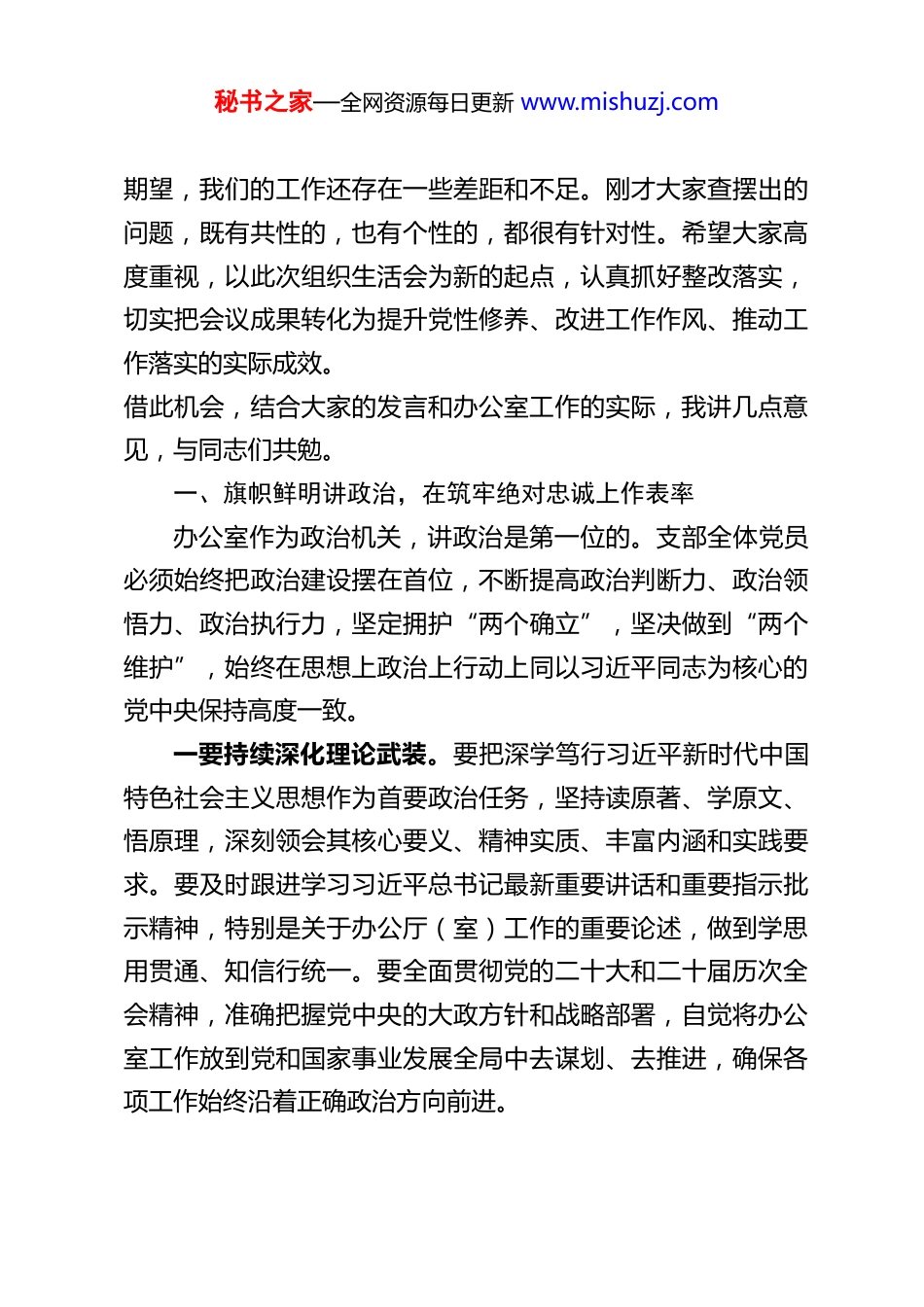 秘书之家—全网资源每日更新 www.mishuzj.comXX 市长在市人民政府办公室机关第一党支部2025 年度组织生活会上的讲话同志们:今天,我以一名普通党员的身份,参加市政府办公室机关第一党支部 2025 年度组织生活会,与支部的同志们面对面交流,感到十分高兴。刚才,支部负责同志代表支委会作了对照检查,通报了上年度组织生活会整改落实情况和贯彻中央八项规定精神学习教育整改整治情况,几位同志也结合思想和工作实际,认真开展了个人对照检查,进行了深刻的批评与自我批评。总的来看,这次组织生活会准备充分、主题鲜明、程序规范,查摆问题比较深入,相互批评开诚布公,整改方向清晰明确,达到了统一思想、增进团结、改进工作、担当使命的预期效果,是一次高质量的组织生活会。办公室是市政府运转的中枢机构,是承上启下、协调左右联系内外的关键环节。办公室第一党支部作为其中的重要组成部分,位置特殊、责任重大。过去一年,大家围绕中心、服务大局,恪尽职守、勤勉工作,在参谋辅政、统筹协调、督促落实、服务保障等方面做了大量卓有成效的工作,有力保障了市政府各项工作的有序高效运转,成绩值得肯定。但同时,我们也要清醒地认识到,面对新形势新任务新要求,对照党中央的决策部署,对照高质量发展的时代课题,对照全市人民的殷切秘书之家—全网资源每日更新 www.mishuzj.com期望,我们的工作还存在一些差距和不足。刚才大家查摆出的问题,既有共性的,也有个性的,都很有针对性。希望大家高度重视,以此次组织生活会为新的起点,认真抓好整改落实,切实把会议成果转化为提升党性修养、改进工作作风、推动工作落实的实际成效。借此机会,结合大家的发言和办公室工作的实际,我讲几点意见,与同志们共勉。一、旗帜鲜明讲政治,在筑牢绝对忠诚上作表率办公室作为政治机关,讲政治是第一位的。支部全体党员必须始终把政治建设摆在首位,不断提高政治判断力、政治领悟力、政治执行力,坚定拥护“两个确立”,坚决做到“两个维护”,始终在思想上政治上行动上同以习近平同志为核心的党中央保持高度一致。一要持续深化理论武装。要把深学笃行习近平新时代中国特色社会主义思想作为首要政治任务,坚持读原著、学原文、悟原理,深刻领会其核心要义、精神实质、丰富内涵和实践要求。要及时跟进学习习近平总书记最新重要讲话和重要指示批示精神,特别是关于办公厅(室)工作的重要论述,做到学思用贯通、知信行统一。要全面贯彻党的二十大和二十届历次全会精神,准确把握党中央的大政方针和战略部署,自觉将办公室工作放到党和国家事业发展全局中去谋划、去推进,确保各项工作始终沿着正确政治方向前进。秘书之家—全网资源每日更新 www.mishuzj.com二要筑牢绝对忠诚根基。对党绝对忠诚是办公室工作的生命线。要把讲政治的要求贯穿于办公室工作的全过程、各方面,体现到办文、办会、办事的具体行动上。要严守党的政治纪律和政治规矩,在大是大非面前头脑清醒、立场坚定,在任何时候、任何情况下都做到政治信仰不变、政治立场不移、政治方向不偏。要坚决贯彻执行党中央、自治区党委和市委的各项决策部署,做到政令畅通、令行禁止,确保上级精神不折不扣落到实处,决不允许打折扣、搞变通、做选择。要把对党忠诚体现在履职尽责、做好本职工作的实效上,以实实在在的工作成效诠释政治担当。三要提升政治能力。办公室工作无小事,事事连着政治。要善于从政治上看问题、想问题、办事情,不断增强政治敏锐性和政治鉴别力。在起草文稿、报送信息、协调事务、处理问题等各项工作中,都要首先考虑政治因素、把握政治风险、注重政治影响。要站在全市发展大局的高度,深刻领会市委、市政府的战略意图和工作部署,确保各项工作与中心任务同频共振、同向发力。要敢于同各种错误思想和言行作斗争,坚决维护党的集中统一领导,坚决维护党和政府的形象。二、围绕中心强本领,在服务发展大局上作贡献今年是“十五五”开局之年,做好各项工作意义重大。办公室作为市政府科学决策和高效运转的重要支撑,必须胸怀“国之大者”,紧紧围绕全市经济社会发展大局,不断提升履秘书之家—全网资源每日更...