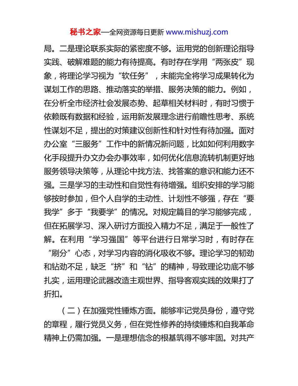 秘书之家—全网资源每日更新 www.mishuzj.com市政府办公室党员干部 2025 年度专题组织生活会对照检查材料根据市政府办公室党组关于召开 2025 年度专题组织生活会的统一部署和要求,本人紧扣会议主题,在认真参加集体学习、广泛征求意见建议的基础上,紧密联系个人思想、学习和工作实际,对照五个方面重点内容,深入查摆自身存在的突出问题,深刻剖析问题根源,并明确了今后的努力方向和整改措施。现将对照检查情况报告如下。一、存在的主要问题(一)在学习贯彻党的创新理论方面。能够坚持参加集体学习,跟进学习党的最新理论成果和重要指示精神,但在学懂弄通做实、转化运用上仍有差距。一是理论学习的深度和系统性不足。对新时代中国特色社会主义思想的学习,有时满足于“读过了”“学过了”,对其核心要义、精神实质、丰富内涵、实践要求的理解还不够系统全面,存在碎片化现象。在“知其然”上花时间多,在“知其所以然”“知其所以必然”上钻研不够,对其中蕴含的马克思主义立场观点方法掌握运用不够纯熟。例如,在理解“国之大者”与自身承担的文稿起草、信息报送、协调服务等具体工作的内在联系上,有时思考不深、结合不紧,未能完全做到胸怀大局、立足岗位、服务全秘书之家—全网资源每日更新 www.mishuzj.com局。二是理论联系实际的紧密度不够。运用党的创新理论指导实践、破解难题的能力有待提高。有时存在学用“两张皮”现象,将理论学习视为“软任务”,未能完全将学习成果转化为谋划工作的思路、推动落实的举措、服务决策的能力。例如,在分析全市经济社会发展态势、起草相关材料时,有时习惯于依赖既有数据和经验,运用新发展理念进行前瞻性思考、系统性谋划不足,提出的对策建议创新性和针对性有待加强。面对办公室“三服务”工作中的新情况新问题,比如如何利用数字化手段提升办文办会办事效率,如何优化信息流转机制更好地服务领导决策等,从理论中找方法、找答案的意识和能力还不强。三是学习的主动性和自觉性有待增强。组织安排的学习能够按时参加,但个人自学的主动性、计划性不够强,存在“要我学”多于“我要学”的情况。对规定篇目的学习能够完成,但在拓展学习、深入研讨方面投入精力不足,满足于一般性了解。在利用“学习强国”等平台进行日常学习时,有时存在“刷分”心态,对学习内容的消化吸收不够。理论学习的韧劲和钻劲不足,缺乏“挤”和“钻”的精神,导致理论功底不够扎实,运用理论武器改造主观世界、指导客观实践的效果打了折扣。(二)在加强党性锤炼方面。能够牢记党员身份,遵守党的章程,履行党员义务,但在党性修养的持续锤炼和自我革命精神上仍需加强。一是理想信念的根基筑得不够牢固。对共产秘书之家—全网资源每日更新 www.mishuzj.com主义远大理想和中国特色社会主义共同理想的认识,有时停留在理论认知层面,将其内化为坚定不移的政治信仰、转化为攻坚克难的强大精神动力还不够充分。在长期和平环境和机关工作中,有时不自觉地淡忘了革命战争年代先辈们的那种牺牲精神和奋斗激情,对比先进典型和身边榜样,感觉自身在党性修养、境界格局上还有不小差距。面对社会上的一些错误思潮和复杂现象,虽然能够保持政治定力,但主动从理论上辨析、从思想上斗争的锐气不足。二是党性锻炼的主动性和经常性不足。参加党的组织生活有时存在“例行公事”心态,虽然能够完成“规定动作”,但在“自选动作”上思考不多、创新不足。在“三会一课”、主题党日等活动中,有时满足于“到场”,深入交流思想、主动接受教育熏陶的深度不够。运用批评和自我批评武器不够经常、不够有力,在组织生活会上,自我批评有时“避重就轻”,怕揭短亮丑;相互批评有时“和风细雨”,怕得罪人、伤和气,未能真正达到“红脸出汗、排毒治病”的效果。对照党章党规党纪进行自我检视、自我反省不够自觉主动,打扫思想灰尘、净化政治灵魂的“每日功课”坚持得不够好。三是斗争精神和奋斗精神有所弱化。随着工作年限增长,有时产生了“求稳”心态,锐意进取、敢为人先的劲头不如从前。在办公室工作中,对一些沿用已久的惯例、程序,即使感觉存在优化空间,有时也因担...