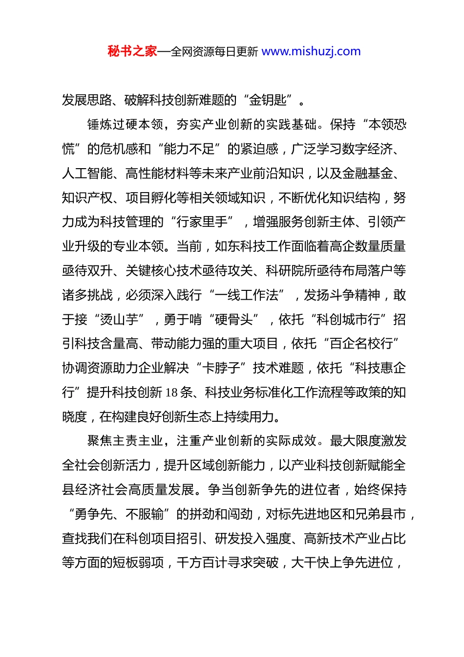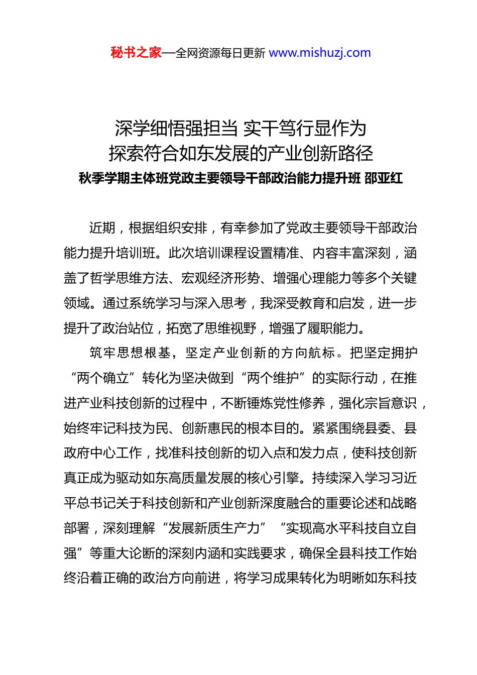 秘书之家—全网资源每日更新 www.mishuzj.com深学细悟强担当 实干笃行显作为探索符合如东发展的产业创新路径秋季学期主体班党政主要领导干部政治能力提升班 邵亚红近期,根据组织安排,有幸参加了党政主要领导干部政治能力提升培训班。此次培训课程设置精准、内容丰富深刻,涵盖了哲学思维方法、宏观经济形势、增强心理能力等多个关键领域。通过系统学习与深入思考,我深受教育和启发,进一步提升了政治站位,拓宽了思维视野,增强了履职能力。筑牢思想根基,坚定产业创新的方向航标。把坚定拥护“两个确立”转化为坚决做到“两个维护”的实际行动,在推进产业科技创新的过程中,不断锤炼党性修养,强化宗旨意识,始终牢记科技为民、创新惠民的根本目的。紧紧围绕县委、县政府中心工作,找准科技创新的切入点和发力点,使科技创新真正成为驱动如东高质量发展的核心引擎。持续深入学习习近平总书记关于科技创新和产业创新深度融合的重要论述和战略部署,深刻理解“发展新质生产力”“实现高水平科技自立自强”等重大论断的深刻内涵和实践要求,确保全县科技工作始终沿着正确的政治方向前进,将学习成果转化为明晰如东科技秘书之家—全网资源每日更新 www.mishuzj.com发展思路、破解科技创新难题的“金钥匙”。锤炼过硬本领,夯实产业创新的实践基础。保持“本领恐慌”的危机感和“能力不足”的紧迫感,广泛学习数字经济、人工智能、高性能材料等未来产业前沿知识,以及金融基金、知识产权、项目孵化等相关领域知识,不断优化知识结构,努力成为科技管理的“行家里手”,增强服务创新主体、引领产业升级的专业本领。当前,如东科技工作面临着高企数量质量亟待双升、关键核心技术亟待攻关、科研院所亟待布局落户等诸多挑战,必须深入践行“一线工作法”,发扬斗争精神,敢于接“烫山芋”,勇于啃“硬骨头”,依托“科创城市行”招引科技含量高、带动能力强的重大项目,依托“百企名校行”协调资源助力企业解决“卡脖子”技术难题,依托“科技惠企行”提升科技创新 18 条、科技业务标准化工作流程等政策的知晓度,在构建良好创新生态上持续用力。聚焦主责主业,注重产业创新的实际成效。最大限度激发全社会创新活力,提升区域创新能力,以产业科技创新赋能全县经济社会高质量发展。争当创新争先的进位者,始终保持“勇争先、不服输”的拼劲和闯劲,对标先进地区和兄弟县市,查找我们在科创项目招引、研发投入强度、高新技术产业占比等方面的短板弱项,千方百计寻求突破,大干快上争先进位,秘书之家—全网资源每日更新 www.mishuzj.com努力推动如东科技创新工作在全市乃至全省格局中位置前移。牢固树立效率意识,全面提振科技条线干部干事创业的精气神,营造比学赶超、争创一流的浓厚氛围。争当清廉高效的护航者,带头修身律己,教育引导科技条线干部知敬畏、存戒惧、守底线,确保每一项科技政策、每一分科技资金都用在刀刃上,做到既能干成事、又不出事,以风清气正的政治生态和清廉务实的作风底色,护航科技创新事业行稳致远,以“恪尽职守”的强烈责任感践行科技担当。执立足本职勇担当务实奋进绘新篇全力推进双甸镇高质量发展秋季学期主体班县管领导干部进修一班 冒 军聆听了县委杨书记的“开学第一课”以及后续的专题授课,我深受教育、倍感振奋。我将以此次培训为新的起点,深刻领会、自觉践行“实干担当”的要求,把所学所思所悟转化为推动工作的具体行动和实际成效,兢兢业业、奋发有为,为全镇乃至全县高质量发展贡献自己应有的力量。提高认识,筑牢“想干事”的思想根基,以坚定信念引领实干担当。切实提高从全局高度分析研判形势、谋划推动发展秘书之家—全网资源每日更新 www.mishuzj.com的能力,例如,在工业发展上,要精准把握国家产业政策导向和科技变革趋势,明确我镇纺织产业转型升级的主攻方向;在服务业布局上,深刻理解扩大内需战略内涵,以乡村志愿者为主体,以助企助农直播为重点,向下游终端产品延伸,找准激发本地消费潜力、培育新增长点的路径。始终坚持以人民为中心的发展思想,将群众满意度作为检验工作成效的根本标准,把有限的财力更多投向教育...