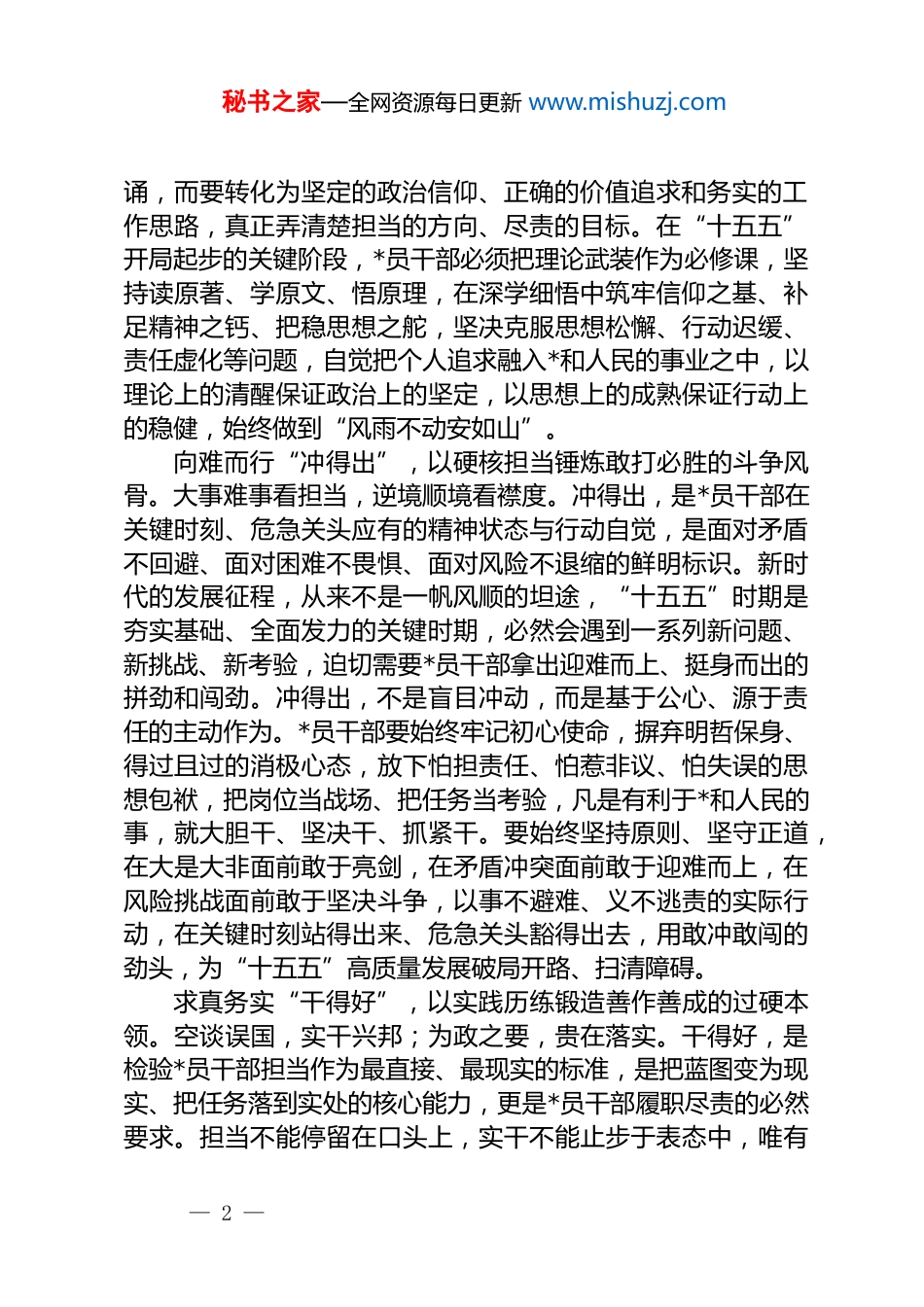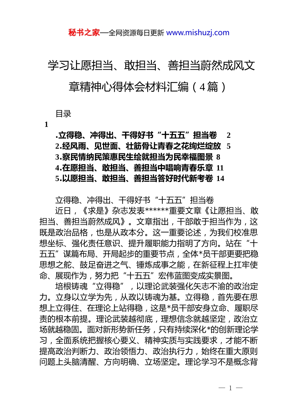 秘书之家—全网资源每日更新 www.mishuzj.com学习让愿担当、敢担当、善担当蔚然成风文章精神心得体会材料汇编(4 篇)目录1.立得稳、冲得出、干得好书“十五五”担当卷22.经风雨、见世面、壮筋骨让青春之花绚烂绽放 53.察民情纳民策惠民生绘就担当为民幸福图景 84.在愿担当、敢担当、善担当中唱响青春乐章 115.以愿担当、敢担当、善担当答好时代新考卷 14立得稳、冲得出、干得好书“十五五”担当卷近日,《求是》杂志发表******重要文章《让愿担当、敢担当、善担当蔚然成风》。文章指出,干部敢于担当作为,这既是政治品格,也是从政本分。这一重要论述,为我们校准思想坐标、强化责任意识、提升履职能力指明了方向。站在“十五五”谋篇布局、开局起步的重要节点,全体*员干部更要把稳思想之舵、鼓足奋进之气、锤炼成事之能,在新征程上扛牢使命、展现作为,努力把“十五五”宏伟蓝图变成实景图。培根铸魂“立得稳”,以理论武装强化矢志不渝的政治定力。立身以立学为先,从政以铸魂为基。立得稳,首先要在思想上立得住、在理论上站得稳,这是*员干部安身立命、履职尽责的根本前提。理论武装越彻底,理想信念就越坚定,政治立场就越稳固。面对新形势新任务,只有持续深化*的创新理论学习,全面系统把握核心要义、精神实质与实践要求,才能不断提高政治判断力、政治领悟力、政治执行力,始终在重大原则问题上头脑清醒、方向明确、立场坚定。理论学习不是概念背— 1 —秘书之家—全网资源每日更新 www.mishuzj.com诵,而要转化为坚定的政治信仰、正确的价值追求和务实的工作思路,真正弄清楚担当的方向、尽责的目标。在“十五五”开局起步的关键阶段,*员干部必须把理论武装作为必修课,坚持读原著、学原文、悟原理,在深学细悟中筑牢信仰之基、补足精神之钙、把稳思想之舵,坚决克服思想松懈、行动迟缓、责任虚化等问题,自觉把个人追求融入*和人民的事业之中,以理论上的清醒保证政治上的坚定,以思想上的成熟保证行动上的稳健,始终做到“风雨不动安如山”。向难而行“冲得出”,以硬核担当锤炼敢打必胜的斗争风骨。大事难事看担当,逆境顺境看襟度。冲得出,是*员干部在关键时刻、危急关头应有的精神状态与行动自觉,是面对矛盾不回避、面对困难不畏惧、面对风险不退缩的鲜明标识。新时代的发展征程,从来不是一帆风顺的坦途,“十五五”时期是夯实基础、全面发力的关键时期,必然会遇到一系列新问题、新挑战、新考验,迫切需要*员干部拿出迎难而上、挺身而出的拼劲和闯劲。冲得出,不是盲目冲动,而是基于公心、源于责任的主动作为。*员干部要始终牢记初心使命,摒弃明哲保身、得过且过的消极心态,放下怕担责任、怕惹非议、怕失误的思想包袱,把岗位当战场、把任务当考验,凡是有利于*和人民的事,就大胆干、坚决干、抓紧干。要始终坚持原则、坚守正道,在大是大非面前敢于亮剑,在矛盾冲突面前敢于迎难而上,在风险挑战面前敢于坚决斗争,以事不避难、义不逃责的实际行动,在关键时刻站得出来、危急关头豁得出去,用敢冲敢闯的劲头,为“十五五”高质量发展破局开路、扫清障碍。求真务实“干得好”,以实践历练锻造善作善成的过硬本领。空谈误国,实干兴邦;为政之要,贵在落实。干得好,是检验*员干部担当作为最直接、最现实的标准,是把蓝图变为现实、把任务落到实处的核心能力,更是*员干部履职尽责的必然要求。担当不能停留在口头上,实干不能止步于表态中,唯有— 2 —秘书之家—全网资源每日更新 www.mishuzj.com把事情干扎实、干到位、干出成效,才是真正的担当。“十五五”发展目标清晰、任务艰巨,无论是推动经济转型升级、深化重点领域改革,还是保障改善民生、提升治理效能,都需要*员干部沉下身子、迈开步子,在实践中找办法、在实干中解难题。基层是最好的课堂,实践是最好的教材,群众是最好的老师。要坚持在干中学、在学中干,主动到基层一线、艰苦岗位、复杂环境中磨炼意志、增长才干,精准掌握基层实情、细致了解群众需求,着力提升政策执行、群众工作、统筹协调、破解难题等实际能力,不断增强工作的科学性、针对性和实效性。要力戒形式主义、...
