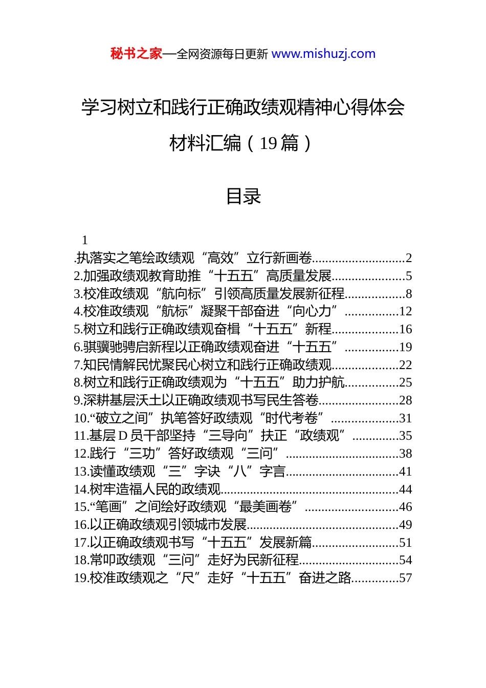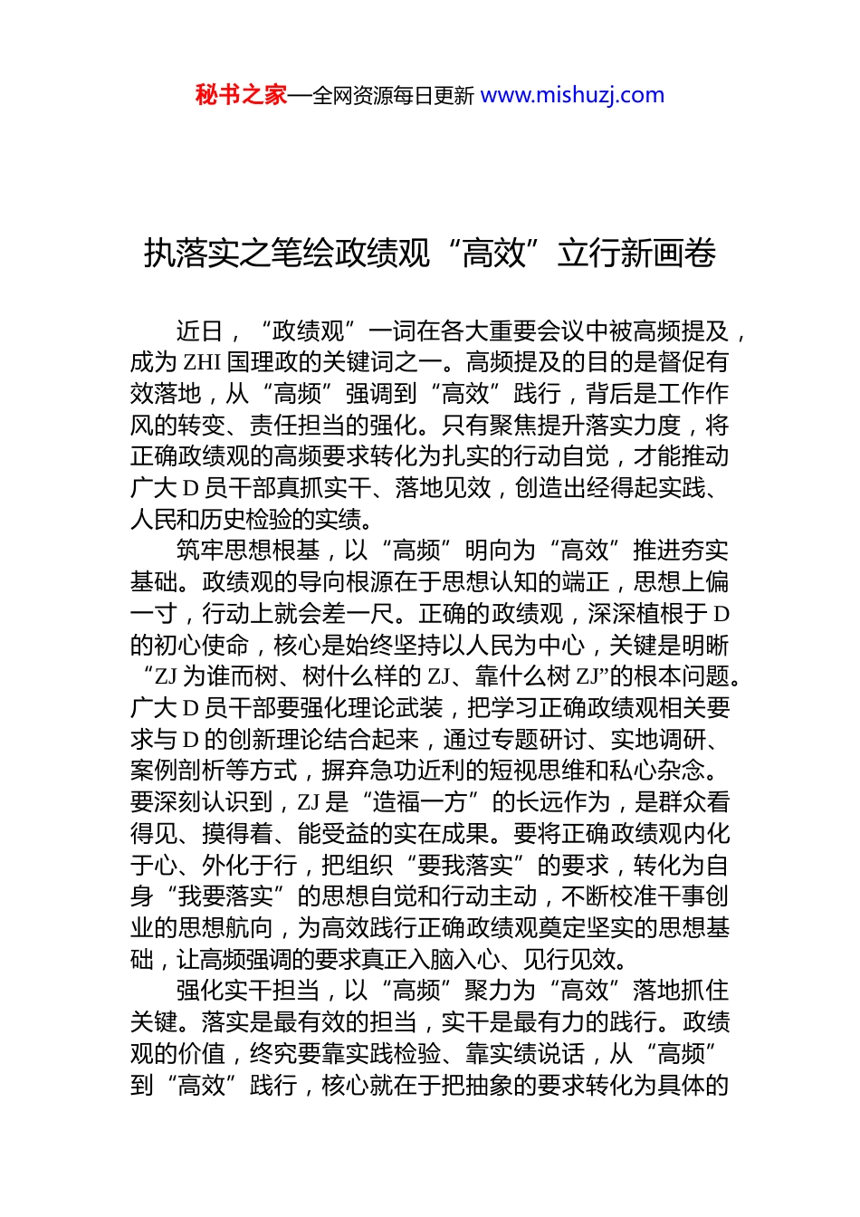 秘书之家—全网资源每日更新 www.mishuzj.com学习树立和践行正确政绩观精神心得体会材料汇编(19 篇)目录1.执落实之笔绘政绩观“高效”立行新画卷............................22.加强政绩观教育助推“十五五”高质量发展......................53.校准政绩观“航向标”引领高质量发展新征程..................84.校准政绩观“航标”凝聚干部奋进“向心力”................125.树立和践行正确政绩观奋楫“十五五”新程....................166.骐骥驰骋启新程以正确政绩观奋进“十五五”................197.知民情解民忧聚民心树立和践行正确政绩观....................228.树立和践行正确政绩观为“十五五”助力护航................259.深耕基层沃土以正确政绩观书写民生答卷........................2810.“破立之间”执笔答好政绩观“时代考卷”....................3111.基层 D 员干部坚持“三导向”扶正“政绩观”..............3512.践行“三功”答好政绩观“三问”..................................3813.读懂政绩观“三”字诀“八”字言..................................4114.树牢造福人民的政绩观......................................................4415.“笔画”之间绘好政绩观“最美画卷”............................4616.以正确政绩观引领城市发展..............................................4917.以正确政绩观书写“十五五”发展新篇..........................5118.常叩政绩观“三问”走好为民新征程..............................5419.校准政绩观之“尺”走好“十五五”奋进之路..............57秘书之家—全网资源每日更新 www.mishuzj.com执落实之笔绘政绩观“高效”立行新画卷近日,“政绩观”一词在各大重要会议中被高频提及,成为 ZHI 国理政的关键词之一。高频提及的目的是督促有效落地,从“高频”强调到“高效”践行,背后是工作作风的转变、责任担当的强化。只有聚焦提升落实力度,将正确政绩观的高频要求转化为扎实的行动自觉,才能推动广大 D 员干部真抓实干、落地见效,创造出经得起实践、人民和历史检验的实绩。筑牢思想根基,以“高频”明向为“高效”推进夯实基础。政绩观的导向根源在于思想认知的端正,思想上偏一寸,行动上就会差一尺。正确的政绩观,深深植根于 D的初心使命,核心是始终坚持以人民为中心,关键是明晰“ZJ 为谁而树、树什么样的 ZJ、靠什么树 ZJ”的根本问题。广大 D 员干部要强化理论武装,把学习正确政绩观相关要求与 D 的创新理论结合起来,通过专题研讨、实地调研、案例剖析等方式,摒弃急功近利的短视思维和私心杂念。要深刻认识到,ZJ 是“造福一方”的长远作为,是群众看得见、摸得着、能受益的实在成果。要将正确政绩观内化于心、外化于行,把组织“要我落实”的要求,转化为自身“我要落实”的思想自觉和行动主动,不断校准干事创业的思想航向,为高效践行正确政绩观奠定坚实的思想基础,让高频强调的要求真正入脑入心、见行见效。强化实干担当,以“高频”聚力为“高效”落地抓住关键。落实是最有效的担当,实干是最有力的践行。政绩观的价值,终究要靠实践检验、靠实绩说话,从“高频”到“高效”践行,核心就在于把抽象的要求转化为具体的秘书之家—全网资源每日更新 www.mishuzj.com行动,把宏伟的蓝图转化为实在的成果。D 员干部要坚持实事求是,立足本地本部门发展实际和客观规律,深入基层摸清实情、倾听民意,不做脱离实际的决策、不搞劳民伤财的工程。要发扬钉钉子精神,涵养“时不我待、只争朝夕”的紧迫感和“踏石留印、抓铁有痕”的执行力,对当务之急立说立行、紧抓快办,不拖延、不推诿;对长期任务保持定力、久久为功,不浮躁、不急躁。要以“功成不必在我”的精神境界和“功成必定有我”的历史担当,聚焦群众急难愁盼问题,一件一件抓落实、一项一项求突破把每一项部署落到具体岗位、具体人员,做出实效、做出质量,让高效落实成为干事创业的鲜明底色,让正确政绩观在实干中落地生根。健全制度保障,以“高频”护航为“高效”致远提供支撑。高效践行正确政绩观...