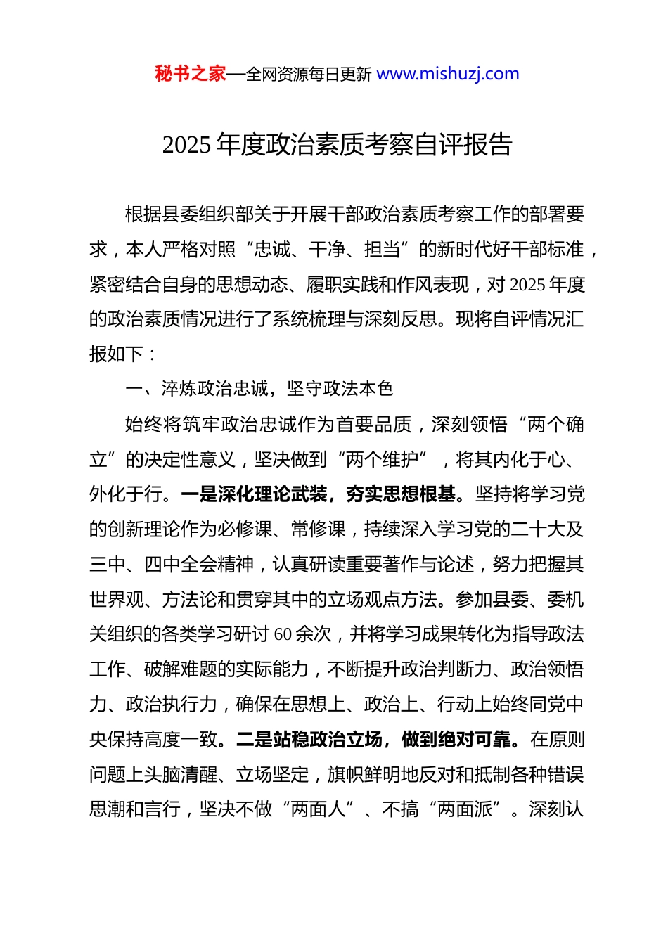 秘书之家—全网资源每日更新 www.mishuzj.com2025 年度政治素质考察自评报告根据县委组织部关于开展干部政治素质考察工作的部署要求,本人严格对照“忠诚、干净、担当”的新时代好干部标准,紧密结合自身的思想动态、履职实践和作风表现,对 2025 年度的政治素质情况进行了系统梳理与深刻反思。现将自评情况汇报如下:一、淬炼政治忠诚,坚守政法本色始终将筑牢政治忠诚作为首要品质,深刻领悟“两个确立”的决定性意义,坚决做到“两个维护”,将其内化于心、外化于行。一是深化理论武装,夯实思想根基。坚持将学习党的创新理论作为必修课、常修课,持续深入学习党的二十大及三中、四中全会精神,认真研读重要著作与论述,努力把握其世界观、方法论和贯穿其中的立场观点方法。参加县委、委机关组织的各类学习研讨 60 余次,并将学习成果转化为指导政法工作、破解难题的实际能力,不断提升政治判断力、政治领悟力、政治执行力,确保在思想上、政治上、行动上始终同党中央保持高度一致。二是站稳政治立场,做到绝对可靠。在原则问题上头脑清醒、立场坚定,旗帜鲜明地反对和抵制各种错误思潮和言行,坚决不做“两面人”、不搞“两面派”。深刻认秘书之家—全网资源每日更新 www.mishuzj.com识到坚持党的绝对领导是政法工作始终沿着正确方向前进的根本保证,自觉将党的领导贯穿于政法工作的全过程、各方面。三是确保执行有力,贯彻决策部署。对中央、省委、市委及县委的各项决策部署,特别是关于政法工作的指示要求,能够第一时间学习领会,结合分管工作,制定切实可行的落实方案,确保政令畅通、执行到位。在工作中坚持从政治上看、从法治上办,确保上级精神在政法系统不折不扣落地见效。二、坚守政治底线,永葆清廉本色始终视清正廉洁为生命线,时刻绷紧纪律规矩之弦,做到心有所畏、言有所戒、行有所止。一是严明纪律规矩,强化自我约束。带头尊崇党章,严格遵守党的政治纪律、组织纪律、廉洁纪律、群众纪律、工作纪律、生活纪律,以及 zybxgd 及其实施细则精神,查摆整改自身存在问题 6 个。主动学习政法工作相关法律法规和纪律要求,自觉净化社交圈、生活圈、朋友圈,坚决抵制各种诱惑。二是规范权力行使,坚持依法履职。牢固树立法治思维,严格依照法定权限、规则、程序办事。在参与案件协调、执法监督、社会治理等工作中,始终坚持客观公正,自觉主动接受党内监督、法律监督、群众监督和舆论监督,确保权力在阳光下运行。三是砥砺道德操守,树立良好形象。注重个人品德修养,弘扬忠诚老实、公道正派、实事求是、秘书之家—全网资源每日更新 www.mishuzj.com清正廉洁的价值观。严格约束自身言行,加强对家属和身边工作人员的教育提醒,努力维护政法委干部遵纪守法、作风严谨、廉洁自律的良好形象。三、强化政治担当,履职尽责有为始终将敢于担当、善于作为视为职责所系、使命所在,努力在维护稳定、服务发展中体现政治责任。一是聚焦主责主业,服务发展大局。自觉将政法工作融入全县中心工作来谋划推进,紧紧围绕高质量发展和国家安全、社会安定、人民安宁的目标,在推进更高水平平安 XX、法治 XX 建设中积极作为。积极参与防范化解重大风险、矛盾纠纷排查化解、社会治安综合治理等重点工作,努力为县域经济社会发展创造安全稳定的社会环境、公平正义的法治环境。二是践行根本宗旨,厚植为民情怀。牢固树立以人民为中心的发展思想,坚持和发展新时代“枫桥经验”,深入基层一线开展调查 24 次,倾听群众诉求,了解社情民意,推动解决群众在执法司法领域反映的“急难愁盼”问题18 个。三是发扬斗争精神,维护安全稳定。面对政法工作中的复杂局面和风险挑战,敢于亮剑、勇于负责。增强忧患意识和底线思维,提高对 ZZ 安全风险、社会矛盾风险、公共安全风险等的预见、研判和处置能力,坚决同危害 GJ 安全、社会稳定的行为作斗争,切实筑牢安全稳定屏障。秘书之家—全网资源每日更新 www.mishuzj.com四、提升政治能力,适应时代要求始终将提升与履职相匹配的政治能力作为关键支撑,在学习和实践中不断增强本领。一是提升政治判断能力。善于从政治上看问题,...