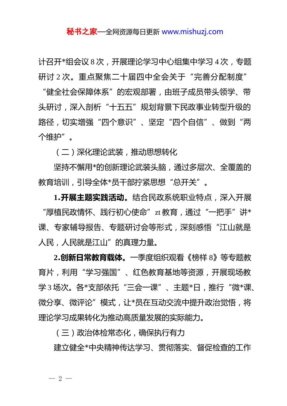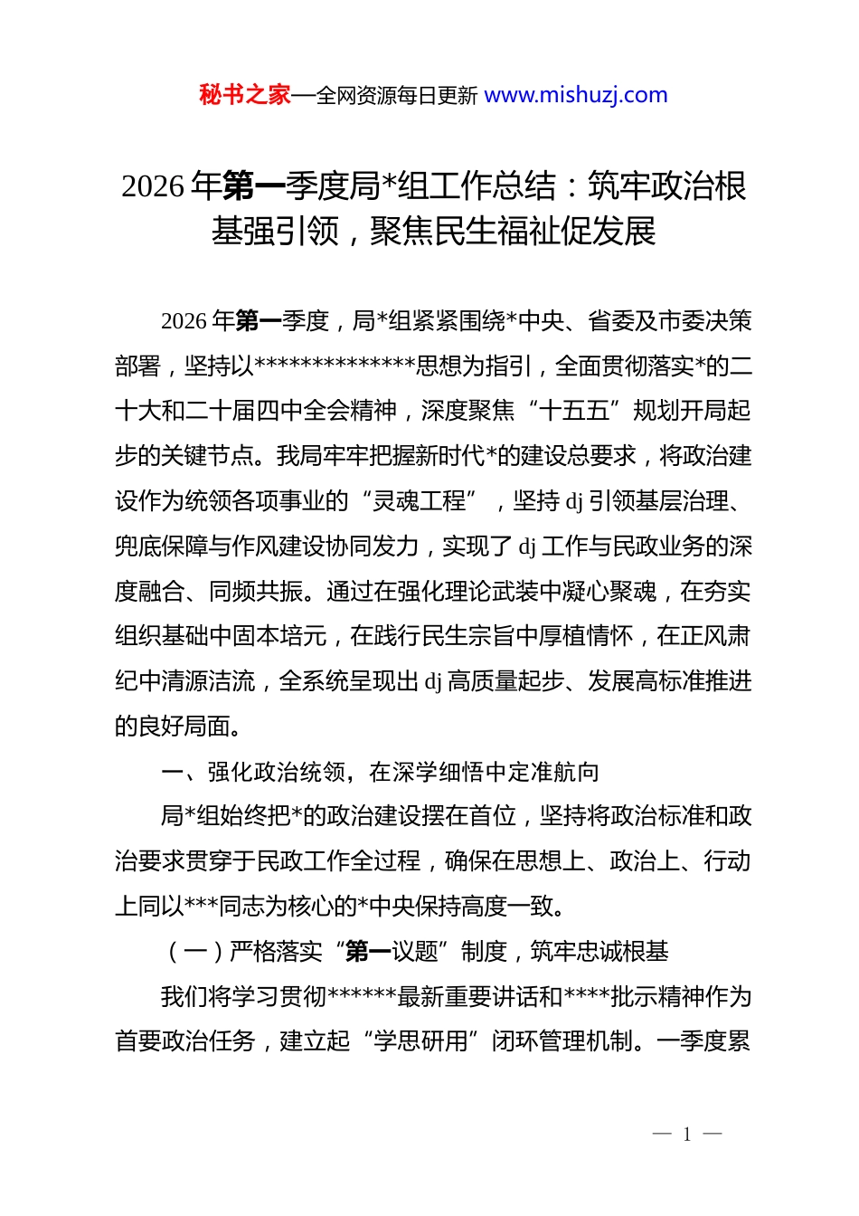秘书之家—全网资源每日更新 www.mishuzj.com2026 年第一季度局*组工作总结:筑牢政治根基强引领,聚焦民生福祉促发展2026 年第一季度,局*组紧紧围绕*中央、省委及市委决策部署,坚持以**************思想为指引,全面贯彻落实*的二十大和二十届四中全会精神,深度聚焦“十五五”规划开局起步的关键节点。我局牢牢把握新时代*的建设总要求,将政治建设作为统领各项事业的“灵魂工程”,坚持 dj 引领基层治理、兜底保障与作风建设协同发力,实现了 dj 工作与民政业务的深度融合、同频共振。通过在强化理论武装中凝心聚魂,在夯实组织基础中固本培元,在践行民生宗旨中厚植情怀,在正风肃纪中清源洁流,全系统呈现出 dj 高质量起步、发展高标准推进的良好局面。一、强化政治统领,在深学细悟中定准航向局*组始终把*的政治建设摆在首位,坚持将政治标准和政治要求贯穿于民政工作全过程,确保在思想上、政治上、行动上同以***同志为核心的*中央保持高度一致。(一)严格落实“第一议题”制度,筑牢忠诚根基我们将学习贯彻******最新重要讲话和****批示精神作为首要政治任务,建立起“学思研用”闭环管理机制。一季度累— 1 —秘书之家—全网资源每日更新 www.mishuzj.com计召开*组会议 8 次,开展理论学习中心组集中学习 4 次,专题研讨 2 次。重点聚焦二十届四中全会关于“完善分配制度”“健全社会保障体系”的宏观部署,由班子成员带头领学、带头研讨,深入剖析“十五五”规划背景下民政事业转型升级的路径,切实增强“四个意识”、坚定“四个自信”、做到“两个维护”。(二)深化理论武装,推动思想转化坚持不懈用*的创新理论武装头脑,通过多层次、全覆盖的教育培训,引导全体*员干部拧紧思想“总开关”。1.开展主题实践活动。结合民政系统职业特点,深入开展“厚植民政情怀、践行初心使命”zt 教育,通过“一把手”讲*课、专家辅导报告、专题研讨会等形式,深刻感悟“江山就是人民,人民就是江山”的真理力量。2.创新日常教育载体。一季度组织观看《榜样 8》等专题教育片,利用“学习强国”、红色教育基地等资源,开展现场教学 3 场次。各*支部依托“三会一课”、主题*日,推行“微*课、微分享、微评论”模式,让*员在互动交流中提升政治觉悟,将理论学习成果转化为推动高质量发展的实际能力。(三)政治体检常态化,确保执行有力建立健全*中央精神传达学习、贯彻落实、督促检查的工作— 2 —秘书之家—全网资源每日更新 www.mishuzj.com机制。针对上级重大决策部署,局*组实行清单化管理、挂图式作战,确保每一项政治要求都能落地生根。一季度对上年度民主生活会整改落实情况进行了“回头看”,通过自查自纠和民主评议,进一步巩固了风清气正的政治生态,确保局*组在重大考验面前方向不偏、定力不移。二、夯实组织根基,在固本培元中锻造堡垒局*组坚持大抓基层的鲜明导向,以提升组织力为重点,突出政治功能,努力将每一个基层*组织都打造成坚强的战斗堡垒。(一)推进*支部标准化规范化建设严格对标《中国共产*支部工作条例(试行)》,持续开展支部建设提质增效行动。1.精准排查整顿。对下属 6 个*支部开展了全方位、全过程的督导调研,建立健全“支部体检档案”。针对部分支部存在的议事规则不严、组织生活流于形式等短板,实行挂牌督办,由*组成员联点指导,确保整改到位、不留死角。2.阵地功能升级。一季度对 2 个支部*员活动室进行了优化改造,补齐了硬件设施,规范了制度展板,营造出浓厚的政治氛围,使*组织阵地真正成为凝聚人心、展示形象的窗口。(二)激发*员队伍活力,壮大先锋力量坚持抓好后继有人这个根本大计,严把质量关,优化*员队— 3 —秘书之家—全网资源每日更新 www.mishuzj.com伍结构。1.严把“入口关”。一季度新确定入*积极分子 3 名,重点考察其政治立场和业务能力;接收预备*员 2 名,涵盖了社会救助和养老服务一线关键岗位,有效壮大了骨干力量。2.搭建“先锋台”。全面推行*员承诺制和目标管理。设立“*员先锋岗”12 个,组建“民政先锋”志愿服务队 3 支。在社会治理、抗洪抢险预演、特殊群体排查等急...